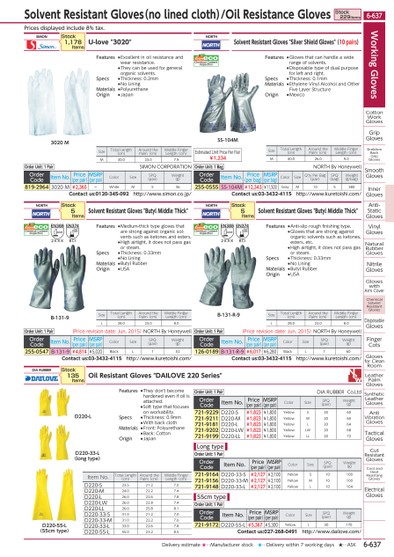 PRICESDISPLAYEDINCLUDE8%TAX.SIZETOTALLENGTH(CM)AROUNDTHEPALM(CM)MIDDLEFINGERLENGTH(CM)M40.026.09.0SIZETOTALLENGTH(CM)AROUNDTHEPALM(CM)MIDDLEFINGERLENGTH(CM)M30.023.07.9ESTIMATEDUNITPRICEPERPAIR¥1,234SS-104MSIZETOTALLENGTH(CM)AROUNDTHEPALM(CM)MIDDLEFINGERLENGTH(CM)L28.023.08.0B-131-9SIZETOTALLENGTH(CM)AROUNDTHEPALM(CM)MIDDLEFINGERLENGTH(CM)L28.023.08.0B-131-R-93020MITEMNO.TOTALLENGTH(CM)AROUNDTHEPALM(CM)MIDDLEFINGERLENGTH(CM)D220-S23.521.27.0D220-M24.022.27.4D220-L26.022.67.8D220-LW26.022.87.4D220-LL26.025.88.1D220-33-S31.021.27.0D220-33-M31.022.27.6D220-33-L33.022.67.8D220-55-L55.023.28.5D220-LD220-33-L(LONGTYPE)D220-55-L(55CMTYPE)2XXXBCI2XXXBCISIMONU-LOVE"3020"STOCK1,178ITEMSORDERUNIT:1PAIRSIMONCORPORATIONORDERCODEITEMNO.PRICE(PERPAIR)MSRP(PERPAIR)COLORSIZESPQ(PAIR)WEIGHT(G)819-29643020M¥2,365-WHITEM536CONTACTUS:0120-345-092HTTP://WWW.SIMON.CO.JP/NORTHSOLVENTRESISTANTGLOVES"BUTYLMIDDLETHICK"ORDERCODEITEMNO.PRICE(PERPAIR)MSRP(PERPAIR)COLORSIZESPQ(PAIR)WEIGHT(G)255-0547B-131-9¥4,814¥5,020BLACKL152CONTACTUS:03-3432-4115HTTP://WWW.KURETOISHI.COM/STOCK5ITEMSORDERUNIT:1PAIR(PRICEREVISIONDATE:JUN,2015)NORTHBYHONEYWELLDIARUBBEROILRESISTANTGLOVES"DAILOVE220SERIES"STOCK135ITEMSORDERUNIT:1PAIRDIARUBBERCO.LTDORDERCODEITEMNO.PRICE(PERPAIR)MSRP(PERPAIR)COLORSIZESPQ(PAIR)WEIGHT(G)721-9229D220-S¥1,823¥1,800YELLOWS2060721-9211D220-M¥1,823¥1,800YELLOWM2060721-9181D220-L¥1,823¥1,800YELLOWL2064721-9202D220-LW¥1,823¥1,800YELLOWLW2068721-9199D220-LL¥1,823¥1,800YELLOWLL2072ORDERUNIT:1PAIRORDERCODEITEMNO.PRICE(PERPAIR)MSRP(PERPAIR)COLORSIZESPQ(PAIR)WEIGHT(G)721-9172D220-55-L¥5,367¥5,300YELLOWL30170CONTACTUS:027-268-0491HTTP://WWW.DAILOVE.COM/ORDERUNIT:1PAIRORDERCODEITEMNO.PRICE(PERPAIR)MSRP(PERPAIR)COLORSIZESPQ(PAIR)WEIGHT(G)721-9164D220-33-S¥2,127¥2,100YELLOWS10100721-9156D220-33-M¥2,127¥2,100YELLOWM10100721-9148D220-33-L¥2,127¥2,100YELLOWL10104FEATURES●EXCELLENTINOILRESISTANCEANDWEARRESISTANCE.●THEYCANBEUSEDFORGENERALORGANICSOLVENTS.SPECS●THICKNESS:0.2MM●NOLININGMATERIALS●POLYURETHANEORIGIN●JAPANCHEMICALCONTENTINSPECTION.COMECOFEATURES●MEDIUM-THICKTYPEGLOVESTHATARESTRONGAGAINSTORGANICSOL-VENTSSUCHASKETONESANDESTERS.●HIGHAIRTIGHT,ITDOESNOTPASSGASORSTEAM.SPECS●THICKNESS:0.33MM●NOLININGMATERIALS●BUTYLRUBBERORIGIN●USAFEATURES●THEYDON'TBECOMEHARDENEDEVENIFOILISATTACHED.●SOFTTYPETHATFOCUSESONWORKABILITY.SPECS●THICKNESS:0.9MM●WITHBACKCLOTHMATERIALS●FRONT:POLYURETHANE●BACK:COTTONORIGIN●JAPANLONGTYPE55CMTYPENORTHSOLVENTRESISTANTGLOVES"SILVERSHIELDGLOVES"(10PAIRS)ORDERCODEITEMNO.PRICE(PERBAG)MSRP(PERBAG)COLORSIZEQ'TYPERBAG(PAIR)SPQ(BAG)WEIGHT(G/BAG)255-0555SS-104M¥12,343¥11,500GRAYM105380CONTACTUS:03-3432-4115HTTP://WWW.KURETOISHI.COM/ORDERUNIT:1BAGNORTHBYHONEYWELLNORTHSOLVENTRESISTANTGLOVES"BUTYLMIDDLETHICK"ORDERCODEITEMNO.PRICE(PERPAIR)MSRP(PERPAIR)COLORSIZESPQ(PAIR)WEIGHT(G)126-0189B-131-R-9¥6,017¥6,280BLACKL160CONTACTUS:03-3432-4115HTTP://WWW.KURETOISHI.COM/STOCK5ITEMSORDERUNIT:1PAIR(PRICEREVISIONDATE:JUN,2015)NORTHBYHONEYWELLCHEMICALCONTENTINSPECTION.COMECOFEATURES●GLOVESTHATCANHANDLEAWIDERANGEOFSOLVENTS.●DISPOSABLETYPEOFDUALPURPOSEFORLEFTANDRIGHT.SPECS●THICKNESS:0.1MMMATERIALS●ETHYLENEVINYLALCOHOLANDOTHERFIVELAYERSTRUCTUREORIGIN●MEXICOCHEMICALCONTENTINSPECTION.COMECOFEATURES●ANTI-SLIPROUGHFINISHINGTYPE.●GLOVESTHATARESTRONGAGAINSTORGANICSOLVENTSSUCHASKETONES,ESTERS,ETC.●HIGHAIRTIGHT,ITDOESNOTPASSGASORSTEAM.SPECS●THICKNESS:0.33MM●NOLININGMATERIALS●BUTYLRUBBERORIGIN●USAWORKINGGLOVESCOTTONWORKGLOVESGRIPGLOVESSKELETONBACKGRIPGLOVESSMOOTHGLOVESINNERGLOVESANTI-STATICGLOVESVINYLGLOVESNATURALRUBBERGLOVESNITRILEGLOVESGLOVESWITHARMCOVERCHEMICALSOLVENTRESISTANTGLOVESDISPOSABLEGLOVESFINGERCOTSGLOVESFORCLEANROOMLEATHERPALMGLOVESSYNTHETICLEATHERGLOVESANTIVIBRATIONGLOVESTACTICALGLOVESCUTRESISTANTGLOVESCOOLANDHEATRESISTANGGLOVESELECTRICALGLOVESSOLVENTRESISTANTGLOVES(NOLINEDCLOTH)/OILRESISTANCEGLOVESSTOCK229ITEMS6-637*0404380*6-637DELIVERYESTIMATE★…MANUFACTURERSTOCK★…DELIVERYWITHIN7WORKINGDAYS★…ASK