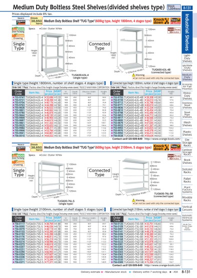 PRICESDISPLAYEDINCLUDE8%TAX.HEIGHT2102MMHEIGHT2102MMHEIGHT1802MMHEIGHT1802MMTUG600-76L-5(SINGLETYPE)TUG600-76L-5B(CONNECTEDTYPE)EFFECTIVEWIDTHWIDTH120MM440MM440MM436MM446MM100MM40MM40MM40MMDEPTH120MM446MM440MM440MM436MM100MM40MM40MM40MMDEPTHEFFECTIVEWIDTHTUG600-63L-4(SINGLETYPE)DEPTHEFFECTIVEWIDTHWIDTH120MM506MM100MM40MM496MM500MM40MMTUG600-63L-4B(CONNECTEDTYPE)DEPTHEFFECTIVEWIDTH120MM506MM500MM496MM100MM40MM40MMREQUIRE2PERSONS40MINUTESREQUIRE2PERSONS30MINUTESTRUSCOMEDIUMDUTYBOLTLESSSHELF"TUGTYPE"(600KGTYPE,HEIGHT2100MM,5STAGESTYPE)HEAVYCAUTIONORDERCODEITEMNO.PRICE(PERPIECE)MSRP(PERPIECE)W(MM)DEPTH(MM)EFFECTIVEWIDTH(MM)WEIGHT(KG)★756-0117TUG600-73S-5¥38,769¥41,88090045083769.7★756-0095TUG600-73L-5¥46,036¥49,73090060083781.8★756-0079TUG600-73J-5¥48,118¥51,98090075083785.4★756-0133TUG600-73Z-5¥53,395¥57,68090090083795.8★756-0192TUG600-74S-5¥43,398¥46,8801200450113788.4★756-0176TUG600-74L-5¥48,813¥52,7301200600113797.0★756-0150TUG600-74J-5¥56,218¥60,73012007501137112.2★756-0214TUG600-74Z-5¥58,996¥63,73012009001137113.3★756-0273TUG600-75S-5¥48,618¥52,52015004501437102.3★756-0257TUG600-75L-5¥53,340¥57,62015006001437112.2★756-0231TUG600-75J-5¥61,718¥66,67015007501437130.5★756-0290TUG600-75Z-5¥66,993¥72,37015009001437131.1★756-0354TUG600-76S-5¥57,607¥62,23018004501737136.4★756-0338TUG600-76L-5¥64,689¥69,88018006001737140.8★756-0311TUG600-76J-5¥73,344¥79,23018007501737149.1★756-0371TUG600-76Z-5¥77,371¥83,58018009001737148.9TRUSCOMEDIUMDUTYBOLTLESSSHELF"TUGTYPE"(600KGTYPE,HEIGHT1800MM,4STAGESTYPE)HEAVYCAUTIONORDERCODEITEMNO.PRICE(PERPIECE)MSRP(PERPIECE)W(MM)DEPTH(MM)EFFECTIVEWIDTH(MM)WEIGHT(KG)★755-9747TUG600-63S-4¥32,696¥35,32090045083758.5★755-9721TUG600-63L-4¥38,398¥41,48090060083768.1★755-9704TUG600-63J-4¥40,176¥43,40090075083770.9★755-9763TUG600-63Z-4¥44,398¥47,96090090083779.1★755-9828TUG600-64S-4¥36,622¥39,5601200450113774.0★755-9801TUG600-64L-4¥40,842¥44,1201200600113780.8★755-9780TUG600-64J-4¥46,878¥50,6401200750113792.9★755-9844TUG600-64Z-4¥49,100¥53,0401200900113793.6★755-9909TUG600-65S-4¥40,954¥44,2401500450143785.7★755-9887TUG600-65L-4¥44,619¥48,2001500600143793.5★755-9861TUG600-65J-4¥51,433¥55,56015007501437108.1★755-9925TUG600-65Z-4¥55,653¥60,12015009001437108.4★755-9984TUG600-66S-4¥48,211¥52,08018004501737113.6★755-9968TUG600-66L-4¥53,766¥58,08018006001737116.9★755-9941TUG600-66J-4¥60,801¥65,68018007501737123.5★756-0010TUG600-66Z-4¥64,022¥69,16018009001737123.2STOCK38,650ITEMSSTOCK38,650ITEMSORDERUNIT:1PIECEFACTORYDIRECTNOFREIGHTCHARGEEXCLUDINGREMOTEISLANDSTRUSCONAKAYAMACORPORATIONORDERUNIT:1PIECEFACTORYDIRECTNOFREIGHTCHARGEEXCLUDINGREMOTEISLANDSTRUSCONAKAYAMACORPORATIONGREENPURCHASING.COMECODRAWING.COMSINGLETYPE(HEIGHT2100MM,NUMBEROFSHELFSTAGES5STAGESTYPE)●CANNOTBEUSEDWITHONLYTHECONNECTEDTYPE.WARNINGGREENPURCHASING.COMECODRAWING.COMSINGLETYPE(HEIGHT1800MM,NUMBEROFSHELFSTAGES4STAGESTYPE)●CANNOTBEUSEDWITHONLYTHECONNECTEDTYPE.WARNINGSPECS●COLOR:OYSTERWHITESPECS●COLOR:OYSTERWHITEORDERCODEITEMNO.PRICE(PERPIECE)MSRP(PERPIECE)WEIGHT(KG)★756-0125TUG600-73S-5B¥33,751¥36,46057.5★756-0109TUG600-73L-5B¥41,018¥44,31069.6★756-0087TUG600-73J-5B¥43,102¥46,56073.2★756-0141TUG600-73Z-5B¥48,378¥52,26083.6★756-0206TUG600-74S-5B¥38,380¥41,46076.2★756-0184TUG600-74L-5B¥43,795¥47,31084.8★756-0168TUG600-74J-5B¥51,202¥55,310100.0★756-0222TUG600-74Z-5B¥53,978¥58,310101.1★756-0281TUG600-75S-5B¥43,601¥47,10090.1★756-0265TUG600-75L-5B¥48,322¥52,200100.0★756-0249TUG600-75J-5B¥56,700¥61,250118.3★756-0303TUG600-75Z-5B¥61,977¥66,950118.9★756-0362TUG600-76S-5B¥52,590¥56,810124.2★756-0346TUG600-76L-5B¥59,671¥64,460128.6★756-0320TUG600-76J-5B¥68,327¥73,810136.8★756-0389TUG600-76Z-5B¥72,354¥78,160136.7CONTACTUS:0120-509-849HTTP://WWW.ORANGE-BOOK.COM/ORDERCODEITEMNO.PRICE(PERPIECE)MSRP(PERPIECE)WEIGHT(KG)★755-9755TUG600-63S-4B¥28,308¥30,58048.1★755-9739TUG600-63L-4B¥34,010¥36,74057.6★755-9712TUG600-63J-4B¥35,788¥38,66060.4★755-9771TUG600-63Z-4B¥40,010¥43,22068.6★755-9836TUG600-64S-4B¥32,234¥34,82063.6★755-9810TUG600-64L-4B¥36,454¥39,38070.4★755-9798TUG600-64J-4B¥42,490¥45,90082.4★755-9852TUG600-64Z-4B¥44,712¥48,30083.2★755-9917TUG600-65S-4B¥36,566¥39,50075.3★755-9895TUG600-65L-4B¥40,231¥43,46083.1★755-9879TUG600-65J-4B¥47,045¥50,82097.6★755-9933TUG600-65Z-4B¥51,267¥55,38098.0★755-9992TUG600-66S-4B¥43,823¥47,340103.2★755-9976TUG600-66L-4B¥49,378¥53,340106.5★755-9950TUG600-66J-4B¥56,413¥60,940113.0★756-0028TUG600-66Z-4B¥59,634¥64,420112.8CONTACTUS:0120-509-849HTTP://WWW.ORANGE-BOOK.COM/ORDERUNIT:1PIECEFACTORYDIRECTNOFREIGHTCHARGEEXCLUDINGREMOTEISLANDSORDERUNIT:1PIECEFACTORYDIRECTNOFREIGHTCHARGEEXCLUDINGREMOTEISLANDSCONNECTEDTYPE(HEIGHT2100MM,NUMBEROFSHELFSTAGES5STAGESTYPE)CONNECTEDTYPE(HEIGHT1800MM,NUMBEROFSHELFSTAGES4STAGESTYPE)INDUSTRIALSHELVESLIGHT-DUTYSHELVESLIGHT/MIDDLE-DUTYSHELVESMEDIUM-DUTYSHELVESACCESSORIESFORFALLPREVENTIONHEAVY-DUTYSHELVESSTAINLESSSTEELSHELVESSTEELPIPESHELVESMESHSHELVESPLASTICSHELVESDIESTORAGERACKSCANTILEVERSTORAGERACKSBOOKSHELVESDEDICATEDRACKSPALLETRACKSPLANTFACTORYSYSTEMSMOVABLERACKSVERTICALCAROUSELSAUTOMATICWAREHOUSESYSTEMSMULTI-TIERSHELVES・SHAPESTEELSHELVESMEDIUMDUTYBOLTLESSSTEELSHELVES(DIVIDEDSHELVESTYPE)STOCK1,334ITEMS8-131*0501110*8-131DELIVERYESTIMATE★…MANUFACTURERSTOCK★…DELIVERYWITHIN7WORKINGDAYS★…ASKSINGLETYPESINGLETYPECONNECTEDTYPECONNECTEDTYPE