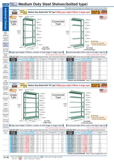 THENUMBERNEXTTOTHELOGOMARKINDICATESITEMSINSTOCKFOREACHBRAND.HEIGHT2100MMHEIGHT2100MMHEIGHT2100MMHEIGHT2100MMR3-7355(SINGLETYPE)R3-7355B(CONNECTEDTYPE)365MM460MM460MM460MM153MM40MM40MM40MM85MMEFFECTIVEWIDTHWIDTHR3-7456(SINGLETYPE)R3-7656B(CONNECTEDTYPE)305MM350MM350MM350MM350MM153MM40MM40MM40MM40MM85MMEFFECTIVEWIDTHWIDTH305MM350MM350MM350MM350MM153MM40MM40MM40MM40MM85MMEFFECTIVEWIDTH365MM460MM460MM460MM153MM40MM40MM40MM85MMEFFECTIVEWIDTHDEPTHDEPTHDEPTHDEPTHREQUIRE2PERSONS40MINUTESREQUIRE2PERSONS40MINUTES●CANNOTBEUSEDWITHONLYTHECONNECTEDTYPE.WARNINGTRUSCOMEDIUMDUTYBOLTEDSHELF"R3TYPE"(300KGTYPE,HEIGHT2100MM,5STAGESTYPE)HEAVYCAUTIONTRUSCOMEDIUMDUTYBOLTEDSHELF"R3TYPE"(300KGTYPE,HEIGHT2100MM,6STAGESTYPE)HEAVYCAUTIONORDERCODEITEMNO.PRICE(PERPIECE)MSRP(PERPIECE)W(MM)DEPTH(MM)EFFECTIVEWIDTH(MM)WEIGHT(KG)★504-7820R3-7356¥54,136¥58,48090045084259.7★504-7901R3-7366¥60,227¥65,06090060084271.0★504-7986R3-7396¥74,557¥80,54090087084293.3★504-7838R3-7456¥61,995¥66,9701200450114274.5★504-7919R3-7466¥69,058¥74,6001200600114283.9★504-7994R3-7496¥89,137¥96,29012008701142121.1★504-8087R3-7556¥67,410¥72,8201500450144288.2★504-8168R3-7566¥78,510¥84,8101500600144298.2★504-8249R3-7596¥98,718¥106,64015008701442145.9★504-8095R3-7656¥77,167¥83,36018004501742104.6★504-8176R3-7666¥87,166¥94,16018006001742118.0★504-8257R3-7696¥116,964¥126,35018008701742176.7ORDERCODEITEMNO.PRICE(PERPIECE)MSRP(PERPIECE)W(MM)DEPTH(MM)EFFECTIVEWIDTH(MM)WEIGHT(KG)★504-7781R3-7355¥50,368¥54,41090045084254.4★504-7862R3-7365¥55,479¥59,93090060084263.8★504-7943R3-7395¥67,531¥72,95090087084282.4★504-7790R3-7455¥57,107¥61,6901200450114267.0★504-7871R3-7465¥63,032¥68,0901200600114274.9★504-7951R3-7495¥79,880¥86,29012008701142106.0★504-8044R3-7555¥61,829¥66,7901500450144278.8★504-8125R3-7565¥71,114¥76,8201500600144287.2★504-8206R3-7595¥88,063¥95,13015008701442129.0★504-8052R3-7655¥70,169¥75,8001800450174292.8★504-8133R3-7665¥78,538¥84,84018006001742104.0★504-8214R3-7695¥103,476¥111,78018008701742153.0STOCK38,650ITEMSSTOCK38,650ITEMS(PRICEREVISIONDATE:JAN,2015)ORDERUNIT:1PIECEFACTORYDIRECTNOFREIGHTCHARGEEXCLUDINGREMOTEISLANDSTRUSCONAKAYAMACORPORATION(PRICEREVISIONDATE:JAN,2015)ORDERUNIT:1PIECEFACTORYDIRECTNOFREIGHTCHARGEEXCLUDINGREMOTEISLANDSTRUSCONAKAYAMACORPORATIONSINGLETYPE(HEIGHT2100MM,NUMBEROFSHELFSTAGES5STAGESTYPE)SINGLETYPE(HEIGHT2100MM,NUMBEROFSHELFSTAGES6STAGESTYPE)SPECS●COLOR:GREENSPECS●COLOR:GREEN●CANNOTBEUSEDWITHONLYTHECONNECTEDTYPE.WARNINGDRAWING.COMDRAWING.COMORDERCODEITEMNO.PRICE(PERPIECE)MSRP(PERPIECE)WEIGHT(KG)★504-7846R3-7356B¥47,267¥51,06045.7★504-7927R3-7366B¥53,275¥57,55060.1★504-8001R3-7396B¥67,327¥72,73082.1★504-7854R3-7456B¥55,135¥59,56063.7★504-7935R3-7466B¥62,115¥67,10073.0★504-8010R3-7496B¥81,917¥88,490109.4★504-8109R3-7556B¥60,551¥65,41072.0★504-8184R3-7566B¥71,567¥77,31081.9★504-8265R3-7596B¥91,488¥98,830134.9★504-8117R3-7656B¥70,308¥75,95093.8★504-8192R3-7666B¥80,222¥86,660107.3★504-8273R3-7696B¥109,734¥118,540165.7CONTACTUS:0120-509-849HTTP://WWW.ORANGE-BOOK.COM/ORDERCODEITEMNO.PRICE(PERPIECE)MSRP(PERPIECE)WEIGHT(KG)★504-7803R3-7355B¥43,499¥46,99040.4★504-7889R3-7365B¥48,535¥52,43052.9★504-7960R3-7395B¥60,301¥65,14071.2★504-7811R3-7455B¥50,248¥54,28056.2★504-7897R3-7465B¥56,089¥60,59064.0★504-7978R3-7495B¥72,641¥78,47094.3★504-8061R3-7555B¥54,969¥59,38062.6★504-8141R3-7565B¥64,170¥69,32070.9★504-8222R3-7595B¥80,834¥87,320116.0★504-8079R3-7655B¥63,310¥68,39082.0★504-8150R3-7665B¥71,594¥77,34093.3★504-8231R3-7695B¥96,246¥103,970142.0CONTACTUS:0120-509-849HTTP://WWW.ORANGE-BOOK.COM/(PRICEREVISIONDATE:JAN,2015)ORDERUNIT:1PIECEFACTORYDIRECTNOFREIGHTCHARGEEXCLUDINGREMOTEISLANDS(PRICEREVISIONDATE:JAN,2015)ORDERUNIT:1PIECEFACTORYDIRECTNOFREIGHTCHARGEEXCLUDINGREMOTEISLANDSCONNECTEDTYPE(HEIGHT2100MM,NUMBEROFSHELFSTAGES6STAGESTYPE)CONNECTEDTYPE(HEIGHT2100MM,NUMBEROFSHELFSTAGES5STAGESTYPE)INDUSTRIALSHELVESLIGHT-DUTYSHELVESLIGHT/MIDDLE-DUTYSHELVESMEDIUM-DUTYSHELVESACCESSORIESFORFALLPREVENTIONHEAVY-DUTYSHELVESSTAINLESSSTEELSHELVESSTEELPIPESHELVESMESHSHELVESPLASTICSHELVESDIESTORAGERACKSCANTILEVERSTORAGERACKSBOOKSHELVESDEDICATEDRACKSPALLETRACKSPLANTFACTORYSYSTEMSMOVABLERACKSVERTICALCAROUSELSAUTOMATICWAREHOUSESYSTEMSMULTI-TIERSHELVES・SHAPESTEELSHELVESSTOCK1,334ITEMSMEDIUMDUTYSTEELSHELVES(BOLTEDTYPE)8-140*0501200*8-140ORDERCODEYELLOW…INSTANTDELIVERY(JAPANONLY)BLUE…BACKORDER(CARRIAGEEXCLUDED)ITEMNO.PINK…STOCKININDONESIA/THAILANDSINGLETYPESINGLETYPECONNECTEDTYPECONNECTEDTYPE
