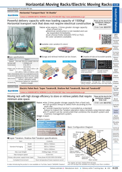 PRICESDISPLAYEDINCLUDE8%TAX.AVIDEOINTRODUCINGTHEPRODUCTISNOWAVAILABLEONYOUTUBE.SEARCH"SANSHINTANAKON".MOVINGRACKWITHHIGHSTORAGEEFFICIENCYTOSTOREORRETRIEVEPALLETSTHATREQUIREMINIMUMAISLESPACE.POWERFULDELIVERYCAPACITYWITHMAXLOADINGCAPACITYOF1500KG!HORIZONTALTRANSPORTRACKTHATDOESNOTREQUIREELECTRICALCONSTRUCTION.FEATURES●HAS2TIMESGREATERSTORAGECAPACITYTHANAFIXEDRACK.●ARICHPRODUCTLINEUPTOSELECTFROMACCORDINGTOTHEWORKSITE.●A"REMOTEINSPECTIONFUNCTION"ISPROVIDEDASASTANDARDFEATURETOINSPECTTHETANAKONOPERATIONSTATUSREMOTELYUSINGINTERNETCABLE.●ANITSYSTEMCANBECONSTRUCTEDTHATCOMBINESTHELOCATIONSYSTEMANDINVENTORYMANAGEMENTSYSTEM.ORIGIN●JAPANFEATURES●HASAPPROX.2TIMESGREATERSTORAGECAPACITYTHANAFIXEDRACK.●ELECTRICALCONSTRUCTIONISNOTNEEDEDANDCANBEEXPANDEDIMMEDIATELY.●CANCHOOSEFREELYBETWEENFIFOORFILO.●5COLORVARIATIONSAVAILABLE.PLEASEASKTHESTOREFORTHEMANUFACTURERCATALOGBY"ORDERCODE".▼ORDERCODE:800-9783THEREGULARRAILTYPE,SHALLOW(THIN)RAILTYPE,ANDNON-RAILTYPEAREAVAILABLEACCORDINGTOYOURFLOORCONDITION.4567RACKNUMBERCROSSOVERCABLEBLINKINGLIGHTAISLESWITCHFRAMESAFETYSENSORMOVINGALARMBUZZERAISLEENTRYDETECTIONSTOPORSPEEDREDUCTIONSENSORBASICCONFIGURATIONDIAGRAMOPTIONSYSTEMINVENTORYMANAGEMENTSYSTEMTANACONLINKAGESMARTTANACONSUPPORTFORSAFETY,SECURITYANDSTABLEOPERATIONREMOTEDIAGNOSTICSYSTEMITEMCONTENTSSTANDARDPACKAGINGWIDTH800TO1500MMDEPTH800TO1500MMHEIGHT500TO2000MMMAXLOADWEIGHT2500KG/STAGE,27T/LANEMAXTRANSPORTSPEED10.0M/MIN.PRIMARYSIDEPOWERSUPPLY(MOTORTYPE)THREEPHASEAC220/200V(50/60HZ)COMPLIANTENVIRONMENTROOMTEMPERATURE/FROZEN/EXPLOSIONPROOF●SUPERTANAKON,SHALLOWRAILTANAKONSPECIFICATIONS●BASICSPECIFICATIONS●STORAGEANDRETRIEVALMETHODCANBECHOSEN.●COMPATIBLEWITHTABLEANDHASEXCELLENTOPERABILITY.PLEASEASKTHESTOREFORTHEMANUFACTURERCATALOGBY"ORDERCODE".▼ORDERCODE:800-9791ITEMSPECSSPEED[NOLOAD]90M/MIN[LOADED]60M/MINMAXTRANSPORTWEIGHT1,500KG/UNITENVIRONMENTTEMPERATURE0TO45°CPALLETSIZE(MM)[SG1010]W1,000TOLESSTHAN1,300XD1,000TO1,200[SG1310]W1,300TO1,400XD1,000TO1,200PALLETCRITERIABENDING:20MMORLESS,DOUBLE-SIDEDFOUR-WAYENTRYPOWERSUPPLYMETHOD/TIMEMAINBODYPOWERSUPPLY:AC100V,6HOURSRECHARGESAFETYFUNCTIONEMERGENCYSTOPSWITCH,SAFETYSENSOR,OPERATIONLAMPSOLDSEPARATELYITEMWINDOWSTABLETFOROPERATION,BATTERYCHARGER●AVAILABLECOLORVARIATION(5COLORS)TABLETFOROPERATION(SOLDSEPARATELY)STORAGEQUANTITYSETTINGSCREENSHIPMENTQUANTITYSETTINGCOMPLETESTORAGEANDRETRIEVALSCREENAFTERPRESSINGTHESTOPBUTTONFIRST-IN/FIRST-OUTFIRST-IN/LATER-OUTVIDEOSANSHINMETALWORKINGHORIZONTALTRANSPORTRACK"AISHUTTLE"CONTACTUSSANSHINMETALWORKINGCO.LTD.:072-436-3301HTTP://WWW.SANSHINKINZOKU.CO.JP/SANSHINMETALWORKINGELECTRICPALLETRACK"SUPERTANAKONⅢ,SHALLOWRAILTANAKONⅢ,NON-RAILTANAKONⅢ"CONTACTUSSANSHINMETALWORKINGCO.LTD.:072-436-3301HTTP://WWW.SANSHINKINZOKU.CO.JP/INDUSTRIALSHELVESLIGHT-DUTYSHELVESLIGHT/MIDDLE-DUTYSHELVESMEDIUM-DUTYSHELVESACCESSORIESFORFALLPREVENTIONHEAVY-DUTYSHELVESSTAINLESSSTEELSHELVESSTEELPIPESHELVESMESHSHELVESPLASTICSHELVESDIESTORAGERACKSCANTILEVERSTORAGERACKSBOOKSHELVESDEDICATEDRACKSPALLETRACKSPLANTFACTORYSYSTEMSMOVABLERACKSVERTICALCAROUSELSAUTOMATICWAREHOUSESYSTEMSMULTI-TIERSHELVES・SHAPESTEELSHELVESHORIZONTALMOVINGRACKS/ELECTRICMOVINGRACKS8-225*0502041*8-225DELIVERYESTIMATE★…MANUFACTURERSTOCK★…DELIVERYWITHIN7WORKINGDAYS★…ASK