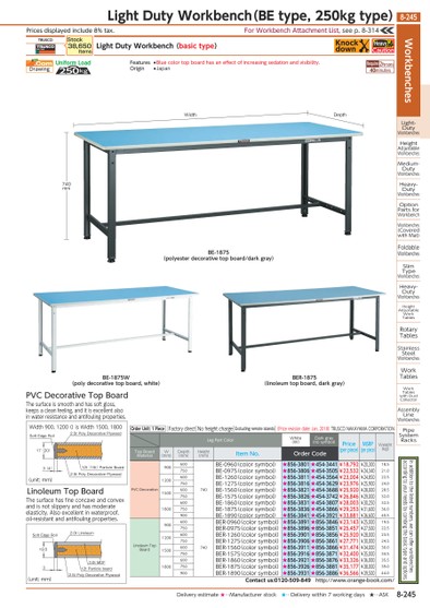 PRICESDISPLAYEDINCLUDE8%TAX.BE-1875(POLYESTERDECORATIVETOPBOARD/DARKGRAY)740MMWIDTHDEPTHFORWORKBENCHATTACHMENTLIST,SEEP.8-314BE-1875W(POLYDECORATIVETOPBOARD,WHITE)BER-1875(LINOLEUMTOPBOARD,DARKGRAY)32.5TPOLYDECORATIVEPLYWOOD2.0TLINOLEUM12TPARTICLEBOARD3.0TMDFSOFTEDGEROLL19.5(UNIT:MM)PVCDECORATIVETOPBOARDTHESURFACEISSMOOTHANDHASSOFTGLOSS,KEEPSACLEANFEELING,ANDITISEXCELLENTALSOINWATERRESISTANCEANDANTIFOULINGPROPERTIES.3(4)2.5TPOLYDECORATIVEPLYWOOD2.5TPOLYDECORATIVEPLYWOOD12T(15T)PARTICLEBOARDSOFTEDGEROLLWIDTH900,1200()ISWIDTH1500,180017(20)(UNIT:MM)LINOLEUMTOPBOARDTHESURFACEHASFINECONCAVEANDCONVEXANDISNOTSLIPPERYANDHASMODERATEELASTICITY.ALSOEXCELLENTINWATERPROOF,OIL-RESISTANTANDANTIFOULINGPROPERTIES.REQUIRE2PERSONS40MINUTESTRUSCOLIGHTDUTYWORKBENCH(BASICTYPE)HEAVYCAUTIONSTOCK38,650ITEMSCONTACTUS:0120-509-849HTTP://WWW.ORANGE-BOOK.COM/LEGPARTCOLORWHITE(W)DARKGRAY(NOSYMBOL)PRICE(PERPIECE)MSRP(PERPIECE)WEIGHT(KG)TOPBOARDMATERIALW(MM)DEPTH(MM)HEIGHT(MM)ITEMNO.ORDERCODEPVCDECORATION900600740BE-0960(COLORSYMBOL)★856-3801★454-3441¥18,792¥20,30018.5750BE-0975(COLORSYMBOL)★856-3806★454-3505¥22,532¥24,34021.01200600BE-1260(COLORSYMBOL)★856-3811★454-3564¥23,004¥24,85022.5750BE-1275(COLORSYMBOL)★856-3816★454-3629¥23,976¥25,90024.01500600BE-1560(COLORSYMBOL)★856-3821★454-3688¥25,920¥28,00028.5750BE-1575(COLORSYMBOL)★856-3826★454-3742¥26,846¥29,00032.01800600BE-1860(COLORSYMBOL)★856-3831★454-3807¥28,003¥30,25032.5750BE-1875(COLORSYMBOL)★856-3836★454-3866¥29,253¥31,60036.0900BE-1890(COLORSYMBOL)★856-3841★454-3921¥33,881¥36,60040.5LINOLEUMTOPBOARD900600740BER-0960(COLORSYMBOL)★856-3891★856-3846¥23,143¥25,00019.5750BER-0975(COLORSYMBOL)★856-3896★856-3851¥25,457¥27,50022.51200600BER-1260(COLORSYMBOL)★856-3901★856-3856¥25,920¥28,00023.5750BER-1275(COLORSYMBOL)★856-3906★856-3861¥27,771¥30,00024.51500600BER-1560(COLORSYMBOL)★856-3911★856-3866¥31,474¥34,00030.0750BER-1575(COLORSYMBOL)★856-3916★856-3871¥32,400¥35,00034.51800600BER-1860(COLORSYMBOL)★856-3921★856-3876¥33,326¥36,00035.5750BER-1875(COLORSYMBOL)★856-3926★856-3881¥35,177¥38,00039.0900BER-1890(COLORSYMBOL)★856-3931★856-3886¥36,566¥39,50044.0ORDERUNIT:1PIECEFACTORYDIRECTNOFREIGHTCHARGEEXCLUDINGREMOTEISLANDS(PRICEREVISIONDATE:JAN,2018)TRUSCONAKAYAMACORPORATIONDRAWING.COMFEATURES●BLUECOLORTOPBOARDHASANEFFECTOFINCREASINGSEDATIONANDVISIBILITY.ORIGIN●JAPANKGUNIFORMLOAD250WORKBENCHESLIGHT-DUTYWORKBENCHESHEIGHTADJUSTABLEWORKBENCHESMEDIUM-DUTYWORKBENCHESHEAVY-DUTYWORKBENCHESOPTIONPARTSFORWORKBENCHWORKBENCHES(COVEREDWITHMAT)FOLDABLEWORKBENCHESSLIMTYPEWORKBENCHESHEAVY-DUTYWORKBENCHESHEIGHTADJUSTABLEWORKTABLESROTARYTABLESSTAINLESSSTEELWORKBENCHESWORKTABLESWORKTABLESWITHDUSTCOLLECTORASSEMBLYLINEWORKBENCHESPIPESYSTEMRACKSLIGHTDUTYWORKBENCH(BETYPE,250KGTYPE)8-245*0502230*INADDITIONTOTHELISTEDNUMBERS,WECANOFFERWORKBENCHESACCORDINGTOYOURNEEDSBYCOMBINGTHEBASICTYPEANDOPTIONS.8-245DELIVERYESTIMATE★…MANUFACTURERSTOCK★…DELIVERYWITHIN7WORKINGDAYS★…ASK