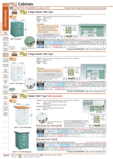 THENUMBERNEXTTOTHELOGOMARKINDICATESITEMSINSTOCKFOREACHBRAND.(SMALL)73(MEDIUM)148(LARGE)298(357)(395)487.54233535(SMALL)(45)(MEDIUM)(99)(LARGE)(149)DRAWERSDIMENSIONS()ISTHEINTERNALDIMENSIONCASTERANDADJUSTERAREATTACHED.WHITE(SMALL)73(MEDIUM)148(LARGE)298(357)(395)487.54233535(SMALL)(45)(MEDIUM)(99)(LARGE)(149)DRAWERSDIMENSIONS()ISTHEINTERNALDIMENSIONCASTERANDADJUSTERAREATTACHED.GREEN(SMALL)73(MEDIUM)148(LARGE)298(357)(395)487.54233535(SMALL)(45)(MEDIUM)(99)(LARGE)(149)DRAWERSDIMENSIONS()ISTHEINTERNALDIMENSIONCASTERANDADJUSTERAREATTACHED.UDCT-111-0175PGN(GREEN)UDCT-111-0175W(WHITE)COMPATIBLEMODELAETYPE,BETYPE,BOTYPE,DWTYPE,GWTYPE,HAETYPE,HWTYPE,LEWTYPE,UTTYPECOMPATIBLEMODELAETYPE,AEMTYPE,AEWTYPE,AWMTYPE,BETYPE,BOTYPE,DWTYPE,EWTYPE,GWTYPE,HAETYPE,HAEWTYPE,HWTYPE,LEWTYPE,TWTYPE,TWCTYPE,TWZTYPE,UTTYPECABINETUDC-111MAINBODYGWP-1875MAINBODYDW-18004STAGESCABINETUDCT-111-0175EXAMPLEEXAMPLEMAINBODYHAE-1800SIDECABINETUDC-111-01EXAMPLE450MM500MM620MM500MM750MM740MMUDC-111-01W(WHITE)450MM500MM710MMFORMAINBODYCOMPATIBILITYLIST,SEEP.8-314COMPATIBLEMODELAETYPE,AEMTYPE,AEWTYPE,AWMTYPE,BETYPE,BOTYPE,DWTYPE,EWTYPE,GWTYPE,HAETYPE,HAEWTYPE,HWTYPE,LEWTYPE,TWTYPE,TWCTYPE,TWZTYPE,UTTYPEUDC-111(GREEN)(UNIT:MM)(UNIT:MM)(UNIT:MM)TRUSCO3STAGECABINET"UDCTYPE"ORDERCODEITEMNO.PRICE(PERPIECE)MSRP(PERPIECE)COLORWXDXH(MM)DRAWERCOMBINATIONSPQ(PIECE)WEIGHT(KG)(SMALL)(MEDIUM)(LARGE)★467-3549UDC-111W¥61,680¥66,630WHITE450X500X620111123★240-1860UDC-111¥61,680¥66,630GREEN450X500X620111123CONTACTUS:0120-509-849HTTP://WWW.ORANGE-BOOK.COM/TRUSCO4STAGECABINET"UDCTYPE"ORDERCODEITEMNO.PRICE(PERPIECE)MSRP(PERPIECE)COLORWXDXH(MM)DRAWERCOMBINATIONSPQ(PIECE)WEIGHT(KG)(SMALL)(MEDIUM)(LARGE)★467-3531UDC-111-01W¥75,520¥81,580WHITE450X500X710211130★240-1886UDC-111-01¥75,520¥81,580GREEN450X500X710211130CONTACTUS:0120-509-849HTTP://WWW.ORANGE-BOOK.COM/TRUSCOCABINET"UDCTTYPE"(WITHTOPBOARD)ORDERCODEITEMNO.PRICE(PERPIECE)MSRP(PERPIECE)COLORWXDXH(MM)DRAWERCOMBINATIONSPQ(PIECE)WEIGHT(KG)(SMALL)(MEDIUM)(LARGE)★467-3565UDCT-111-0175PW¥87,267¥94,270WHITE500X750X740211138.5★467-3557UDCT-111-0175PGN¥87,267¥94,270GREEN500X750X740211138.5CONTACTUS:0120-509-849HTTP://WWW.ORANGE-BOOK.COM/ORDERCODEITEMNO.PRICE(PERPIECE)MSRP(PERPIECE)COLORWXDXH(MM)DRAWERCOMBINATIONSPQ(PIECE)WEIGHT(KG)(SMALL)(MEDIUM)(LARGE)★467-3573UDCT-111-0175W¥87,267¥94,270WHITE500X750X740211137.5★240-1924UDCT-111-0175¥87,267¥94,270GREEN500X750X740211137.5STOCK38,650ITEMSSTOCK38,650ITEMSSTOCK38,650ITEMSORDERUNIT:1PIECEFACTORYDIRECTNOFREIGHTCHARGEEXCLUDINGREMOTEISLANDS(PRICEREVISIONDATE:JAN,2018)TRUSCONAKAYAMACORPORATIONORDERUNIT:1PIECEFACTORYDIRECTNOFREIGHTCHARGEEXCLUDINGREMOTEISLANDS(PRICEREVISIONDATE:JAN,2018)ORDERUNIT:1PIECEFACTORYDIRECTNOFREIGHTCHARGEEXCLUDINGREMOTEISLANDS(PRICEREVISIONDATE:JAN,2018)TRUSCONAKAYAMACORPORATIONORDERUNIT:1PIECEFACTORYDIRECTNOFREIGHTCHARGEEXCLUDINGREMOTEISLANDS(PRICEREVISIONDATE:JAN,2018)TRUSCONAKAYAMACORPORATIONDRAWING.COMFEATURES●CANBEUSEDBYBEINGSTOREDATTHEBOTTOMOFTHEWORKBENCH.SPECS●WITHOUTKEYMATERIALS●STEELORIGIN●JAPANDRAWING.COMFEATURES●CANBEUSEDBYBEINGPLACEDTOTHESIDEOFTHEWORKBENCH.SPECS●WITHOUTKEYMATERIALS●STEELORIGIN●JAPANDRAWING.COMFEATURES●CANBEUSEDBYBEINGPLACEDTOTHESIDEOFTHEWORKBENCH.ITCANALSOBEUSEDASAAUXILIARYTABLE.SPECS●WITHOUTKEY●TOPBOARDEQUALLOADCAPACITY:80KGMATERIALS●BODY:STEEL●TOPBOARD:DAPDECORATIVEPANELORIGIN●JAPANTOPBOARDCOLOR:WOODGRAINTOPBOARDCOLOR:WHITE●CANNOTBEINSTALLEDONAWORKBENCHWITHADEPTHOF450,600MM.FORUT,HW,DWTYPE,ITISNECESSARYTOREPLACETHELOWERSHELFTOTHELOWERLANTERN(SEPARATE).WARNING●ONLYTHEHAETYPEWITHADEPTHOF750OR900MMCANBEPLACEDUNDERTHEWORKBENCH.WARNINGWORKBENCHESLIGHT-DUTYWORKBENCHESHEIGHTADJUSTABLEWORKBENCHESMEDIUM-DUTYWORKBENCHESHEAVY-DUTYWORKBENCHESOPTIONPARTSFORWORKBENCHWORKBENCHES(COVEREDWITHMAT)FOLDABLEWORKBENCHESSLIMTYPEWORKBENCHESHEAVY-DUTYWORKBENCHESHEIGHTADJUSTABLEWORKTABLESROTARYTABLESSTAINLESSSTEELWORKBENCHESWORKTABLESWORKTABLESWITHDUSTCOLLECTORASSEMBLYLINEWORKBENCHESPIPESYSTEMRACKSSTOCK17ITEMSCABINETS8-318*0502960*8-318ORDERCODEYELLOW…INSTANTDELIVERY(JAPANONLY)BLUE…BACKORDER(CARRIAGEEXCLUDED)ITEMNO.PINK…STOCKININDONESIA/THAILAND