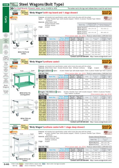 THENUMBERNEXTTOTHELOGOMARKINDICATESITEMSINSTOCKFOREACHBRAND.ITEMNO.DRAWERINTERNALDIMENSION(MM)WXLXDTOPBOARDDIMENSION(MM)WXDXTHICKNESSBDW-762TVBDW-962TV494X274X58750X500X22BDW-772TVBDW-972TV644X374X58900X600X22BDW-762TV-W(WHITE)762MM170.5MM230.5MM523MMDEPTHBDW-672U-YG(YOUNGGREEN)386MM673MM600MMWIDTHWIDTHDEPTHITEMNO.WXLXD(MM)BDW-963YU494X274X108BDW-973YU644X374X108DRAWERINTERNALDIMENSION880MMWIDTHDEPTHBDW-973YU-W(WHITE)150MM300MM673MMBDW-793U-W(WHITE)823MM230.5MM230.5MM740MMFORSHELFBOARDS,DRAWERS,MATS,SEEP.8-458TO459REQUIRE1PERSONS50MINUTESREQUIRE1PERSONS50MINUTESREQUIRE1PERSONS50MINUTESTRUSCO"BIRDYWAGON"(WITHTOPBOARDAND1STAGEDRAWER)ORDERCODEITEMNO.PRICE(PERPIECE)MSRP(PERPIECE)MAXLOADCAPACITY(KG/PIECE)EQUALLOADCAPACITY(KG/STAGE)COLORWXDXH(MM)NUMBEROFSTAGES(STAGE)WEIGHT(KG)450-1403BDW-762TV-W¥53,284¥57,560200120WHITE600X400X762228.2474-9758BDW-762TV-YG¥53,284¥57,560200120YOUNGGREEN600X400X762228.2450-1489BDW-772TV-W¥62,486¥67,500200120WHITE750X500X762237.4474-9766BDW-772TV-YG¥62,486¥67,500200120YOUNGGREEN750X500X762237.4450-1560BDW-962TV-W¥53,794¥58,110200120WHITE600X400X902228.7474-9774BDW-962TV-YG¥53,794¥58,110200120YOUNGGREEN600X400X902228.7450-1667BDW-972TV-W¥62,995¥68,050200120WHITE750X500X902238.1474-9782BDW-972TV-YG¥62,995¥68,050200120YOUNGGREEN750X500X902238.1CONTACTUS:0120-509-849HTTP://WWW.ORANGE-BOOK.COM/TRUSCO"BIRDYWAGON"(URETHANECASTER)ORDERCODEITEMNO.PRICE(PERPIECE)MSRP(PERPIECE)MAXLOADCAPACITY(KG/PIECE)EQUALLOADCAPACITY(KG/STAGE)COLORWXDXH(MM)NUMBEROFSTAGES(STAGE)WEIGHT(KG)450-1349BDW-662U-W¥18,598¥20,090200120WHITE600X400X600211.34474-9952BDW-662U-YG¥18,598¥20,090200120YOUNGGREEN600X400X600211.34450-1373BDW-672U-W¥20,060¥21,670200120WHITE750X500X600214.14474-9961BDW-672U-YG¥20,060¥21,670200120YOUNGGREEN750X500X600214.14818-3755BDW-692U-W¥26,837¥28,990200120WHITE900X600X600217.34818-3756BDW-692U-YG¥26,837¥28,990200120YOUNGGREEN900X600X600217.34TRUSCO"BIRDYWAGON"(URETHANECASTER/WITH1STAGEDEEPDRAWER)ORDERCODEITEMNO.PRICE(PERPIECE)MSRP(PERPIECE)MAXLOADCAPACITY(KG/PIECE)EQUALLOADCAPACITY(KG/STAGE)COLORWXDXH(MM)NUMBEROFSTAGES(STAGE)WEIGHT(KG)487-8175BDW-963YU-W¥45,953¥49,640200120WHITE600X400X880324.84487-8183BDW-963YU-YG¥45,953¥49,640200120YOUNGGREEN600X400X880324.84487-8299BDW-973YU-W¥53,682¥57,990200120WHITE750X500X880332.29487-8302BDW-973YU-YG¥53,682¥57,990200120YOUNGGREEN750X500X880332.29CONTACTUS:0120-509-849HTTP://WWW.ORANGE-BOOK.COM/ORDERCODEITEMNO.PRICE(PERPIECE)MSRP(PERPIECE)MAXLOADCAPACITY(KG/PIECE)EQUALLOADCAPACITY(KG/STAGE)COLORWXDXH(MM)NUMBEROFSTAGES(STAGE)WEIGHT(KG)450-1438BDW-763U-W¥23,504¥25,390200120WHITE600X400X740315.54474-9979BDW-763U-YG¥23,504¥25,390200120YOUNGGREEN600X400X740315.54450-1519BDW-773U-W¥25,679¥27,740200120WHITE750X500X740319.79474-9987BDW-773U-YG¥25,679¥27,740200120YOUNGGREEN750X500X740319.79818-3761BDW-793U-W¥35,585¥38,440200120WHITE900X600X740325.54818-3762BDW-793U-YG¥35,585¥38,440200120YOUNGGREEN900X600X740325.54450-1594BDW-963U-W¥24,013¥25,940200120WHITE600X400X880316.24474-9995BDW-963U-YG¥24,013¥25,940200120YOUNGGREEN600X400X880316.24450-1691BDW-973U-W¥26,189¥28,290200120WHITE750X500X880320.49475-0012BDW-973U-YG¥26,189¥28,290200120YOUNGGREEN750X500X880320.49818-3767BDW-993U-W¥36,094¥38,990200120WHITE900X600X880325.54818-3768BDW-993U-YG¥36,094¥38,990200120YOUNGGREEN900X600X880325.54CONTACTUS:0120-509-849HTTP://WWW.ORANGE-BOOK.COM/STOCK38,650ITEMSSTOCK38,650ITEMSSTOCK38,650ITEMSORDERUNIT:1PIECE(PRICEREVISIONDATE:JAN,2016)TRUSCONAKAYAMACORPORATIONORDERUNIT:1PIECE(PRICEREVISIONDATE:JAN,2016)TRUSCONAKAYAMACORPORATIONORDERUNIT:1PIECE(PRICEREVISIONDATE:JAN,2016)ORDERUNIT:1PIECE(PRICEREVISIONDATE:JAN,2016)TRUSCONAKAYAMACORPORATIONDRAWING.COMFEATURES●ADOUBLELOCKSPECIFICATIONCASTERWHICHLOCKSTHEAXLEWITHTHEWHEEL.SPECS●CASTER:FLEXIBLETYPE(WITHDOUBLESTOPPER)100MM(2PIECES)FLEXIBLETYPE100MM(2PIECES)MATERIALS●MAINBODY:STEEL●CASTERBRACKET:STEEL●WHEEL:RUBBERORIGIN●JAPANDRAWING.COMFEATURES●ADOUBLELOCKSPECIFICATIONCASTERWHICHLOCKSTHEAXLEWITHTHEWHEEL.MATERIALS●MAINBODY:STEEL●CASTERBRACKET:STEEL●WHEEL:URETHANESPECS●CASTER:FLEXIBLETYPE(WITHDOUBLESTOPPER)75MM(2PIECES)FLEXIBLETYPE75MM(2PIECES)HEIGHT600MMSPECS●CASTER:FLEXIBLETYPE(WITHDOUBLESTOPPER)100MM(2PIECES)FLEXIBLETYPE100MM(2PIECES)HEIGHT740/880MMDRAWING.COMFEATURES●ADOUBLELOCKSPECIFICATIONCASTERWHICHLOCKSTHEAXLEWITHTHEWHEEL.SPECS●CASTER:FLEXIBLETYPE(WITHDOUBLESTOPPER)100MM(2PIECES)FLEXIBLETYPE100MM(2PIECES)MATERIALS●MAINBODY:STEEL●CASTERBRACKET:STEEL●WHEEL:URETHANEORIGIN●JAPANORIGIN●JAPANCARTSSTEELWAGONS(BOLTLESSTYPE)STEELWAGONS(BOLTTYPE)STEELWAGONS(WELDEDSTRUCTURE)STEELWAGONS(CABINETTYPE)STEELWAGONS(LARGETYPE)WAGONSWITHTOOLINGHOLDERSSTAINLESSSTEELWAGONS(BOLTLESSTYPE)STAINLESSSTEELWAGONS(BOLTTYPE)STAINLESSSTEELWAGONS(WELDEDSTRUCTURE)RESINWAGONSSIMPLECARTSSTOCK793ITEMSSTEELWAGONS(BOLTTYPE)8-446*0504200*8-446ORDERCODEYELLOW…INSTANTDELIVERY(JAPANONLY)BLUE…BACKORDER(CARRIAGEEXCLUDED)ITEMNO.PINK…STOCKININDONESIA/THAILAND