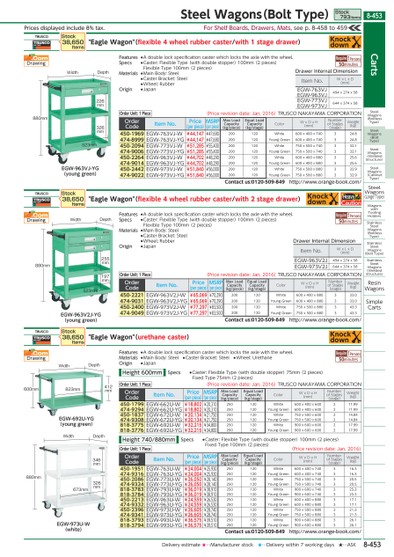 PRICESDISPLAYEDINCLUDE8%TAX.ITEMNO.WXLXD(MM)EGW-963V2J494X274X58EGW-973V2J644X374X58DRAWERINTERNALDIMENSIONEGW-963V2J-YG(YOUNGGREEN)WIDTHDEPTH255MM197MM523MM880MMWIDTHDEPTH226MM326MM523MM880MMEGW-963VJ-YG(YOUNGGREEN)EGW-973U-W(WHITE)WIDTHWIDTHDEPTHDEPTH346MM326MM673MM880MM600MM412MM823MMEGW-692U-YG(YOUNGGREEN)FORSHELFBOARDS,DRAWERS,MATS,SEEP.8-458TO459REQUIRE1PERSONS50MINUTESREQUIRE1PERSONS50MINUTESREQUIRE1PERSONS50MINUTESITEMNO.WXLXD(MM)EGW-763VJ494X274X58EGW-963VJEGW-773VJ644X374X58EGW-973VJDRAWERINTERNALDIMENSIONTRUSCO"EAGLEWAGON"(FLEXIBLE4WHEELRUBBERCASTER/WITH2STAGEDRAWER)HEAVYCAUTIONORDERCODEITEMNO.PRICE(PERPIECE)MSRP(PERPIECE)MAXLOADCAPACITY(KG/PIECE)EQUALLOADCAPACITY(KG/STAGE)COLORWXDXH(MM)NUMBEROFSTAGES(STAGE)WEIGHT(KG)450-2221EGW-963V2J-W¥65,069¥70,290200120WHITE600X400X880333.0474-9031EGW-963V2J-YG¥65,069¥70,290200120YOUNGGREEN600X400X880333.0450-2400EGW-973V2J-W¥77,297¥83,500200120WHITE750X500X880343.3474-9049EGW-973V2J-YG¥77,297¥83,500200120YOUNGGREEN750X500X880343.3CONTACTUS:0120-509-849HTTP://WWW.ORANGE-BOOK.COM/TRUSCO"EAGLEWAGON"(FLEXIBLE4WHEELRUBBERCASTER/WITH1STAGEDRAWER)ORDERCODEITEMNO.PRICE(PERPIECE)MSRP(PERPIECE)MAXLOADCAPACITY(KG/PIECE)EQUALLOADCAPACITY(KG/STAGE)COLORWXDXH(MM)NUMBEROFSTAGES(STAGE)WEIGHT(KG)450-1969EGW-763VJ-W¥44,147¥47,690200120WHITE600X400X740324.8474-8999EGW-763VJ-YG¥44,147¥47,690200120YOUNGGREEN600X400X740324.8450-2094EGW-773VJ-W¥51,285¥55,400200120WHITE750X500X740332.1474-9006EGW-773VJ-YG¥51,285¥55,400200120YOUNGGREEN750X500X740332.1450-2264EGW-963VJ-W¥44,702¥48,290200120WHITE600X400X880325.6474-9014EGW-963VJ-YG¥44,702¥48,290200120YOUNGGREEN600X400X880325.6450-2442EGW-973VJ-W¥51,840¥56,000200120WHITE750X500X880332.9474-9022EGW-973VJ-YG¥51,840¥56,000200120YOUNGGREEN750X500X880332.9CONTACTUS:0120-509-849HTTP://WWW.ORANGE-BOOK.COM/TRUSCO"EAGLEWAGON"(URETHANECASTER)CONTACTUS:0120-509-849HTTP://WWW.ORANGE-BOOK.COM/ORDERCODEITEMNO.PRICE(PERPIECE)MSRP(PERPIECE)MAXLOADCAPACITY(KG/PIECE)EQUALLOADCAPACITY(KG/STAGE)COLORWXDXH(MM)NUMBEROFSTAGES(STAGE)WEIGHT(KG)450-1799EGW-662U-W¥18,802¥20,310250120WHITE600X400X600211.99474-9294EGW-662U-YG¥18,802¥20,310250120YOUNGGREEN600X400X600211.99450-1837EGW-672U-W¥20,134¥21,750250120WHITE750X500X600214.84474-9308EGW-672U-YG¥20,134¥21,750250120YOUNGGREEN750X500X600214.84818-3775EGW-692U-W¥32,215¥34,800250120WHITE900X600X600217.99818-3776EGW-692U-YG¥32,215¥34,800250120YOUNGGREEN900X600X600217.99STOCK38,650ITEMSSTOCK38,650ITEMSSTOCK38,650ITEMSORDERCODEITEMNO.PRICE(PERPIECE)MSRP(PERPIECE)MAXLOADCAPACITY(KG/PIECE)EQUALLOADCAPACITY(KG/STAGE)COLORWXDXH(MM)NUMBEROFSTAGES(STAGE)WEIGHT(KG)450-1951EGW-763U-W¥24,004¥25,930250120WHITE600X400X740316.3474-9316EGW-763U-YG¥24,004¥25,930250120YOUNGGREEN600X400X740316.3450-2086EGW-773U-W¥26,050¥28,140250120WHITE750X500X740320.5474-9324EGW-773U-YG¥26,050¥28,140250120YOUNGGREEN750X500X740320.5818-3783EGW-793U-W¥36,019¥38,910250120WHITE900X600X740325.3818-3784EGW-793U-YG¥36,019¥38,910250120YOUNGGREEN900X600X740325.3450-2213EGW-963U-W¥24,559¥26,530250120WHITE600X400X880317.1474-9332EGW-963U-YG¥24,559¥26,530250120YOUNGGREEN600X400X880317.1450-2396EGW-973U-W¥26,605¥28,740250120WHITE750X500X880321.3474-9341EGW-973U-YG¥26,605¥28,740250120YOUNGGREEN750X500X880321.3818-3793EGW-993U-W¥36,575¥39,510250120WHITE900X600X880326.1818-3794EGW-993U-YG¥36,575¥39,510250120YOUNGGREEN900X600X880326.1ORDERUNIT:1PIECE(PRICEREVISIONDATE:JAN,2016)ORDERUNIT:1PIECE(PRICEREVISIONDATE:JAN,2016)TRUSCONAKAYAMACORPORATIONORDERUNIT:1PIECE(PRICEREVISIONDATE:JAN,2016)TRUSCONAKAYAMACORPORATIONORDERUNIT:1PIECE(PRICEREVISIONDATE:JAN,2016)TRUSCONAKAYAMACORPORATIONDRAWING.COMFEATURES●ADOUBLELOCKSPECIFICATIONCASTERWHICHLOCKSTHEAXLEWITHTHEWHEEL.SPECS●CASTER:FLEXIBLETYPE(WITHDOUBLESTOPPER)100MM(2PIECES)FLEXIBLETYPE100MM(2PIECES)MATERIALS●MAINBODY:STEEL●CASTERBRACKET:STEEL●WHEEL:RUBBERORIGIN●JAPANDRAWING.COMFEATURES●ADOUBLELOCKSPECIFICATIONCASTERWHICHLOCKSTHEAXLEWITHTHEWHEEL.SPECS●CASTER:FLEXIBLETYPE(WITHDOUBLESTOPPER)100MM(2PIECES)FLEXIBLETYPE100MM(2PIECES)MATERIALS●MAINBODY:STEEL●CASTERBRACKET:STEEL●WHEEL:RUBBERORIGIN●JAPANDRAWING.COMFEATURES●ADOUBLELOCKSPECIFICATIONCASTERWHICHLOCKSTHEAXLEWITHTHEWHEEL.MATERIALS●MAINBODY:STEEL●CASTERBRACKET:STEEL●WHEEL:URETHANEORIGIN●JAPANSPECS●CASTER:FLEXIBLETYPE(WITHDOUBLESTOPPER)75MM(2PIECES)FIXEDTYPE75MM(2PIECES)HEIGHT600MMSPECS●CASTER:FLEXIBLETYPE(WITHDOUBLESTOPPER)100MM(2PIECES)FIXEDTYPE100MM(2PIECES)HEIGHT740/880MMCARTSSTEELWAGONS(BOLTLESSTYPE)STEELWAGONS(BOLTTYPE)STEELWAGONS(WELDEDSTRUCTURE)STEELWAGONS(CABINETTYPE)STEELWAGONS(LARGETYPE)WAGONSWITHTOOLINGHOLDERSSTAINLESSSTEELWAGONS(BOLTLESSTYPE)STAINLESSSTEELWAGONS(BOLTTYPE)STAINLESSSTEELWAGONS(WELDEDSTRUCTURE)RESINWAGONSSIMPLECARTSSTEELWAGONS(BOLTTYPE)STOCK793ITEMS8-453*0504270*8-453DELIVERYESTIMATE★…MANUFACTURERSTOCK★…DELIVERYWITHIN7WORKINGDAYS★…ASK
