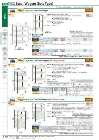 THENUMBERNEXTTOTHELOGOMARKINDICATESITEMSINSTOCKFOREACHBRAND.VL-2H1REPLACEMENTCASTERCASTERDIAMETERFLEXIBLEWITHFLEXIBLESTOPPERΦ40LT-40RLT-40RSREPLACEMENTCASTERCASTERDIAMETERFLEXIBLEWITHFLEXIBLESTOPPERΦ40LT-40RLT-40RSITEMNO.SHALLOWTYPEDRAWERSNUMBEROFSTEPSINTERNALDIMENSIONS(MM)VS-2H11STAGE253X335X55VL-2H11STAGE385X335X55VL-2ITEMNO.SHALLOWTYPEDRAWERSDEEPTYPEDRAWERNUMBEROFSTEPSINTERNALDIMENSIONS(MM)NUMBEROFSTEPSINTERNALDIMENSIONS(MM)VS-22STAGES253X335X551STAGE263.8X335X121VL-22STAGES385X335X551STAGE395.8X335X121REPLACEMENTCASTERCASTERDIAMETERFLEXIBLEWITHFLEXIBLESTOPPERΦ40LT-40RLT-40RSVS-2WIDTH420MM170MM150MM798MMVS-13(3STAGESTYPE)270MM320MMVS-2H1WIDTH798MM270MM200MM798MMWIDTHVL-1(4STAGESTYPE)170MM170MM220MM420MM420MMREQUIRE1PERSONS50MINUTESREQUIRE1PERSONS50MINUTESREQUIRE1PERSONS50MINUTESTRUSCOANGLESTRUTTYPETOOLWAGONTRUSCOANGLESTRUTTYPETOOLWAGON(WITH1STAGEDRAWER)ORDERCODEITEMNO.PRICE(PERPIECE)MSRP(PERPIECE)MAXLOADCAPACITY(KG/PIECE)EQUALLOADCAPACITY(KG/STAGE)COLORWXDXH(MM)NUMBEROFSTAGES(STAGE)WEIGHT(KG)352-5414VS-2H1¥24,504¥26,4706010NEOGRAY350X420X798311.1352-5350VL-2H1¥28,299¥30,5706010NEOGRAY482X420X798313.6CONTACTUS:0120-509-849HTTP://WWW.ORANGE-BOOK.COM/TRUSCOANGLESTRUTTYPETOOLWAGON(WITH3STAGEDRAWER)ORDERCODEITEMNO.PRICE(PERPIECE)MSRP(PERPIECE)MAXLOADCAPACITY(KG/PIECE)EQUALLOADCAPACITY(KG/STAGE)COLORWXDXH(MM)NUMBEROFSTAGES(STAGE)WEIGHT(KG)501-6720VS-2¥27,253¥29,4406010NEOGRAY350X420X798316.5501-6738VL-2¥28,734¥31,0406010NEOGRAY482X420X798320.5CONTACTUS:0120-509-849HTTP://WWW.ORANGE-BOOK.COM/ORDERCODEITEMNO.PRICE(PERPIECE)MSRP(PERPIECE)MAXLOADCAPACITY(KG/PIECE)EQUALLOADCAPACITY(KG/STAGE)COLORWXDXH(MM)NUMBEROFSTAGES(STAGE)WEIGHT(KG)501-6703VS-1¥12,127¥13,1006010NEOGRAY350X420X79847501-6711VL-1¥13,145¥14,2006010NEOGRAY482X420X79849CONTACTUS:0120-509-849HTTP://WWW.ORANGE-BOOK.COM/ORDERCODEITEMNO.PRICE(PERPIECE)MSRP(PERPIECE)MAXLOADCAPACITY(KG/PIECE)EQUALLOADCAPACITY(KG/STAGE)COLORWXDXH(MM)NUMBEROFSTAGES(STAGE)WEIGHT(KG)352-5295VS-13¥10,988¥11,8706010NEOGRAY350X420X79836.0352-5384VL-13¥11,913¥12,8706010NEOGRAY482X420X79837.5STOCK38,650ITEMSSTOCK38,650ITEMSSTOCK38,650ITEMSORDERUNIT:1PIECETRUSCONAKAYAMACORPORATIONORDERUNIT:1PIECEORDERUNIT:1PIECETRUSCONAKAYAMACORPORATIONORDERUNIT:1PIECETRUSCONAKAYAMACORPORATIONDRAWING.COMFEATURES●AFULLYOPENTYPETOOLWAGON.SPECS●CASTER:FLEXIBLETYPE40MM(2PIECES),FLEXIBLETYPE(WITHSTOPPER)40MM(2PIECES)●FALLPREVENTIONHEIGHT:30MM●SHELFBOARDADJUSTABLEPITCH:50MMMATERIALS●MAINBODY:STEEL●CASTERBRACKET:STEEL●WHEEL:RUBBERORIGIN●JAPAN3STAGETYPE4STAGESTYPEDRAWING.COMDRAWING.COMFEATURES●COMESWITHSHALLOWANDDEEPDRAWERS,SOITISCONVENIENTFORSTORINGDOCUMENTSANDTOOLS.SPECS●AVAILABLEONFRONTANDBACK●CASTER:FLEXIBLETYPE40MM(2PIECES),FLEXIBLETYPE(WITHSTOPPER)40MM(2PIECES)●FALLPREVENTIONHEIGHT:30MM●SHELFBOARDADJUSTABLEPITCH:50MM●TOPMOSTDRAWER:VERTICALPARTITIONPANELX2,HORIZONTALPARTITIONPANELX6MATERIALS●MAINBODY:STEEL●CASTERBRACKET:STEEL●WHEEL:RUBBERACCESSORIES●PARTITION:2SHEETS●PARTITIONPANEL:6SHEETSORIGIN●JAPANFEATURES●THE1STAGEDRAWERCOMESWITHAKEY,SOITISOPTIMUMFORSTORINGANDMANAGINGTOOL.SPECS●CASTER:FLEXIBLETYPE40MM(2PIECES),FLEXIBLETYPE(WITHSTOPPER)40MM(2PIECES)●FALLPREVENTIONHEIGHT:30MM●SHELFBOARDADJUSTABLEPITCH:50MM●THEDRAWERHAS2VERTICALPARTITIONPANELSAND6HORIZONTALPARTI-TIONPANELS.MATERIALS●MAINBODY:STEEL●CASTERBRACKET:STEEL●WHEEL:RUBBERORIGIN●JAPANCARTSSTEELWAGONS(BOLTLESSTYPE)STEELWAGONS(BOLTTYPE)STEELWAGONS(WELDEDSTRUCTURE)STEELWAGONS(CABINETTYPE)STEELWAGONS(LARGETYPE)WAGONSWITHTOOLINGHOLDERSSTAINLESSSTEELWAGONS(BOLTLESSTYPE)STAINLESSSTEELWAGONS(BOLTTYPE)STAINLESSSTEELWAGONS(WELDEDSTRUCTURE)RESINWAGONSSIMPLECARTSSTOCK793ITEMSSTEELWAGONS(BOLTTYPE)8-482*0504550*8-482ORDERCODEYELLOW…INSTANTDELIVERY(JAPANONLY)BLUE…BACKORDER(CARRIAGEEXCLUDED)ITEMNO.PINK…STOCKININDONESIA/THAILAND