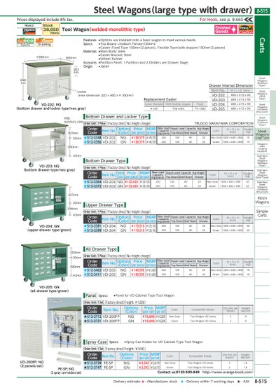 PRICESDISPLAYEDINCLUDE8%TAX.REPLACEMENTCASTERCASTERDIAMETERWITHFLEXIBLESTOPPERFIXEDΦ100TJB-100CTK-100CITEMNO.WXLXD(MM)VD-202408X415X90VD-203408X415X90VD-204408X415X90VD-205408X415X90DRAWERINTERNALDIMENSIONVD-202:NG(BOTTOMDRAWERANDLOCKERTYPE/NEOGRAY)LOCKER(INNERDIMENSION320X480XH350MM)890MM1000MM600MM303MMVD-203:NG(BOTTOMDRAWERTYPE/NEOGRAY)43MM303MM390MM20MM360MMWITHACCESSORYCASEVD-204:GN(UPPERDRAWERTYPE/GREEN)43MM30MM427MM256MM360MMVD-205:GN(ALLDRAWERTYPE/GREEN)43MM30MM293MM390MM360MMVD-200FP:NG(2PANELS/SET)PE-SP:NG(2SPRAYCANHOLDERS/SET)EXAMPLEFORHOOK,SEEP.8-665TRUSCOTOOLWAGON(WELDEDMONOLITHICTYPE)HEAVYCAUTIONORDERCODEITEMNO.OPTIONS(COLOR)PRICE(PERSET)MSRP(PERSET)COLORCOMPATIBLEMODELQ'TYPERSET(PIECE)WEIGHT(KG/SET)★512-3739PE-SPNG¥3,342¥3,610NEOGRAYTOOLWAGONVDSERIES21.8★512-3747PE-SPGN¥3,342¥3,610GREENTOOLWAGONVDSERIES21.8CONTACTUS:0120-509-849HTTP://WWW.ORANGE-BOOK.COM/ORDERCODEITEMNO.OPTIONS(COLOR)PRICE(PERSET)MSRP(PERSET)COLORCOMPATIBLEMODELQ'TYPERSET(SHEET)WEIGHT(KG/SET)★512-3712VD-200FPNG¥16,848¥18,200NEOGRAYTOOLWAGONVDSERIES29★512-3721VD-200FPGN¥16,848¥18,200GREENTOOLWAGONVDSERIES29ORDERCODEITEMNO.OPTIONS(COLOR)PRICE(PERPIECE)MSRP(PERPIECE)MAXLOADCAPACITY(KG/PIECE)EQUALLOADCAPACITY(KG/STAGE)COLORWXDXH(MM)WEIGHT(KG)TOPBOARDSHELFBOARDDRAWER★512-3402VD-205NG¥149,595¥161,6002501004020NEOGRAY1000X600X89078★512-3411VD-205GN¥149,595¥161,6002501004020GREEN1000X600X89078ORDERCODEITEMNO.OPTIONS(COLOR)PRICE(PERPIECE)MSRP(PERPIECE)MAXLOADCAPACITY(KG/PIECE)EQUALLOADCAPACITY(KG/STAGE)COLORWXDXH(MM)WEIGHT(KG)TOPBOARDSHELFBOARDDRAWER★512-3381VD-204NG¥119,510¥129,1002501004020NEOGRAY1000X600X89060★512-3399VD-204GN¥119,510¥129,1002501004020GREEN1000X600X89060ORDERCODEITEMNO.OPTIONS(COLOR)PRICE(PERPIECE)MSRP(PERPIECE)MAXLOADCAPACITY(KG/PIECE)EQUALLOADCAPACITY(KG/STAGE)COLORWXDXH(MM)WEIGHT(KG)TOPBOARDSHELFBOARDDRAWER★512-3364VD-203NG¥120,435¥130,1002501004020NEOGRAY1000X600X89065★512-3372VD-203GN¥120,435¥130,1002501004020GREEN1000X600X89065ORDERCODEITEMNO.OPTIONS(COLOR)PRICE(PERPIECE)MSRP(PERPIECE)MAXLOADCAPACITY(KG/PIECE)EQUALLOADCAPACITY(KG/STAGE)COLORWXDXH(MM)WEIGHT(KG)TOPBOARDSHELFBOARDDRAWER★512-3348VD-202NG¥138,579¥149,7002501004020NEOGRAY1000X600X89070★512-3356VD-202GN¥138,579¥149,7002501004020GREEN1000X600X89070STOCK38,650ITEMSORDERUNIT:1PIECEFACTORYDIRECTNOFREIGHTCHARGETRUSCONAKAYAMACORPORATIONORDERUNIT:1PIECEFACTORYDIRECTNOFREIGHTCHARGEORDERUNIT:1PIECEFACTORYDIRECTNOFREIGHTCHARGEORDERUNIT:1PIECEFACTORYDIRECTNOFREIGHTCHARGEORDERUNIT:1SETFACTORYDIRECTFREIGHT:¥1,000ORDERUNIT:1SETFACTORYDIRECTFREIGHT:¥500CHEMICALCONTENTINSPECTION.COMECOFEATURES●OPTIONSAREINSTALLEDONTOABASICWAGONTOMEETVARIOUSNEEDS.SPECS●TOPBOARD:LINOLEUMTENSION(30MM)●CASTER:FIXEDTYPE100MM(2PIECES),FLEXIBLETYPE(WITHSTOPPER)100MM(2PIECES)MATERIALS●MAINBODY:STEEL●CASTERBRACKET:STEEL●WHEEL:RUBBERACCESSORIES●PARTITIONPANEL:1PARTITIONAND2DIVIDERSPERDRAWERSTAGEORIGIN●JAPANBOTTOMDRAWERANDLOCKERTYPEBOTTOMDRAWERTYPEUPPERDRAWERTYPEALLDRAWERTYPESPECS●PANELFORVDCABINETTYPETOOLWAGONPANELSPECS●SPRAYCANHOLDERFORVDCABINETTYPETOOLWAGONSPRAYCASEDRAWING.COMCARTSSTEELWAGONS(BOLTLESSTYPE)STEELWAGONS(BOLTTYPE)STEELWAGONS(WELDEDSTRUCTURE)STEELWAGONS(CABINETTYPE)STEELWAGONS(LARGETYPE)WAGONSWITHTOOLINGHOLDERSSTAINLESSSTEELWAGONS(BOLTLESSTYPE)STAINLESSSTEELWAGONS(BOLTTYPE)STAINLESSSTEELWAGONS(WELDEDSTRUCTURE)RESINWAGONSSIMPLECARTSSTEELWAGONS(LARGETYPEWITHDRAWER)8-515*0504810*8-515DELIVERYESTIMATE★…MANUFACTURERSTOCK★…DELIVERYWITHIN7WORKINGDAYS★…ASK