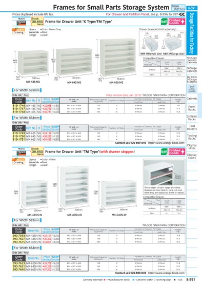 PRICESDISPLAYEDINCLUDE8%TAX.DRAWERSTOPPERSINCEEDGESOFEACHSTAGEARERAISED,DRAWERSARELESSLIKELYTOJUMPOUTEVENWHENTHEYARESUBJECTTOSHAKEORIMPACT.SMALLSIZELARGESIZEASRESINMM-1MM-2MM-1NMM-2NSTEELV-1V-2SIZEMATERIALSCOMPATIBLEDRAWERSMALLSIZELARGESIZEASRESINMM-1MM-2MM-1NMM-2NSTEELV-1V-2SIZEMATERIALSCOMPATIBLEDRAWER468MM592MM307MMMK-43S:NGMK-66S:NG890MM854MM307MM609MM592MM307MM890MM592MM307MM854MM609MM307MMMK-44SN-WMK-46SN-WMK-64SN-WMK-64S:NG854MM307MM609MMDRAWEREXAMPLES(SOLDSEPARATELY)302(264)113(108)130(111)302(255)263(243)113(108)MM-1N(SMALLSIZE)MM-2N(LARGESIZE)(MM)FORDRAWERANDPARTITIONPANEL,SEEP.8-596TO597TRUSCOFRAMEFORDRAWERUNIT"KTYPE/TMTYPE"STOCK38,650ITEMSORDERCODEITEMNO.OPPRICE(PERPIECE)MSRP(PERPIECE)WXDXH(MM)MAXLOADCAPACITY(KG/PIECE)NUMBEROFSTEPSNUMBEROFDRAWERSPERSTAGEWEIGHT(KG)SMALLSIZELARGESIZE819-1746MK-43SNG¥22,958¥24,800592X307X46812034PIECES2PIECES9.0819-1747MK-44SNG¥28,790¥31,100592X307X60916044PIECES2PIECES11.6819-1748MK-46SNG¥40,731¥44,000592X307X89024064PIECES2PIECES16.8ORDERCODEITEMNO.OPPRICE(PERPIECE)MSRP(PERPIECE)WXDXH(MM)MAXLOADCAPACITY(KG/PIECE)NUMBEROFSTEPSNUMBEROFDRAWERSPERSTAGEWEIGHT(KG)SMALLSIZELARGESIZE819-1749MK-63SNG¥32,122¥34,700854X307X46812036PIECES3PIECES12.0819-1750MK-64SNG¥38,232¥41,300854X307X60916046PIECES3PIECES15.5819-1751MK-66SNG¥54,432¥58,800854X307X89024066PIECES3PIECES21.1CONTACTUS:0120-509-849HTTP://WWW.ORANGE-BOOK.COM/TRUSCOFRAMEFORDRAWERUNIT"TMTYPE"(WITHDRAWERSTOPPER)STOCK38,650ITEMSORDERCODEITEMNO.PRICE(PERPIECE)MSRP(PERPIECE)WXDXH(MM)MAXLOADCAPACITY(KG/PIECE)NUMBEROFSTEPSNUMBEROFDRAWERSPERSTAGEWEIGHT(KG)SMALLSIZELARGESIZE393-7593MK-43SN-W¥24,161¥26,100592X307X46812034PIECES2PIECES8.8393-7607MK-44SN-W¥30,363¥32,800592X307X60916044PIECES2PIECES11.3393-7615MK-46SN-W¥42,861¥46,300592X307X89024064PIECES2PIECES16.5ORDERCODEITEMNO.PRICE(PERPIECE)MSRP(PERPIECE)WXDXH(MM)MAXLOADCAPACITY(KG/PIECE)NUMBEROFSTEPSNUMBEROFDRAWERSPERSTAGEWEIGHT(KG)SMALLSIZELARGESIZE393-7623MK-63SN-W¥33,789¥36,500854X307X46812036PIECES3PIECES11.8393-7631MK-64SN-W¥40,269¥43,500854X307X60916046PIECES3PIECES15.2393-7640MK-66SN-W¥57,302¥61,900854X307X89024066PIECES3PIECES20.5CONTACTUS:0120-509-849HTTP://WWW.ORANGE-BOOK.COM/ORDERUNIT:1PIECEORDERUNIT:1PIECETRUSCONAKAYAMACORPORATIONORDERUNIT:1PIECEORDERUNIT:1PIECE(PRICEREVISIONDATE:JAN,2015)TRUSCONAKAYAMACORPORATIONFORWIDTH592MMFORWIDTH854MMFORWIDTH592MMFORWIDTH854MMDRAWING.COMSPECS●COLOR:NEONGRAYMATERIALS●STEELORIGIN●JAPANDRAWING.COMSPECS●COLOR:WHITEMATERIALS●STEELORIGIN●JAPANSTORAGEFACILITIESFORFACTORYSTORAGESYSTEMCABINETSSTORAGECABINETSBIGPARTSSTORAGESYSTEMSSMALLPARTSSTORAGESYSTEMSCABINETSPANELRACKSCONTAINERRACKSTOOLHOLDERSTOOLINGRACKSDISPLAYUNITSDISPLAYCASESFRAMESFORSMALLPARTSSTORAGESYSTEMSTOCK231ITEMS8-591*0505540*8-591DELIVERYESTIMATE★…MANUFACTURERSTOCK★…DELIVERYWITHIN7WORKINGDAYS★…ASK
