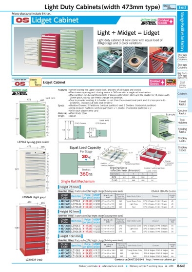 PRICESDISPLAYEDINCLUDE8%TAX.LIGHT+MIDGET=LIDGETLIGHTDUTYCABINETOFNEWZONEWITHEQUALLOADOF30KG/STAGEAND3COLORVARIATIONSLZ7062(YOUNGGRASSCOLOR)LZ9063L(LIGHTGRAY)LZ1083R(RED)SINGLERAILMECHANISMPITCH25PITCH25BBCCPITCH50PITCH50DDDIVIDER(HORIZONTALPARTITION)DIVIDER(HORIZONTALPARTITION)PARTITION(VERTICALPARTITION)PARTITION(VERTICALPARTITION)30KG360PERSTAGESTROKESEQUALLOADCAPACITY(UNIT:MM)MODELNUMBERABCDD706238838847D14013238838892DRAWINGSPECS(EFFECTIVEINNERDIMENSION)AAEXAMPLE13813262689247D140DRAWERSD70DRAWERS473473473485485485(UNIT:MM)(UNIT:MM)LIDGETCABINET10619217817070707070140140140140140140140140707070707070707070707070707070OSAKASEIKANLIDGETCABINETHEAVYCAUTIONORDERCODEITEMNO.PRICE(PERPIECE)MSRP(PERPIECE)WXDXH(MM)MAXLOADCAPACITY(KG/PIECE)MAINBODYCOLORDRAWERWEIGHT(KG)★497-3593LZ1083¥134,306¥174,100473X485X1061330YOUNGGRASSCOLORD70:8STAGES,D140:3STAGES66★497-3607LZ1083L¥134,306¥174,100473X485X1061330LIGHTGRAYD70:8STAGES,D140:3STAGES66★497-3615LZ1083R¥134,306¥174,100473X485X1061330REDD70:8STAGES,D140:3STAGES66CONTACTUS:06-6723-5548HTTP://WWW.OS-CABINET.JP/ORDERCODEITEMNO.PRICE(PERPIECE)MSRP(PERPIECE)WXDXH(MM)MAXLOADCAPACITY(KG/PIECE)MAINBODYCOLORDRAWERWEIGHT(KG)★497-3658LZ9063¥117,643¥152,500473X485X921270YOUNGGRASSCOLORD70:6STAGES,D140:3STAGES56★497-3666LZ9063L¥117,643¥152,500473X485X921270LIGHTGRAYD70:6STAGES,D140:3STAGES56★497-3674LZ9063R¥117,643¥152,500473X485X921270REDD70:6STAGES,D140:3STAGES56ORDERCODEITEMNO.PRICE(PERPIECE)MSRP(PERPIECE)WXDXH(MM)MAXLOADCAPACITY(KG/PIECE)MAINBODYCOLORDRAWERWEIGHT(KG)★497-3623LZ7062¥102,523¥132,900473X485X781240YOUNGGRASSCOLORD70:6STAGES,D140:2STAGES49★497-3631LZ7062L¥102,523¥132,900473X485X781240LIGHTGRAYD70:6STAGES,D140:2STAGES49★497-3640LZ7062R¥102,523¥132,900473X485X781240REDD70:6STAGES,D140:2STAGES49STOCK5ITEMSORDERUNIT:1PIECEFACTORYDIRECTNOFREIGHTCHARGEEXCLUDINGREMOTEISLANDSOSAKASEIKANCO.LTD.ORDERUNIT:1PIECEFACTORYDIRECTNOFREIGHTCHARGEEXCLUDINGREMOTEISLANDSORDERUNIT:1PIECEFACTORYDIRECTNOFREIGHTCHARGEEXCLUDINGREMOTEISLANDSFEATURES●WHENLOCKINGTHEUPPEROVALLELOCK,DRAWERSOFALLSTAGESARELOCKED.●THEDRAWEROPENINGANDCLOSINGSTROKEIS360MMWITHASINGLERAILMECHANISM.●THEPARTITIONCANBEPARTITIONEDINTO7PLACESWITH50MMPITCHANDTHEDIVIDERTO13PLACESWITH25MMPITCH,SOYOUCANFREELYCHANGETHEPARTITION.●DUETOPOWDERCOATING,ITISHARDERTORUSTTHANTHECONVENTIONALPAINTANDITISLESSPRONETOSCRATCHES.(EXCEPTPULLTABSANDDIVIDERS)SPECS●SHALLOWDRAWER:2PARTITIONS(VERTICALPARTITION)AND6DIVIDERS(HORIZONTALPARTITION)●DEEPDRAWER:PARTITION(VERTICALPARTITION)X1,DIVIDER(HORIZONTALPARTITION)X2●WITHEACHSTAGENAMECARDMATERIALS●MAINBODY:STEELORIGIN●JAPANHEIGHT781MMHEIGHT921MMHEIGHT1061MM/UNIFORMLOADKGSTEP30/UNIFORMLOADKGSTEP30STORAGEFACILITIESFORFACTORYSTORAGESYSTEMCABINETSSTORAGECABINETSBIGPARTSSTORAGESYSTEMSSMALLPARTSSTORAGESYSTEMSCABINETSPANELRACKSCONTAINERRACKSTOOLHOLDERSTOOLINGRACKSDISPLAYUNITSDISPLAYCASESLIGHTDUTYCABINETS(WIDTH473MMTYPE)STOCK28ITEMS8-641*0506010*8-641DELIVERYESTIMATE★…MANUFACTURERSTOCK★…DELIVERYWITHIN7WORKINGDAYS★…ASK
