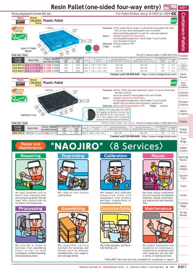 PRICESDISPLAYEDINCLUDE8%TAX.SLA-1111N-B(BLUE)(GREEN)(RED)190MM260MM190MM260MM260MM260MM88MM1100MM150MM1100MM1100MMTAP-D4-1114INADDITIONTOTHEWINGSHAPE,TWOSTRETCHFILMHANGINGMECHANISMS(NON-SLIPRIBS)AREATTACHEDATTHECORNERPORTION.THEFILMISLESSSLIPPERYWITHAPROJECTINGAMOUNTOF5MM,IMPROVINGWORKEFFICIENCY.150MM89MM1400MM260MM190MM260MM300MM190MM300MMFORPALLETDOLLIES,SEEP.8-1053TO1054WEREPAIREQUIPMENTSUCHASELECTRICTOOLS,PNEUMATICTOOLS,ANDHYDRAULICEQUIPMENT.WEALSOREPAIROTHERPRODUCTSTHATARENOTLISTEDINTHEORANGEBOOK.REPAIRINGWEPROVIDEARANGEOFSERVICES,FROMASSEMBLINGCHAINSLINGSTOTAPEPROCESSING,RE-ELECTROPLATING,ANDDUPLICATINGKEYS.PROCESSINGWEREGRINDANDRECOATCUTTINGTOOLS.REGRINDINGWEASSEMBLEVARIOUSFURNITUREFORFACTORIESANDOFFICESSUCHASSHELVES,WORKBENCHES,TOOLWAGONS,ANDSTORAGESHEDS.ASSEMBLINGWEINSPECTANDCALIBRATEMEASURINGTOOLSANDEQUIPMENT,ANDCONDUCTPERIODICINSPECTIONSOFINSULATEDPRODUCTS.CALIBRATIONWEINSTALLGARAGES,PARTITIONS,LEDLIGHTING,ETC.CONSTRUCTION/SETTINGWEREUSEVARIOUSCOMPONENTSSUCHASRECYCLINGRECHARGEABLEBATTERIES,PLATINGRESTORATION,ANDCLEANINGANTI-DUSTRESPIRATORFILTER.REUSEWECONDUCTMAINTENANCEANDINSPECTIONONCOMPRESSORS,COMMERCIALAIRCONDITIONERSANDOTHEREQUIPMENT.WEALSOOFFERAVARIETYOFCLEANINGSERVICES.MAINTENANCE"NAOJIRO"SERVICESAREONLYAVAILABLEFORCUSTOMERSINJAPAN〈8SERVICES〉"NAOJIRO"TRUSCOPLASTICPALLETORDERCODEITEMNO.PRICE(PERSHEET)MSRP(PERSHEET)MAXDYNAMICLOAD(KG)MAXSTATICLOAD(KG)COLORWXDXH(MM)SOCKETDIMENSION(WIDTHSIDE)WXH(MM)SOCKETDIMENSION(DEPTHSIDE)WXH(MM)CENTERGIRTHWIDTH(MM)WEIGHT(KG)423-9415SLA-1111N-B¥7,938¥9,80010004000BLUE1100X1100X150260X88260X8819010.4423-9423SLA-1111N-GN¥7,938¥9,80010004000GREEN1100X1100X150260X88260X8819010.4423-9431SLA-1111N-R¥7,938¥9,80010004000RED1100X1100X150260X88260X8819010.4CONTACTUS:0120-509-849HTTP://WWW.ORANGE-BOOK.COM/STOCK38,650ITEMSORDERUNIT:1SHEETTRUSCONAKAYAMACORPORATIONTRUSCOPLASTICPALLETORDERCODEITEMNO.PRICE(PERSHEET)MSRP(PERSHEET)MAXDYNAMICLOAD(KG)MAXSTATICLOAD(KG)COLORWXDXH(MM)SOCKETDIMENSION(WIDTHSIDE)WXH(MM)SOCKETDIMENSION(DEPTHSIDE)WXH(MM)CENTERGIRTHWIDTH(MM)WEIGHT(KG)299-7673TAP-D4-1114¥7,866¥9,71010004000BLACK1400X1100X150300X89260X8919013.9CONTACTUS:0120-509-849HTTP://WWW.ORANGE-BOOK.COM/STOCK38,650ITEMSORDERUNIT:1SHEET(PRICEREVISIONDATE:JAN,2015)TRUSCONAKAYAMACORPORATIONDRAWING.COMFEATURES●THECENTERBLOCKSHAPEISCYLINDRICALANDGUIDESTHEINSER-TIONOFFORKSANDHANDPALLETTRUCKSMOOTHLY.●NON-POLLUTINGPIGMENTISUSEDFORCOLORINGMATERIAL.SPECS●SINGLEFACEDFOURWAYENTRY●COMPATIBLEEQUIPMENT:HANDPALLETTRUCK/FORKLIFT●JISSTANDARDPRODUCTMATERIALS●POLYPROPYLENE(PP)ORIGIN●JAPANDRAWING.COMFEATURES●SINCE100%RECYCLEDMATERIALISUSED,ITISENVIRONMENTALLYFRIENDLYPRODUCT.●CANBEUSEDFORHANDPALLETTRUCKANDFORKLIFT.SPECS●SINGLEFACEDFOURWAYENTRY●COMPATIBLEEQUIPMENT:HANDPALLETTRUCK/FORKLIFT●WITHSLIPPREVENTION(THERMOPLASTICELASTOMER)MATERIALS●RECYCLEDPOLYPROPYLENE(PP)ORIGIN●JAPANCONTAINERS・PALLETSFOLDABLECONTAINERSPLASTICCORRUGATED-BOARDCONTAINERSPARTSBOXESBOXTYPECONTAINERSCONDUCTIVECONTAINERSKITCHENCONTAINERSMESHCONTAINERSPALLETSPALLETBOXESTURNRINGSPALLETCOVERSNESTINGRACKSMESHPALLETSSQUARETUBSTUBSTANKSCONTAINERBAGSSCRAPBOXESRESINPALLET(ONE-SIDEDFOUR-WAYENTRY)STOCK18ITEMS8-811*0510721*8-811DELIVERYESTIMATE★…MANUFACTURERSTOCK★…DELIVERYWITHIN7WORKINGDAYS★…ASK