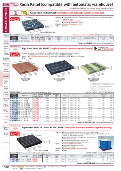 THENUMBERNEXTTOTHELOGOMARKINDICATESITEMSINSTOCKFOREACHBRAND.COLORMATERIALSBK(BLACK)RECYCLEDPOLYPROPYLENE(PP)BR(BROWN)POLYPROPYLENE(PP)LG(LIGHTGREEN)HEIGHT80MM280MM440MM280MMZR-110130E-LG(LIGHTGREEN)72MMHEIGHTZR-1114E-RR-BK(BLACK)300MM300MM350MM74MM275MM300MM275MMHEIGHTZR-1111E-BR(BROWN)WIDTHDEPTHEXAMPLEHEIGHTDEPTH76MMZR-122122WE-BKWIDTH250MM250MM400MMHB-R2-125125EL:BK150MM80MM1250MM1250MM250MM400MM250MMNIPPONPLASTICPALLETRIGIDPLASTICPALLET"NPCPALLET"(COMPLIANTAUTOMATICWAREHOUSESYSTEMS/NON-SLIP)ORDERCODEITEMNO.PRICE(PERSHEET)MSRP(PERSHEET)MAXDYNAMICLOAD(KG)MAXSTATICLOAD(KG)COLORWXDXH(MM)SOCKETDIMENSION(WIDTHSIDE)WXH(MM)CENTERGIRTHWIDTH(MM)WEIGHT(KG)★463-5141ZR-1111ERR-BK¥22,896-10004000BLACK1100X1100X144275X7430020.9★463-5124ZR-1111E-BR¥26,933-10004000BROWN1100X1100X144275X7430020.4★467-8834ZR-1111E-LG¥26,933-10004000LIGHTGREEN1100X1100X144275X7430020.4★463-5175ZR-1114E-RR-BK¥31,590-10004000BLACK1400X1100X144300X7235031.0★463-5205ZR-1313E-RR-BK¥35,249-10004000BLACK1300X1300X150300X8030035.3★463-5213ZR-1315E-RR-BK¥42,525-10004000BLACK1500X1300X150300X8030038.7★463-5086ZR-110120E-RR-BK¥27,959-10004000BLACK1200X1100X144300X7430025.9★463-5116ZR-110140E-RR-BK¥32,414-10004000BLACK1400X1100X144280X8044033.8★467-8800ZR-110120E-LG¥32,198-10004000LIGHTGREEN1200X1100X144300X7430025.6★467-8818ZR-110130E-LG¥31,671-10004000LIGHTGREEN1300X1100X144280X8044032.1★467-8826ZR-110140E-LG¥36,180-10004000LIGHTGREEN1400X1100X144280X8044033.3★467-8842ZR-1113E-LG¥34,776-10004000LIGHTGREEN1300X1100X144300X7235029.3★467-8851ZR-1114E-LG¥40,014-10004000LIGHTGREEN1400X1100X144300X7235030.5CONTACTUS:06-7178-2280HTTP://WWW.NPPC.CO.JP/NIPPONPLASTICPALLETRIGIDPLASTICPALLETFORDRUMCAN"NPCPALLET"(COMPLIANTAUTOMATICWAREHOUSESYSTEMS/NON-SLIP)ORDERCODEITEMNO.PRICE(PERSHEET)MSRP(PERSHEET)MAXDYNAMICLOAD(KG)MAXSTATICLOAD(KG)COLORWXDXH(MM)SOCKETDIMENSION(WIDTHSIDE)WXH(MM)CENTERGIRTHWIDTH(MM)WEIGHT(KG)★463-5183ZR-115122WE-BK¥30,402-10004000BLACK1220X1150X140250X7640027.8★463-5191ZR-122122WE-BK¥32,427-10004000BLACK1220X1220X140250X7640029.0CONTACTUS:06-7178-2280HTTP://WWW.NPPC.CO.JP/RISUPLASTICPALLET"HYBRIDPALLET"(COMPATIBLEWITHAUTOMATICWAREHOUSE/NON-SLIP)ORDERCODEITEMNO.OPTIONS(COLOR)PRICE(PERSHEET)MSRP(PERSHEET)MAXDYNAMICLOAD(KG)MAXSTATICLOAD(KG)COLORWXDXH(MM)SOCKETDIMENSION(WIDTHSIDE)WXH(MM)CENTERGIRTHWIDTH(MM)WEIGHT(KG)★458-1067HB-R2-125125ELBK¥27,216¥33,60010004000BLACK1250X1250X150250X8040032.0CONTACTUS:058-265-2233HTTP://WWW.RISU.CO.JP/STOCK324ITEMSORDERUNIT:1SHEETFACTORYDIRECTFREIGHT:¥1,000EXCLUDINGREMOTEISLANDS(PRICEREVISIONDATE:JAN,2015)GIFUPLASTICINDUSTRYCO.LTD.ORDERUNIT:1SHEETFACTORYDIRECTNOFREIGHTCHARGEEXCLUDINGREMOTEISLANDSNIPPONPLASTICPALLETCORPORATIONORDERUNIT:1SHEETFACTORYDIRECTNOFREIGHTCHARGEEXCLUDINGREMOTEISLANDSNIPPONPLASTICPALLETCORPORATIONFEATURES●APALLETTHATISMADETOBELIGHTBUTSTRONGWITHGASASSISTINJECTIONMOLDING.●COMPATIBLEFORUSEINAUTOMATICWAREHOUSESWITH2POINTSUPPORT.SPECS●DOUBLE-SIDEDTWO-WAYENTRY●COMPATIBLEEQUIPMENT:FORKLIFT●WITHNON-SLIPTAPE.ORIGIN●JAPANFEATURES●OPTIMUMSIZEFORLOADINGDRUMCANSANDTRUCKLOADING.●RECYCLEDMATERIALISUSEDWHILETAKINGINTOACCOUNTTHEEFFECTIVEUSEOFRESOURCESANDTHEENVIRONMENT.●LOADSLIPPREVENTIONMEASURESHAVEBEENAPPLIED.●PALLETFORDRUMCANS.●COMPATIBLEWITHAUTOMATICWAREHOUSE.(PLEASECONSULTUSFORCONDITIONSOFUSE.)SPECS●DOUBLE-SIDEDTWO-WAYENTRY●COMPATIBLEEQUIPMENT:FORKLIFT●WITHNON-SLIPTAPE.MATERIALS●RECYCLEDPOLYPROPYLENE(RECYCLEDPP)ORIGIN●JAPANFEATURES●DEMONSTRATESEXCELLENTSLIPPREVENTIONEFFECTSFORLOADBYINTEGRALLYMOLDINGELASTOMERRESIN.SPECS●DOUBLE-SIDEDTWO-WAYENTRY●COMPATIBLEEQUIPMENT:FORKLIFTMATERIALS●RECYCLEDPOLYPROPYLENE(PP)ORIGIN●JAPANFORPALLETCARTS,SEEP.8-1053TO1054CONTAINERS・PALLETSFOLDABLECONTAINERSPLASTICCORRUGATED-BOARDCONTAINERSPARTSBOXESBOXTYPECONTAINERSCONDUCTIVECONTAINERSKITCHENCONTAINERSMESHCONTAINERSPALLETSPALLETBOXESTURNRINGSPALLETCOVERSNESTINGRACKSMESHPALLETSSQUARETUBSTUBSTANKSCONTAINERBAGSSCRAPBOXESSTOCK18ITEMSRESINPALLET(COMPATIBLEWITHAUTOMATICWAREHOUSE)8-822*0510810*8-822ORDERCODEYELLOW…INSTANTDELIVERY(JAPANONLY)BLUE…BACKORDER(CARRIAGEEXCLUDED)ITEMNO.PINK…STOCKININDONESIA/THAILAND