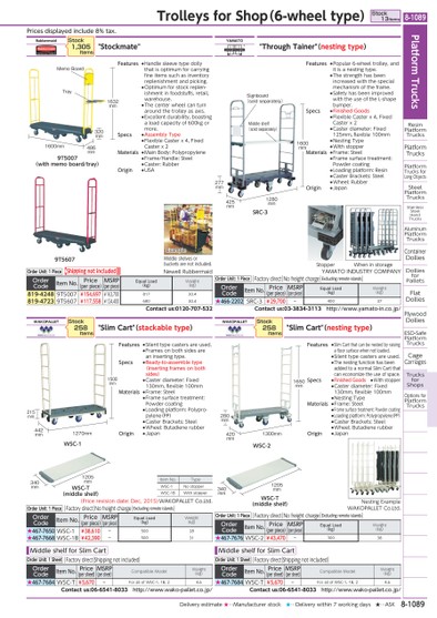 PRICESDISPLAYEDINCLUDE8%TAX.9T5007(WITHMEMOBOARD/TRAY)9T5607420MM1300MMWSC-2WSC-T(MIDDLESHELF)NESTINGEXAMPLE1650MM1205MM340MM280MMWSC-T(MIDDLESHELF)ITEMNO.TYPEWSC-1NOSTOPPERWSC-1BWITHSTOPPERWSC-1215MM442MM1270MM1205MM340MM486MM320MM1632MM1600MMSRC-3SIGNBOARD(SOLDSEPARATELY)MIDDLESHELF(SOLDSEPARATELY)1600MM277MM425MM1280MMSTOPPERWHENINSTORAGE1500MMMEMOBOARDTRAYEXAMPLEMIDDLESHELVESORBUCKETSARENOTINCLUDED.RUBBERMAID"STOCKMATE"STOCK1,305ITEMSORDERCODEITEMNO.PRICE(PERPIECE)MSRP(PERPIECE)EQUALLOAD(KG)WEIGHT(KG)819-42489T5007¥154,697¥163,70081730.4819-47239T5607¥117,558¥124,40068030.4WAKOPALLET"SLIMCART"(STACKABLETYPE)ORDERCODEITEMNO.PRICE(PERPIECE)MSRP(PERPIECE)EQUALLOAD(KG)WEIGHT(KG)★467-7650WSC-1¥38,610-50028★467-7668WSC-1B¥42,390-50031ORDERCODEITEMNO.PRICE(PERSHEET)MSRP(PERSHEET)COMPATIBLEMODELWEIGHT(KG)★467-7684WSC-T¥5,670-FORALLOFWSC-1,1B,24.6CONTACTUS:06-6541-8033HTTP://WWW.WAKO-PALLET.CO.JP/STOCK258ITEMSCONTACTUS:0120-707-532ORDERUNIT:1SHEETFACTORYDIRECTSHIPPINGNOTINCLUDED(PRICEREVISIONDATE:DEC,2015)WAKOPALLETCO.LTD.ORDERUNIT:1PIECEFACTORYDIRECTNOFREIGHTCHARGEEXCLUDINGREMOTEISLANDSORDERUNIT:1PIECENEWELLRUBBERMAIDFEATURES●SILENTTYPECASTERSAREUSED.●FRAMESONBOTHSIDESAREANINSERTINGTYPE.SPECS●READY-TO-ASSEMBLETYPE(INSERTINGFRAMESONBOTHSIDES)●CASTERDIAMETER:FIXED130MM,FLEXIBLE100MMMATERIALS●FRAME:STEEL●FRAMESURFACETREATMENT:POWDERCOATING●LOADINGPLATFORM:POLYPRO-PYLENE(PP)●CASTERBRACKETS:STEEL●WHEEL:BUTADIENERUBBERORIGIN●JAPANMIDDLESHELFFORSLIMCARTFEATURES●HANDLESLEEVETYPEDOLLYTHATISOPTIMUMFORCARRYINGFINEITEMSSUCHASINVENTORYREPLENISHMENTANDPICKING.●OPTIMUMFORSTOCKREPLEN-ISHMENTINFOODSTUFFS,RETAIL,WAREHOUSE.●THECENTERWHEELCANTURNAROUNDTHETROLLEYASAXIS.●EXCELLENTDURABILITY,BOASTINGALOADCAPACITYOF600KGORMORE.SPECS●ASSEMBLYTYPE●FLEXIBLECASTERX4,FIXEDCASTERX2MATERIALS●MAINBODY:POLYPROPYLENE●FRAME/HANDLE:STEEL●CASTER:RUBBERORIGIN●USAWAKOPALLET"SLIMCART"(NESTINGTYPE)ORDERCODEITEMNO.PRICE(PERPIECE)MSRP(PERPIECE)EQUALLOAD(KG)WEIGHT(KG)★467-7676WSC-2¥43,470-30038ORDERCODEITEMNO.PRICE(PERSHEET)MSRP(PERSHEET)COMPATIBLEMODELWEIGHT(KG)★467-7684WSC-T¥5,670-FORALLOFWSC-1,1B,24.6CONTACTUS:06-6541-8033HTTP://WWW.WAKO-PALLET.CO.JP/STOCK258ITEMSYAMATO"THROUGHTAINER"(NESTINGTYPE)ORDERCODEITEMNO.PRICE(PERPIECE)MSRP(PERPIECE)EQUALLOAD(KG)WEIGHT(KG)★466-2202SRC-3¥29,700-40037CONTACTUS:03-3834-3113HTTP://WWW.YAMATO-IN.CO.JP/YAMATOINDUSTRYCOMPANYORDERUNIT:1PIECEFACTORYDIRECTNOFREIGHTCHARGEEXCLUDINGREMOTEISLANDSORDERUNIT:1SHEETFACTORYDIRECTSHIPPINGNOTINCLUDEDWAKOPALLETCO.LTD.ORDERUNIT:1PIECEFACTORYDIRECTNOFREIGHTCHARGEEXCLUDINGREMOTEISLANDSFEATURES●SLIMCARTTHATCANBENESTEDBYRAISINGAFLOORSURFACEWHENNOTLOADED.●SILENTTYPECASTERSAREUSED.●THENESTINGFUNCTIONHASBEENADDEDTOANORMALSLIMCARTTHATCANECONOMIZETHEUSEOFSPACE.SPECS●FINISHEDGOODS●WITHSTOPPER●CASTERDIAMETER:FIXED130MM,FLEXIBLE100MM●NESTINGTYPEMATERIALS●FRAME:STEEL●FRAMESURFACETREATMENT:POWDERCOATING●LOADINGPLATFORM:POLYPROPYLENE(PP)●CASTERBRACKETS:STEEL●WHEEL:BUTADIENERUBBERORIGIN●JAPANMIDDLESHELFFORSLIMCARTFEATURES●POPULAR6-WHEELTROLLEY,ANDITISANESTINGTYPE.●THESTRENGTHHASBEENINCREASEDWITHTHESPECIALMECHANISMOFTHEFRAME.●SAFETYHASBEENIMPROVEDWITHTHEUSEOFTHEL-SHAPEBUMPER.SPECS●FINISHEDGOODS●FLEXIBLECASTERX4,FIXEDCASTERX2●CASTERDIAMETER:FIXED125MM,FLEXIBLE100MM●NESTINGTYPE●WITHSTOPPERMATERIALS●FRAME:STEEL●FRAMESURFACETREATMENT:POWDERCOATING●LOADINGPLATFORM:RESIN●CASTERBRACKETS:STEEL●WHEEL:RUBBERORIGIN●JAPANPLATFORMTRUCKSRESINPLATFORMTRUCKSPLATFORMTRUCKSPLATFORMTRUCKSFORLONGOBJECTSSTEELPLATFORMTRUCKSSTAINLESSSTEELHANDTRUCKSALUMINUMPLATFORMTRUCKSCONTAINERDOLLIESDOLLIESFORPALLETSFLATDOLLIESPLYWOODDOLLIESESD-SAFEPLATFORMTRUCKSCAGECARRIAGESTRUCKSFORSHOPSOPTIONSFORPLATFORMTRUCKSTROLLEYSFORSHOP(6-WHEELTYPE)STOCK13ITEMS8-1089*0507790*8-1089DELIVERYESTIMATE★…MANUFACTURERSTOCK★…DELIVERYWITHIN7WORKINGDAYS★…ASK