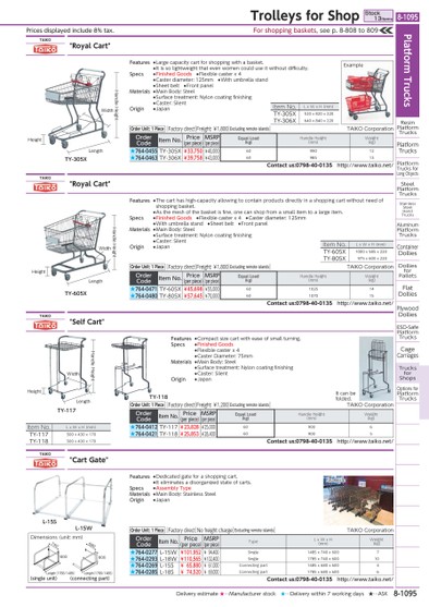 PRICESDISPLAYEDINCLUDE8%TAX.EXAMPLEITEMNO.LXWXH(MM)TY-305X520X820X220TY-306X640X840X220ITEMNO.LXWXH(MM)TY-605X1000X585X220TY-805X975X600X220TY-605XWIDTHHEIGHTLENGTHHANDLEHEIGHTITEMNO.LXWXH(MM)TY-117500X430X170TY-118500X430X170ITCANBEFOLDED.TY-118WIDTHTY-117LENGTHHANDLEHEIGHTHEIGHTL-15SL-15W740680LENGTH(1785/1485)LENGTH(1785/1485)600600(SINGLEUNIT)(CONNECTINGPART)DIMENSIONS(UNIT:MM)EXAMPLETY-305XWIDTHHEIGHTLENGTHHANDLEHEIGHTFORSHOPPINGBASKETS,SEEP.8-808TO809TAIKO"ROYALCART"ORDERUNIT:1PIECEFACTORYDIRECTFREIGHT:¥1,800EXCLUDINGREMOTEISLANDSTAIKOCORPORATIONORDERCODEITEMNO.PRICE(PERPIECE)MSRP(PERPIECE)EQUALLOAD(KG)HANDLEHEIGHT(MM)WEIGHT(KG)★764-0455TY-305X¥33,750¥40,0006099012★764-0463TY-306X¥39,758¥43,0006098513CONTACTUS:0798-40-0135HTTP://WWW.TAIKO.NET/TAIKO"ROYALCART"ORDERUNIT:1PIECEFACTORYDIRECTFREIGHT:¥1,800EXCLUDINGREMOTEISLANDSTAIKOCORPORATIONORDERCODEITEMNO.PRICE(PERPIECE)MSRP(PERPIECE)EQUALLOAD(KG)HANDLEHEIGHT(MM)WEIGHT(KG)★764-0471TY-605X¥45,698¥55,00060102514★764-0480TY-805X¥57,645¥70,00060107015CONTACTUS:0798-40-0135HTTP://WWW.TAIKO.NET/TAIKO"SELFCART"ORDERUNIT:1PIECEFACTORYDIRECTFREIGHT:¥1,200EXCLUDINGREMOTEISLANDSTAIKOCORPORATIONORDERCODEITEMNO.PRICE(PERPIECE)MSRP(PERPIECE)EQUALLOAD(KG)HANDLEHEIGHT(MM)WEIGHT(KG)★764-0412TY-117¥23,828¥25,000609006★764-0421TY-118¥25,853¥28,400609005CONTACTUS:0798-40-0135HTTP://WWW.TAIKO.NET/TAIKO"CARTGATE"ORDERUNIT:1PIECEFACTORYDIRECTNOFREIGHTCHARGEEXCLUDINGREMOTEISLANDSTAIKOCORPORATIONORDERCODEITEMNO.PRICE(PERPIECE)MSRP(PERPIECE)TYPELXWXH(MM)WEIGHT(KG)★764-0277L-15W¥101,952¥94,400SINGLE1485X740X6007★764-0293L-18W¥110,565¥102,400SINGLE1785X740X60010★764-0269L-15S¥65,880¥61,000CONNECTINGPART1485X680X6004★764-0285L-18S¥74,520¥69,000CONNECTINGPART1785X680X6006CONTACTUS:0798-40-0135HTTP://WWW.TAIKO.NET/FEATURES●LARGECAPACITYCARTFORSHOPPINGWITHABASKET.●ITISSOLIGHTWEIGHTTHATEVENWOMENCOULDUSEITWITHOUTDIFFICULTY.SPECS●FINISHEDGOODS●FLEXIBLECASTERX4●CASTERDIAMETER:125MM●WITHUMBRELLASTAND●SHEETBELT●FRONTPANELMATERIALS●MAINBODY:STEEL●SURFACETREATMENT:NYLONCOATINGFINISHING●CASTER:SILENTORIGIN●JAPANFEATURES●THECARTHASHIGH-CAPACITYALLOWINGTOCONTAINPRODUCTSDIRECTLYINASHOPPINGCARTWITHOUTNEEDOFSHOPPINGBASKET.●ASTHEMESHOFTHEBASKETISFINE,ONECANSHOPFROMASMALLITEMTOALARGEITEM.SPECS●FINISHEDGOODS●FLEXIBLECASTERX4●CASTERDIAMETER:125MM●WITHUMBRELLASTAND●SHEETBELT●FRONTPANELMATERIALS●MAINBODY:STEEL●SURFACETREATMENT:NYLONCOATINGFINISHING●CASTER:SILENTORIGIN●JAPANFEATURES●COMPACTSIZECARTWITHEASEOFSMALLTURNING.SPECS●FINISHEDGOODS●FLEXIBLECASTERX4●CASTERDIAMETER:75MMMATERIALS●MAINBODY:STEEL●SURFACETREATMENT:NYLONCOATINGFINISHING●CASTER:SILENTORIGIN●JAPANFEATURES●DEDICATEDGATEFORASHOPPINGCART.●ITELIMINATESADISORGANIZEDSTATEOFCARTS.SPECS●ASSEMBLYTYPEMATERIALS●MAINBODY:STAINLESSSTEELORIGIN●JAPANPLATFORMTRUCKSRESINPLATFORMTRUCKSPLATFORMTRUCKSPLATFORMTRUCKSFORLONGOBJECTSSTEELPLATFORMTRUCKSSTAINLESSSTEELHANDTRUCKSALUMINUMPLATFORMTRUCKSCONTAINERDOLLIESDOLLIESFORPALLETSFLATDOLLIESPLYWOODDOLLIESESD-SAFEPLATFORMTRUCKSCAGECARRIAGESTRUCKSFORSHOPSOPTIONSFORPLATFORMTRUCKSTROLLEYSFORSHOPSTOCK13ITEMS8-1095*0507845*8-1095DELIVERYESTIMATE★…MANUFACTURERSTOCK★…DELIVERYWITHIN7WORKINGDAYS★…ASK