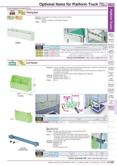 PRICESDISPLAYEDINCLUDE8%TAX.100PB-2PB-2EXAMPLEPB-HEXAMPLE813-93356MM98MM172.5MM50MMWIDTHPACKINGTAPEA4CLIPBOARDCUTTERPENBARCODEREADERSCISSORS813-94(AUXILIARYBAR)EXAMPLEEXAMPLE(REAR)UNITCARTPOCKETSTOCK692ITEMSORDERUNIT:1PIECEORDERCODEITEMNO.PRICE(PERPIECE)MSRP(PERPIECE)WXDXH(MM)SPQ(PIECE)WEIGHT(G)788-3676813-94¥1,481¥1,600467TO605X47X451132CONTACTUS:03-5248-7302HTTP://WWW.UNIT-SIGNS.CO.JP/ORDERUNIT:1PIECEUNITORDERCODEITEMNO.PRICE(PERPIECE)MSRP(PERPIECE)COLORWXDXH(MM)SPQ(PIECE)WEIGHT(G)496-4489813-93¥2,314¥2,500GREEN356X98X172.5(EXCLUDINGHOOKPART)1568TRUSCO"PICKINGBOX"ORDERCODEITEMNO.PRICE(PERPIECE)MSRP(PERPIECE)COMPATIBLEDOLLYMODELWEIGHT(KG)258-8358100PB-2¥4,416¥4,7702-STAGE/3-STAGETROLLEYOFMODELMP700,MODEL102N,MODEL104N,MODEL105N2.1258-8366300PB-2¥4,832¥5,2202-STAGE/3-STAGETROLLEYOFMODELMP900/ND900,MODEL304N,MODEL305N,MODEL308N2.6258-8374100PB-H¥4,416¥4,770HANDLETROLLEYOFMODELMP700/MP800/SH-32.0258-8382300PB-H¥4,832¥5,220HANDLETROLLEYOFMODELMP900/ND1200/SH-2/SH-12.4CONTACTUS:0120-509-849HTTP://WWW.ORANGE-BOOK.COM/STOCK38,650ITEMSORDERUNIT:1PIECETRUSCONAKAYAMACORPORATIONFEATURES●JUSTBYINSERTINGITINTHEBACKBOARDOFTHETRANSPORTDOLLY,SMALLITEMSANDBARCODEREADERSETCNECESSARYFORWORKCANBEPUTIN.●THEPARTITIONPANELBOARDCANBEFREELYREMOVED,ANDTHELAYOUTACCORDINGTOTHEACCESSORYCANBEUSED.●VOUCHERSUPTOA4SIZECANBESTOREDTOGETHERWITHCLIPBOARD.MATERIALS●POLYPROPYLENE(PP)ACCESSORIES●PARTITIONPANEL(LARGE)X1●PARTITIONPANEL(SMALL)X4ORIGIN●CHINAFEATURES●AUXILIARYBARTHATCANATTACHCARTPOCKET813-93TOADOLLYWITHOUTBACKBOARD.SPECS●COMPATIBLEDOLLIES:THEDISTANCEBETWEENTHEHANDLEINNERPARTOFTHETRANSPORTDOLLYISFROM367MMMINIMUMTO500MMMAXIMUM,CORRESPONDENCEHANDLEDIAMETERSFROMΦ26MMTOΦ32MMCORRESPONDENCEMATERIALS●POLYPROPYLENE(PP)ACCESSORIES●BUTTERFLYBOLT●BUTTERFLYNUT●WASHER●SCREWPROTECTIONCAPAUXILIARYBARCHEMICALCONTENTINSPECTION.COMECOFEATURES●CONVENIENTFORSTORINGVOUCHERSWHENPICKING.MATERIALS●STEEL●SURFACETREATMENT:WITHBAKEDCOATINGORIGIN●JAPANDRAWING.COMPLATFORMTRUCKSRESINPLATFORMTRUCKSPLATFORMTRUCKSPLATFORMTRUCKSFORLONGOBJECTSSTEELPLATFORMTRUCKSSTAINLESSSTEELHANDTRUCKSALUMINUMPLATFORMTRUCKSCONTAINERDOLLIESDOLLIESFORPALLETSFLATDOLLIESPLYWOODDOLLIESESD-SAFEPLATFORMTRUCKSCAGECARRIAGESTRUCKSFORSHOPSOPTIONSFORPLATFORMTRUCKSOPTIONALITEMSFORPLATFORMTRUCKSTOCK142ITEMS8-1099*0507871*8-1099DELIVERYESTIMATE★…MANUFACTURERSTOCK★…DELIVERYWITHIN7WORKINGDAYS★…ASK