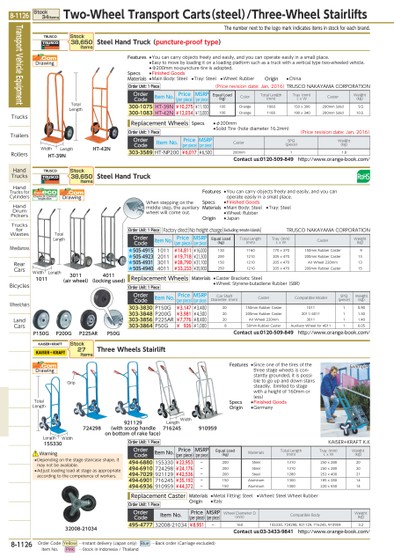 THENUMBERNEXTTOTHELOGOMARKINDICATESITEMSINSTOCKFOREACHBRAND.HT-42NHT-39NTOTALLENGTHWIDTHLENGTHP200GP150GP225ARP50GWHENSTEPPINGONTHEMIDDLESTEP,THEAUXILIARYWHEELWILLCOMEOUT.4011(LOCKINGUSED)10113011(AIRWHEEL)LENGTHTOTALLENGTHWIDTH910959716245LENGTHWIDTH155330LENGTHWIDTHTOTALLENGTH724298GRIP921129(WITHSCOOPHANDLEONBOTTOMOFRAKEFACE)EXAMPLE32008-21034TRUSCOSTEELHANDTRUCK(PUNCTURE-PROOFTYPE)ORDERCODEITEMNO.PRICE(PERPIECE)MSRP(PERPIECE)CARSHAFTDIAMETER(MM)CASTERCOMPATIBLEMODELSPQ(PIECE)WEIGHT(KG)303-3830P150G¥3,147¥3,40020150MMRUBBERCASTER101110.90303-3848P200G¥3,981¥4,30020200MMRUBBERCASTER2011/401111.30303-3856P225AR¥7,776¥8,40020AIRWHEEL220MM301111.40303-3864P50G¥926¥1,000850MMRUBBERCASTERAUXILIARYWHEELFOR401110.05CONTACTUS:0120-509-849HTTP://WWW.ORANGE-BOOK.COM/ORDERCODEITEMNO.PRICE(PERPIECE)MSRP(PERPIECE)EQUALLOAD(KG)TOTALLENGTH(MM)TRAY(MM)LXWCASTERWEIGHT(KG)★505-49151011¥14,811¥16,0001201160170X370150MMRUBBERCASTER9★505-49232011¥19,718¥21,3002001210205X470200MMRUBBERCASTER13★505-49313011¥28,790¥31,1001501210205X470AIRWHEEL220MM13★505-49404011¥33,233¥35,9002501210205X470200MMRUBBERCASTER15ORDERCODEITEMNO.PRICE(PERPIECE)MSRP(PERPIECE)CASTERSPQ(PIECE)WEIGHT(KG)303-3589HT-NP200¥6,017¥6,500200MM11.8CONTACTUS:0120-509-849HTTP://WWW.ORANGE-BOOK.COM/ORDERCODEITEMNO.PRICE(PERPIECE)MSRP(PERPIECE)EQUALLOAD(KG)COLORTOTALLENGTH(MM)TRAY(MM)LXWCASTERWEIGHT(KG)300-1075HT-39N¥10,275¥11,100100ORANGE1060150X306200MMSOLID9.5300-1083HT-42N¥12,034¥13,000100ORANGE1185190X340200MMSOLID10.5KAISER+KRAFTTHREEWHEELSSTAIRLIFTORDERCODEITEMNO.PRICE(PERPIECE)MSRP(PERPIECE)EQUALLOAD(KG)MATERIALSTOTALLENGTH(MM)TRAY(MM)LXWWEIGHT(KG)494-6880155330¥22,953-200STEEL1310250X28020494-6910724298¥24,176-200STEEL1310250X28020494-7029921129¥42,536-200STEEL1280252X40021494-6901716245¥35,192-150ALUMINUM1300185X28014494-6936910959¥44,372-150ALUMINUM1300220X55014ORDERCODEITEMNO.PRICE(PERPIECE)MSRP(PERPIECE)WHEELDIAMETERD(MM)COMPATIBLEBODYWEIGHT(KG)495-477732008-21034¥8,951-160155330,724298,921129,716245,9109593.2CONTACTUS:03-3433-9841HTTP://WWW.ORANGE-BOOK.COM/STOCK27ITEMSSTOCK38,650ITEMSSTOCK38,650ITEMSORDERUNIT:1PIECEORDERUNIT:1PIECEKAISER+KRAFTK.KORDERUNIT:1PIECE(PRICEREVISIONDATE:JAN,2016)TRUSCONAKAYAMACORPORATIONORDERUNIT:1PIECE(PRICEREVISIONDATE:JAN,2016)ORDERUNIT:1PIECEFACTORYDIRECTNOFREIGHTCHARGEEXCLUDINGREMOTEISLANDSTRUSCONAKAYAMACORPORATIONORDERUNIT:1PIECETRUSCOSTEELHANDTRUCKDRAWING.COMSPECS●Φ200MM●SOLIDTIRE(HOLEDIAMETER16.2MM)REPLACEMENTWHEELSCHEMICALCONTENTINSPECTION.COMECOFEATURES●YOUCANCARRYOBJECTSFREELYANDEASILY,ANDYOUCANOPERATEEASILYINASMALLPLACE.SPECS●FINISHEDGOODSMATERIALS●MAINBODY:STEEL●TRAY:STEEL●WHEEL:RUBBERORIGIN●JAPANMATERIALS●CASTERBRACKETS:STEEL●WHEEL:STYRENE-BUTADIENERUBBER(SBR)REPLACEMENTWHEELSDRAWING.COMREPLACEMENTCASTERMATERIALS●METALFITTING:STEEL●WHEEL:STEELWHEELRUBBERORIGIN●ITALYFEATURES●YOUCANCARRYOBJECTSFREELYANDEASILY,ANDYOUCANOPERATEEASILYINASMALLPLACE.●EASYTOMOVEBYLOADINGITONALOADINGPLATFORMSUCHASATRUCKWITHAVERTICALTYPETWO-WHEELEDVEHICLE.●Φ200MMNO-PUNCTURETIREISADOPTED.SPECS●FINISHEDGOODSMATERIALS●MAINBODY:STEEL●TRAY:STEEL●WHEEL:RUBBERFEATURES●SINCEONEOFTHETIRESOFTHETHREESTAGEWHEELSISCON-STANTLYGROUNDED,ITISPOSSI-BLETOGOUPANDDOWNSTAIRSSTEADILY.(LIMITEDTOSTAGEWITHAHEIGHTOF160MMORLESS)SPECS●FINISHEDGOODSORIGIN●GERMANYDRAWING.COMORIGIN●CHINA●DEPENDINGONTHESTAGESTAIRCASESHAPE,ITMAYNOTBEAVAILABLE.●ADJUSTLOADINGLOADATSTAGEASAPPROPRIATEACCORDINGTOTHECOMPETENCEOFWORKERS.WARNINGTRANSPORTVEHICLEEQUIPMENTTRUCKSTRAILERSROLLERSHANDTRUCKSHANDTRUCKSFORCYLINDERSHANDDRUMPICKERSTRUCKSFORWASTESWHEELBARROWSREARCARSBICYCLESWHEELCHAIRSLANDCARSSTOCK34ITEMSTWO-WHEELTRANSPORTCARTS(STEEL)/THREE-WHEELSTAIRLIFTS8-1126*0508030*8-1126ORDERCODEYELLOW…INSTANTDELIVERY(JAPANONLY)BLUE…BACKORDER(CARRIAGEEXCLUDED)ITEMNO.PINK…STOCKININDONESIA/THAILAND