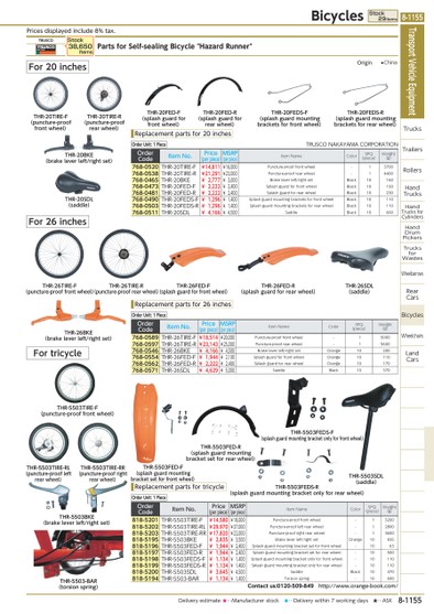 PRICESDISPLAYEDINCLUDE8%TAX.THR-26BKE(BRAKELEVERLEFT/RIGHTSET)THR-26TIRE-F(PUNCTURE-PROOFFRONTWHEEL)THR-26TIRE-R(PUNCTURE-PROOFREARWHEEL)THR-26FED-F(SPLASHGUARDFORFRONTWHEEL)THR-26FED-R(SPLASHGUARDFORREARWHEEL)THR-26SDL(SADDLE)THR-20TIRE-F(PUNCTURE-PROOFFRONTWHEEL)THR-20TIRE-R(PUNCTURE-PROOFREARWHEEL)THR-20BKE(BRAKELEVERLEFT/RIGHTSET)THR-20SDL(SADDLE)THR-20FED-F(SPLASHGUARDFORFRONTWHEEL)THR-20FED-R(SPLASHGUARDFORREARWHEEL)THR-20FEDS-F(SPLASHGUARDMOUNTINGBRACKETSFORFRONTWHEEL)THR-20FEDS-R(SPLASHGUARDMOUNTINGBRACKETSFORREARWHEEL)FORTRICYCLEFOR26INCHESFOR20INCHESTHR-5503TIRE-F(PUNCTURE-PROOFFRONTWHEEL)THR-5503TIRE-RL(PUNCTURE-PROOFLEFTREARWHEEL)THR-5503TIRE-RR(PUNCTURE-PROOFRIGHTREARWHEEL)THR-5503BKE(BRAKELEVERLEFT/RIGHTSET)THR-5503-BAR(TORSIONSPRING)THR-5503FED-F(SPLASHGUARDMOUNTINGBRACKETSETFORFRONTWHEEL)THR-5503FED-R(SPLASHGUARDMOUNTINGBRACKETSETFORREARWHEEL)THR-5503FEDS-F(SPLASHGUARDMOUNTINGBRACKETONLYFORFRONTWHEEL)THR-5503FEDS-R(SPLASHGUARDMOUNTINGBRACKETONLYFORREARWHEEL)THR-5503SDL(SADDLE)TRUSCOPARTSFORSELF-SEALINGBICYCLE"HAZARDRUNNER"STOCK38,650ITEMSORDERCODEITEMNO.PRICE(PERPIECE)MSRP(PERPIECE)ITEMNAMECOLORSPQ(PIECE)WEIGHT(G)818-5201THR-5503TIRE-F¥14,580¥18,000PUNCTURE-PROOFFRONTWHEEL-13200818-5202THR-5503TIRE-RL¥29,970¥37,000PUNCTURE-PROOFLEFTREARWHEEL-12800818-5203THR-5503TIRE-RR¥17,820¥22,000PUNCTURE-PROOFRIGHTREARWHEEL-13600818-5195THR-5503BKE¥2,835¥3,500BRAKELEVERLEFT/RIGHTSETORANGE10935818-5196THR-5503FED-F¥1,944¥2,400SPLASHGUARDMOUNTINGBRACKETSETFORFRONTWHEEL-1063818-5197THR-5503FED-R¥1,944¥2,400SPLASHGUARDMOUNTINGBRACKETSETFORREARWHEEL-10500818-5198THR-5503FEDS-F¥1,134¥1,400SPLASHGUARDMOUNTINGBRACKETONLYFORFRONTWHEEL-10110818-5199THR-5503FEDS-R¥1,134¥1,400SPLASHGUARDMOUNTINGBRACKETONLYFORREARWHEEL-10110818-5200THR-5503SDL¥3,645¥4,500SADDLEBLACK10370818-5194THR-5503-BAR¥1,134¥1,400TORSIONSPRING-10500CONTACTUS:0120-509-849HTTP://WWW.ORANGE-BOOK.COM/ORDERCODEITEMNO.PRICE(PERPIECE)MSRP(PERPIECE)ITEMNAMECOLORSPQ(PIECE)WEIGHT(G)768-0589THR-26TIRE-F¥18,514¥20,000PUNCTURE-PROOFFRONTWHEEL-15000768-0597THR-26TIRE-R¥23,143¥25,000PUNCTURE-PROOFREARWHEEL-15600768-0546THR-26BKE¥4,166¥4,500BRAKELEVERLEFT/RIGHTSETORANGE10200768-0554THR-26FED-F¥1,944¥2,100SPLASHGUARDFORFRONTWHEELORANGE10110768-0562THR-26FED-R¥2,222¥2,400SPLASHGUARDFORREARWHEELORANGE10170768-0571THR-26SDL¥4,629¥5,000SADDLEBLACK10370ORDERCODEITEMNO.PRICE(PERPIECE)MSRP(PERPIECE)ITEMNAMECOLORSPQ(PIECE)WEIGHT(G)768-0520THR-20TIRE-F¥14,811¥16,000PUNCTURE-PROOFFRONTWHEEL-13700768-0538THR-20TIRE-R¥21,291¥23,000PUNCTURE-PROOFREARWHEEL-14400768-0465THR-20BKE¥2,777¥3,000BRAKELEVERLEFT/RIGHTSETBLACK10160768-0473THR-20FED-F¥2,222¥2,400SPLASHGUARDFORFRONTWHEELBLACK10150768-0481THR-20FED-R¥2,222¥2,400SPLASHGUARDFORREARWHEELBLACK10230768-0490THR-20FEDS-F¥1,296¥1,400SPLASHGUARDMOUNTINGBRACKETSFORFRONTWHEELBLACK10110768-0503THR-20FEDS-R¥1,296¥1,400SPLASHGUARDMOUNTINGBRACKETSFORREARWHEELBLACK10110768-0511THR-20SDL¥4,166¥4,500SADDLEBLACK10600ORDERUNIT:1PIECETRUSCONAKAYAMACORPORATIONORDERUNIT:1PIECEORDERUNIT:1PIECEREPLACEMENTPARTSFOR26INCHESREPLACEMENTPARTSFORTRICYCLEREPLACEMENTPARTSFOR20INCHESORIGIN●CHINATRANSPORTVEHICLEEQUIPMENTTRUCKSTRAILERSROLLERSHANDTRUCKSHANDTRUCKSFORCYLINDERSHANDDRUMPICKERSTRUCKSFORWASTESWHEELBARROWSREARCARSBICYCLESWHEELCHAIRSLANDCARSBICYCLESSTOCK29ITEMS8-1155*0508290*8-1155DELIVERYESTIMATE★…MANUFACTURERSTOCK★…DELIVERYWITHIN7WORKINGDAYS★…ASK