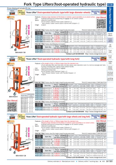 PRICESDISPLAYEDINCLUDE8%TAX.LIFTINGRANGEBEN-H500-12BFORKHEIGHTLENGTHTOTALHEIGHTBEN-H600-15BLENGTHLIFTINGRANGETOTALHEIGHTFORKHEIGHTFORKSLIDEOUTERWIDTHUSERMANUALUSERMANUALUSERMANUALITEMNO.WHEELDIAMETER(MM)FRONT/REARBEN-H150-975/125BEN-H150-1275/125BEN-H150-1575/125BEN-H300-980/150BEN-H300-1280/150BEN-H300-1580/150BEN-H500-980/150BEN-H500-1280/150BEN-H500-1580/150LIFTINGRANGEFORKHEIGHTFORKSLIDEOUTERWIDTHTOTALHEIGHTLENGTHBEN-H500-9FORKSLIDEOUTERWIDTHTRUSCO"KOZOLIFTER"(FOOT-OPERATEDHYDRAULICTYPE/WITHLARGEDIAMETERWHEELS)REPAIRINGOKHEAVYCAUTIONORDERCODEITEMNO.PRICE(PERPIECE)MSRP(PERPIECE)EQUALLOAD(KG)LOADCENTERDISTANCE(MM)FORKDIMENSION(MM)WXLFORKDIMENSION(MM)SLIDEOUTERWIDTHTOTALHEIGHT(MM)FORKHEIGHT(MM)NUMBEROFFOOTPUMPS(TIMES)WEIGHT(KG)★337-3266BEN-H400-9B¥140,697¥173,700400350100X700215TO5781356110TO935EARLY14/LATE4788★337-3274BEN-H400-12B¥144,585¥178,500400350100X700215TO5781656110TO1235EARLY18/LATE6598★337-3291BEN-H600-9B¥207,117¥255,700600400100X800218TO5811396115TO935EARLY17/LATE58113★337-3304BEN-H600-12B¥216,918¥267,800600400100X800218TO5811696115TO1235EARLY23/LATE80123TRUSCO"KOZOLIFTER"(FOOT-OPERATEDHYDRAULICTYPE/WITHLONGFORK)REPAIRINGOKHEAVYCAUTIONORDERCODEITEMNO.PRICE(PERPIECE)MSRP(PERPIECE)EQUALLOAD(KG)LOADCENTERDISTANCE(MM)FORKDIMENSION(MM)WXLFORKDIMENSION(MM)SLIDEOUTERWIDTHTOTALHEIGHT(MM)FORKHEIGHT(MM)NUMBEROFFOOTPUMPS(TIMES)WEIGHT(KG)★337-3118BEN-H150-9¥95,742¥118,20015035060X700130TO468122172TO9023047★337-3126BEN-H150-12¥109,431¥135,10015035060X700130TO468152172TO12024050★337-3134BEN-H150-15¥123,039¥151,90015035060X700130TO468182172TO15025153★337-3142BEN-H300-9¥140,697¥173,700300400100X800215TO578132177TO902EARLY14/LATE4786★337-3151BEN-H300-12¥144,585¥178,500300400100X800215TO578162177TO1202EARLY18/LATE6596★337-3177BEN-H500-9¥209,061¥258,100500450100X900218TO581136182TO901EARLY17/LATE58112★337-3185BEN-H500-12¥212,949¥262,900500450100X900218TO581166182TO1201EARLY23/LATE80122TRUSCO"KOZOLIFTER"(FOOT-OPERATEDHYDRAULICTYPE/WITHLARGEWHEELSANDLONGFORK)REPAIRINGOKHEAVYCAUTIONORDERCODEITEMNO.PRICE(PERPIECE)MSRP(PERPIECE)EQUALLOAD(KG)LOADCENTERDISTANCE(MM)FORKDIMENSION(MM)WXLFORKDIMENSION(MM)SLIDEOUTERWIDTHTOTALHEIGHT(MM)FORKHEIGHT(MM)NUMBEROFFOOTPUMPS(TIMES)WEIGHT(KG)★337-3321BEN-H300-9B¥146,529¥180,900300400100X800215TO5781356112TO937EARLY14/LATE4789★337-3339BEN-H300-12B¥150,498¥185,800300400100X800215TO5781656112TO1237EARLY18/LATE6596★337-3355BEN-H500-9B¥214,893¥265,300500450100X900218TO5811396116TO935EARLY17/LATE58115★337-3363BEN-H500-12B¥218,862¥270,200500450100X900218TO5811696116TO1235EARLY23/LATE80125STOCK38,650ITEMSSTOCK38,650ITEMSSTOCK38,650ITEMSORDERUNIT:1PIECEFACTORYDIRECTNOFREIGHTCHARGEEXCLUDINGREMOTEISLANDSTRUSCONAKAYAMACORPORATIONORDERUNIT:1PIECEFACTORYDIRECTNOFREIGHTCHARGEEXCLUDINGREMOTEISLANDSTRUSCONAKAYAMACORPORATIONORDERUNIT:1PIECEFACTORYDIRECTNOFREIGHTCHARGEEXCLUDINGREMOTEISLANDSTRUSCONAKAYAMACORPORATIONORDERUNIT:1PIECEFACTORYDIRECTSHIPPINGNOTINCLUDEDORDERCODEITEMNO.PRICE(PERPIECE)MSRP(PERPIECE)EQUALLOAD(KG)LOADCENTERDISTANCE(MM)FORKDIMENSION(MM)WXLFORKDIMENSION(MM)SLIDEOUTERWIDTHTOTALHEIGHT(MM)FORKHEIGHT(MM)NUMBEROFFOOTPUMPS(TIMES)WEIGHT(KG)★337-3282BEN-H400-15B¥152,361¥188,100400350100X700215TO5781956110TO1535EARLY23/LATE80116★337-3312BEN-H600-15B¥228,582¥282,200600400100X800218TO5811996115TO1535EARLY29/LATE100133CONTACTUS:0120-509-849HTTP://WWW.ORANGE-BOOK.COM/ORDERUNIT:1PIECEFACTORYDIRECTSHIPPINGNOTINCLUDEDORDERCODEITEMNO.PRICE(PERPIECE)MSRP(PERPIECE)EQUALLOAD(KG)LOADCENTERDISTANCE(MM)FORKDIMENSION(MM)WXLFORKDIMENSION(MM)SLIDEOUTERWIDTHTOTALHEIGHT(MM)FORKHEIGHT(MM)NUMBEROFFOOTPUMPS(TIMES)WEIGHT(KG)★337-3347BEN-H300-15B¥158,274¥195,400300400100X800215TO5781956112TO1537EARLY23/LATE80117★337-3371BEN-H500-15B¥234,414¥289,400500450100X900218TO5811996116TO1535EARLY29/LATE100135CONTACTUS:0120-509-849HTTP://WWW.ORANGE-BOOK.COM/ORDERUNIT:1PIECEFACTORYDIRECTSHIPPINGNOTINCLUDEDORDERCODEITEMNO.PRICE(PERPIECE)MSRP(PERPIECE)EQUALLOAD(KG)LOADCENTERDISTANCE(MM)FORKDIMENSION(MM)WXLFORKDIMENSION(MM)SLIDEOUTERWIDTHTOTALHEIGHT(MM)FORKHEIGHT(MM)NUMBEROFFOOTPUMPS(TIMES)WEIGHT(KG)★337-3169BEN-H300-15¥152,361¥188,100300400100X800215TO578192177TO1502EARLY23/LATE80114★337-3193BEN-H500-15¥228,582¥282,200500450100X900218TO581196182TO1501EARLY29/LATE100132CONTACTUS:0120-509-849HTTP://WWW.ORANGE-BOOK.COM/DRAWING.COMFEATURES●EMPLOYSLARGERDIAMETER(Φ150)WHEELSTOMAINTAINAGOODOPERABILITYONANUNEVENSURFACE.USE●LIFTING/LOWERINGANDTRANSPORTINGOFLUGGAGEONANUNEVENSURFACE.SPECS●MANUALTRAVELINGTYPE●FRONTWHEEL:URETHANEFIXEDCASTER(150MM)X2,REARWHEELS:RUBBERSWIVELCASTER(150MM)WITHSTOPPERX2ORIGIN●JAPANDRAWING.COMFEATURES●THELENGTHOFFORKIS100MMLARGERTHANTHESTANDARDONE.●FOOT-OPERATEDLIFTERPAIRTHATDOESNOTTAKESPACE,EASYOPERATIONEVENINANARROWPASSAGEPAIRTYPE.●UNIQUEHANDLINGWITHORIGINALSHAPEPLATEDHANDLE.USE●ELEVATINGANDTRANSPORTINGOFLUGGAGE.SPECS●MANUALTRAVELINGTYPE●FRONTWHEEL:FIXEDURETHANECASTERX2,REARWHEELS:RUBBERCASTERWITHFLEXIBLESTOPPERX2ORIGIN●JAPANDRAWING.COMFEATURES●THELENGTHOFFORKIS100MMLARGERTHANTHESTANDARDONE.●EMPLOYSLARGERDIAMETER(Φ150)WHEELSTOMAINTAINAGOODOPERABILITYONANUNEVENSURFACE.USE●LIFTING/LOWERINGANDTRANSPORTINGOFLUGGAGEONANUNEVENSURFACE.SPECS●MANUALTRAVELINGTYPE●FRONTWHEEL:URETHANEFIXEDCASTER(150MM)X2,REARWHEELS:RUBBERSWIVELCASTER(150MM)WITHSTOPPERX2ORIGIN●JAPANLIFTERS・HANDPALLETTRUCKSHANDLIFTERSFORKTYPELIFTERSJIBLIFTSTURNLIFTSFORKLIFTSTABLELIFTSHANDPALLETTRUCKSVERTICALTRANSFERMACHINESLANDINGMACHINESFORKTYPELIFTERS(FOOT-OPERATEDHYDRAULICTYPE)8-1181*0508481*8-1181DELIVERYESTIMATE★…MANUFACTURERSTOCK★…DELIVERYWITHIN7WORKINGDAYS★…ASK