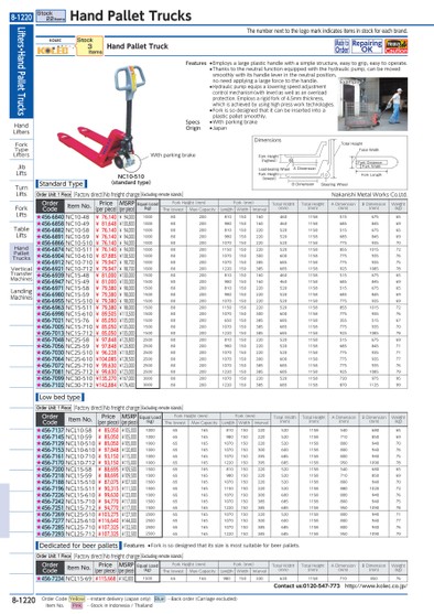 THENUMBERNEXTTOTHELOGOMARKINDICATESITEMSINSTOCKFOREACHBRAND.NC10-510(STANDARDTYPE)FORKHEIGHT(HIGHEST)FORKHEIGHT(LOWEST)FORKDISTANCEFORKWIDTHADIMENSIONLOAD-BEARINGWHEELSTEERINGWHEELBDIMENSIONFORKLENGTHTOTALWIDTHTOTALHEIGHTDIMENSIONSEXAMPLEWITHPARKINGBRAKEKOLECHANDPALLETTRUCKMADETOORDERREPAIRINGOKHEAVYCAUTIONORDERCODEITEMNO.PRICE(PERPIECE)MSRP(PERPIECE)EQUALLOAD(KG)FORKHEIGHT(MM)FORK(MM)TOTALWIDTH(MM)TOTALHEIGHT(MM)ADIMENSION(MM)BDIMENSION(MM)WEIGHT(KG)THELOWESTMAXCAPACITYLENGTHWIDTHINTERVAL★456-7234NCL15-69¥115,668¥142,800150065165980150330630115871085076CONTACTUS:0120-547-773HTTP://WWW.KOLEC.CO.JP/ORDERCODEITEMNO.PRICE(PERPIECE)MSRP(PERPIECE)EQUALLOAD(KG)FORKHEIGHT(MM)FORK(MM)TOTALWIDTH(MM)TOTALHEIGHT(MM)ADIMENSION(MM)BDIMENSION(MM)WEIGHT(KG)THELOWESTMAXCAPACITYLENGTHWIDTHINTERVAL★456-7137NCL10-58¥85,050¥105,000100065165810150220520115854068065★456-7145NCL10-59¥85,050¥105,000100065165980150220520115871085069★456-7129NCL10-510¥85,050¥105,0001000651651070150220520115880094070★456-7153NCL10-610¥97,848¥120,8001000651651070150300600115880094076★456-7161NCL10-710¥93,150¥115,0001000651651070150395685115880094075★456-7170NCL10-712¥93,150¥115,00010006516512201503956851158950109078★456-7200NCL15-58¥88,695¥109,500150065165810150220520115854068065★456-7218NCL15-59¥88,695¥109,500150065165980150220520115871085069★456-7188NCL15-510¥87,075¥107,5001500651651070150220520115880094070★456-7196NCL15-511¥90,315¥111,50015006516511501502205201158880102072★456-7226NCL15-610¥99,630¥123,0001500651651070150300600115880094076★456-7242NCL15-710¥94,770¥117,0001500651651070150385685115880094075★456-7251NCL15-712¥94,770¥117,00015006516512201503856851158950109078★456-7269NCL25-510¥103,275¥127,5002500651651070150220520115880094071★456-7277NCL25-610¥116,640¥144,0002500651651070150300600115880094077★456-7285NCL25-710¥107,325¥132,5002500651651070150385685115880094076★456-7293NCL25-712¥107,325¥132,50025006516512201503856851158950109079ORDERCODEITEMNO.PRICE(PERPIECE)MSRP(PERPIECE)EQUALLOAD(KG)FORKHEIGHT(MM)FORK(MM)TOTALWIDTH(MM)TOTALHEIGHT(MM)ADIMENSION(MM)BDIMENSION(MM)WEIGHT(KG)THELOWESTMAXCAPACITYLENGTHWIDTHINTERVAL★456-6840NC10-48¥76,140¥94,000100080200810150160460115851567565★456-6858NC10-49¥81,648¥100,800100080200980150160460115868584569★456-6882NC10-58¥76,140¥94,000100080200810150220520115851567565★456-6891NC10-59¥76,140¥94,000100080200980150220520115868584569★456-6866NC10-510¥76,140¥94,0001000802001070150220520115877593570★456-6874NC10-511¥76,140¥94,00010008020011501502205201158855101572★456-6904NC10-610¥87,885¥108,5001000802001070150300600115877593576★456-6912NC10-710¥79,947¥98,7001000802001070150385685115877593575★456-6921NC10-712¥79,947¥98,70010008020012201503856851158925108578★456-6939NC15-48¥81,000¥100,000150080200810150160460115851567565★456-6947NC15-49¥81,000¥100,000150080200980150160460115868584569★456-6971NC15-58¥79,380¥98,000150080200810150220520115851567565★456-6980NC15-59¥79,380¥98,000150080200980150220520115868584569★456-6955NC15-510¥79,380¥98,0001500802001070150220520115877593569★456-6963NC15-511¥79,380¥98,00015008020011501502205201158855101572★456-6998NC15-610¥89,505¥110,5001500802001070150300600115877593576★456-7021NC15-76¥85,050¥105,000150080200650150385685115835551567★456-7005NC15-710¥85,050¥105,0001500802001070150385685115877593570★456-7013NC15-712¥85,050¥105,00015008020012201503856851158925108578★456-7048NC25-58¥97,848¥120,800250080200810150220520115851567569★456-7056NC25-59¥97,848¥120,800250080200980150220520115868584571★456-7030NC25-510¥96,228¥118,8002500802001070150220520115877593571★456-7064NC25-610¥104,085¥128,5002500802001070150300600115877593577★456-7072NC25-710¥99,630¥123,0002500802001070150385685115877593576★456-7081NC25-712¥99,630¥123,00025008020012201503856851158925108579★456-7099NC30-510¥135,270¥167,0003000802001070150220520115872097595★456-7102NC30-712¥142,884¥176,40030008020012201503856851158870112599ORDERUNIT:1PIECEFACTORYDIRECTNOFREIGHTCHARGEEXCLUDINGREMOTEISLANDSNAKANISHIMETALWORKSCO.LTD.ORDERUNIT:1PIECEFACTORYDIRECTNOFREIGHTCHARGEEXCLUDINGREMOTEISLANDSORDERUNIT:1PIECEFACTORYDIRECTNOFREIGHTCHARGEEXCLUDINGREMOTEISLANDSSTOCK3ITEMSFEATURES●EMPLOYSALARGEPLASTICHANDLEWITHASIMPLESTRUCTURE,EASYTOGRIP,EASYTOOPERATE.●THANKSTOTHENEUTRALFUNCTIONEQUIPPEDWITHTHEHYDRAULICPUMP,CANBEMOVEDSMOOTHLYWITHITSHANDLELEVERINTHENEUTRALPOSITION,NONEEDAPPLYINGALARGEFORCETOTHEHANDLE.●HYDRAULICPUMPEQUIPSALOWERINGSPEEDADJUSTMENTCONTROLMECHANISM(WITHLEVER)ASWELLASANOVERLOADPROTECTION.EMPLOYSARIGIDFORKOF4.5MMTHICKNESS,WHICHISACHIEVEDBYUSINGHIGHPRESSWORKTECHNOLOGIES.●FORKISSODESIGNEDTHATITCANBEINSERTEDINTOAPLASTICPALLETSMOOTHLY.SPECS●WITHPARKINGBRAKEORIGIN●JAPANSTANDARDTYPELOWBEDTYPEFEATURES●FORKISSODESIGNEDTHATITSSIZEISMOSTSUITABLEFORBEERPALLETS.DEDICATEDFORBEERPALLETSLIFTERS・HANDPALLETTRUCKSHANDLIFTERSFORKTYPELIFTERSJIBLIFTSTURNLIFTSFORKLIFTSTABLELIFTSHANDPALLETTRUCKSVERTICALTRANSFERMACHINESLANDINGMACHINESSTOCK22ITEMSHANDPALLETTRUCKS8-1220*0508840*8-1220ORDERCODEYELLOW…INSTANTDELIVERY(JAPANONLY)BLUE…BACKORDER(CARRIAGEEXCLUDED)ITEMNO.PINK…STOCKININDONESIA/THAILAND