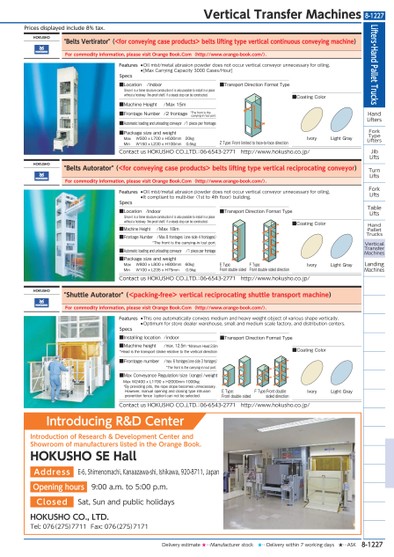 PRICESDISPLAYEDINCLUDE8%TAX.■MACHINEHEIGHT/MAX.12.5M■FRONTAGENUMBER/MAX.6FRONTAGES(ONESIDE3FRONTAGES)■INSTALLINGLOCATION/INDOOR*THEFRONTISTHECARRYING-IN/OUTPORT.MAXW2400XL1700XH2000MM1000KG■MAXCONVEYANCEREGULATION/SIZE(RANGE)/WEIGHT*HEADISTHETRANSPORTSTROKERELATIVETOTHEVERTICALDIRECTION*MINIMUMHEAD2.8M■COATINGCOLOR■TRANSPORTDIRECTIONFORMATTYPEIVORYLIGHTGRAYETYPE:FRONTDOUBLESIDEDFTYPE:FRONTDOUBLESIDEDDIRECTION*BYPROVIDINGPITS,THEROPESLOPEBECOMESUNNECESSARY.HOWEVER,MANUALOPENINGANDCLOSINGTYPEINTRUSIONPREVENTIONFENCE(OPTION)CANNOTBESELECTED.■LOCATION/INDOOR■MACHINEHEIGHT/MAX18M■FRONTAGENUMBER/MAX8FRONTAGES(ONESIDE4FRONTAGES)*THEFRONTISTHECARRYING-IN/OUTPORT.■AUTOMATICLOADINGANDUNLOADINGCONVEYOR■PACKAGESIZEANDWEIGHTMAXW800XL800XH800MM60KGMINW100XL235XH75MM0.5KG/1PIECEPERFRONTAGESINCEITISAFRAMESTRUCTURECONSTRUCTIONITISALSOPOSSIBLETOINSTALLINAPLACEWITHOUTAHOISTWAY(FIRE-PROOFSHAFT)IFASTEADYSTOPCANBECONSTRUCTED.■COATINGCOLOR■TRANSPORTDIRECTIONFORMATTYPEIVORYLIGHTGRAYETYPE:FRONTDOUBLESIDEDFTYPE:FRONTDOUBLESIDEDDIRECTION■LOCATION■COATINGCOLOR■TRANSPORTDIRECTIONFORMATTYPE/INDOOR■MACHINEHEIGHT/MAX15M■FRONTAGENUMBER/2FRONTAGE*THEFRONTISTHECARRYING-IN/OUTPORT.■AUTOMATICLOADINGANDUNLOADINGCONVEYOR■PACKAGESIZEANDWEIGHTMAXW500XL700XH500MM20KGMINW150XL230XH100MM0.5KG/1PIECEPERFRONTAGESINCEITISAFRAMESTRUCTURECONSTRUCTIONITISALSOPOSSIBLETOINSTALLINAPLACEWITHOUTAHOISTWAY(FIRE-PROOFSHAFT)IFASTEADYSTOPCANBECONSTRUCTED.ZTYPE:FRONTLIMITEDTOFACE-TO-FACEDIRECTIONIVORYLIGHTGRAYINTRODUCINGR&DCENTERINTRODUCTIONOFRESEARCH&DEVELOPMENTCENTERANDSHOWROOMOFMANUFACTURERSLISTEDINTHEORANGEBOOK.HOKUSHOSEHALLTEL:076(275)7711FAX:076(275)7171HOKUSHOCO.,LTD.9:00A.M.TO5:00P.M.OPENINGHOURSE-6,SHIMENOMACHI,KANAAZAWA-SHI,ISHIKAWA,920-8711,JAPANADDRESSSAT,SUNANDPUBLICHOLIDAYSCLOSEDSPECSSPECSSPECSFEATURES●THISONEAUTOMATICALLYCONVEYSMEDIUMANDHEAVYWEIGHTOBJECTOFVARIOUSSHAPEVERTICALLY.●OPTIMUMFORSTOREDEALERWAREHOUSE,SMALLANDMEDIUMSCALEFACTORY,ANDDISTRIBUTIONCENTERS.FEATURES●OILMIST/METALABRASIONPOWDERDOESNOTOCCURVERTICALCONVEYORUNNECESSARYFOROILING.●ITCOMPLIANTTOMULTI-TIER(1STTO4THFLOOR)BUILDING.FEATURES●OILMIST/METALABRASIONPOWDERDOESNOTOCCURVERTICALCONVEYORUNNECESSARYFOROILING.●[MAXCARRYINGCAPACITY3000CASES/HOUR]HOKUSHO"BELTSVERTIRATOR"(<FORCONVEYINGCASEPRODUCTS>BELTSLIFTINGTYPEVERTICALCONTINUOUSCONVEYINGMACHINE)FORCOMMODITYINFORMATION,PLEASEVISITORANGEBOOK.COM(HTTP://WWW.ORANGE-BOOK.COM/).CONTACTUSHOKUSHOCO.,LTD.:06-6543-2771HTTP://WWW.HOKUSHO.CO.JP/HOKUSHO"BELTSAUTORATOR"(<FORCONVEYINGCASEPRODUCTS>BELTSLIFTINGTYPEVERTICALRECIPROCATINGCONVEYOR)FORCOMMODITYINFORMATION,PLEASEVISITORANGEBOOK.COM(HTTP://WWW.ORANGE-BOOK.COM/).CONTACTUSHOKUSHOCO.,LTD.:06-6543-2771HTTP://WWW.HOKUSHO.CO.JP/HOKUSHO"SHUTTLEAUTORATOR"(<PACKING-FREE>VERTICALRECIPROCATINGSHUTTLETRANSPORTMACHINE)FORCOMMODITYINFORMATION,PLEASEVISITORANGEBOOK.COM(HTTP://WWW.ORANGE-BOOK.COM/).CONTACTUSHOKUSHOCO.,LTD.:06-6543-2771HTTP://WWW.HOKUSHO.CO.JP/LIFTERS・HANDPALLETTRUCKSHANDLIFTERSFORKTYPELIFTERSJIBLIFTSTURNLIFTSFORKLIFTSTABLELIFTSHANDPALLETTRUCKSVERTICALTRANSFERMACHINESLANDINGMACHINESVERTICALTRANSFERMACHINES8-1227*0508910*8-1227DELIVERYESTIMATE★…MANUFACTURERSTOCK★…DELIVERYWITHIN7WORKINGDAYS★…ASK