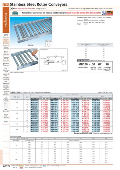 THENUMBERNEXTTOTHELOGOMARKINDICATESITEMSINSTOCKFOREACHBRAND.ROLLERREPLACEMENTISEASYSHAFTSHAPEMUS38PITCHROLLERWIDTHW(MM)150200300400500600PITCHP(MM)SIDELENGTHL(MM)PRODUCTWEIGHT(KG)50100010.512.115.318.521.724.9150015.718.122.927.732.537.3200020.323.429.736.042.348.6300030.034.744.153.562.972.37510008.49.511.713.516.118.3150013.014.718.021.324.627.9200016.518.622.827.031.235.4300024.627.834.240.647.053.410010007.48.310.111.913.715.5150011.512.815.418.020.623.2200014.816.519.823.126.429.7300021.524.029.034.039.044.0STRAIGHTCONVEYORFORSTANDSFORCONVEYORS,SEEP.8-1272W+70W3053060662Φ12Φ385ROLLERTHICKNESS1(UNIT:MM)DIMENSIONSROLLERWIDTH(W)(MM)ROLLERLOADCAPACITY(KG/PIECE)150902009030070400705006060050ITEMNO.EXAMPLEMUS38-300710MODELNAMEDISPLAYPITCH(CM)DISPLAYROLLERWIDTH(CM)CONVEYORLENGTHDISPLAYEDIN10CMINCREMENTS.(ORDERCODE465-8728)MISUZUREMOVABLETYPEROLLERCONVEYOR"SLOT-INSTAINLESSSTEELROLLERCONVEYOR"(MUS38MODEL:ROLLERDIAMETER38MM,THICKNESS1.0MM)MADETOORDERHEAVYCAUTIONROLLERWIDTH(W)(MM)PITCH(MM)CONVEYORLENGTH(MM)1000150020003000ORDERCODEPRICE(PERPIECE)ORDERCODEPRICE(PERPIECE)ORDERCODEPRICE(PERPIECE)ORDERCODEPRICE(PERPIECE)15050★858-3602¥61,317★858-3603¥88,290★858-3604¥113,400★858-3605¥164,99775★858-3606¥39,852★858-3607¥66,339★858-3608¥83,025★858-3609¥122,067100★858-3610¥39,852★858-3611¥56,052★858-3612¥70,470★858-3613¥100,92620050★858-3614¥64,881★858-3615¥93,636★858-3616¥120,447★858-3617¥175,68975★858-3618¥48,600★858-3619¥70,065★858-3620¥87,804★858-3621¥129,276100★858-3622¥41,796★858-3623¥58,887★858-3624¥74,196★858-3625¥106,51530050★858-3626¥71,928★858-3627¥104,004★858-3628¥134,217★858-3629¥196,10175★465-8728¥53,298★465-8736¥77,274★465-8744¥96,957★858-3630¥143,208100★858-3631¥45,522★858-3632¥64,395★858-3633¥81,405★858-3634¥117,20740050★858-3635¥79,623★858-3636¥115,506★858-3637¥149,283★858-3638¥218,61975★465-8752¥58,401★465-8761¥85,050★465-8779¥106,920★858-3639¥158,436100★858-3640¥49,491★858-3641¥70,470★858-3642¥89,262★858-3643¥128,79050050★858-3644¥86,913★858-3645¥126,441★858-3646¥163,701★858-3647¥240,00375★858-3648¥63,342★858-3649¥92,502★858-3650¥116,559★858-3651¥173,016100★858-3652¥53,379★858-3653¥76,302★858-3654¥96,876★858-3655¥140,04960050★858-3656¥93,474★858-3657¥136,404★858-3658¥176,661★858-3659¥259,44375★858-3660¥67,716★858-3661¥99,306★858-3662¥125,226★858-3663¥186,219100★858-3664¥56,862★858-3665¥81,567★858-3666¥103,680★858-3667¥150,174CONTACTUS:059-397-3220HTTP://WWW.MISUZUKOKI.JP/ORDERUNIT:1PIECEFACTORYDIRECTNOFREIGHTCHARGEEXCLUDINGREMOTEISLANDSMISUZUKOKICO.LTD.FEATURES●REMOVABLETYPEISACHIEVEDWITHSTAINLESSSTEEL.MATERIALS●FRAME:STAINLESSSTEEL(SUS304)●ROLLER:STAINLESSSTEEL(SUS304)ORIGIN●JAPANCONVEYORSSTEELROLLERCONVEYORSSTAINLESSSTEELROLLERCONVEYORSALUMINUMROLLERCONVEYORSRESINROLLERCONVEYORSEXTENSIONROLLERCONVEYORSWHEELSCONVEYORSBALLCASTERSUNITSUPWARDBALLCASTERSDOWNWARDBALLCASTERSUPWARD/DOWNWARDCOMBINEDUSEBALLCASTERSCLEANROOMTYPEBALLCASTERSBALLCASTERSFORSPECIALPURPOSEMOTORPULLEYS,MOTORROLLERSBELTCONVEYORSMINIBELTCONVEYORSBELTSSTAINLESSSTEELROLLERCONVEYORS8-1270*0509131*8-1270ORDERCODEYELLOW…INSTANTDELIVERY(JAPANONLY)BLUE…BACKORDER(CARRIAGEEXCLUDED)ITEMNO.PINK…STOCKININDONESIA/THAILAND