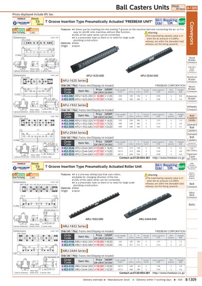 PRICESDISPLAYEDINCLUDE8%TAX.AFU-1625-600AFU-2544-540ARU-1832-580ARU-2444-540AVIEWL1P2416152415181230*30291121632258.5163/8"BALL(∅9.525)RC1/8WHENLIFTED(STROKE3MM)AARROWVIEWTGROOVEDIMENSIONAFU-1625DIMENSIONS37162234*16.53313.510.53231936RC1/81/2"BALL(∅12.7)PL1183014143014AVIEWWHENLIFTED(STROKE3MM)AARROWVIEWTGROOVEDIMENSIONAFU-1932DIMENSIONSRC1/446*204628254417.5PL11813.5453.523.5(∅15.875)5/8"BALL48361636168AVIEWWHENLIFTED(STROKE3MM)AARROWVIEWTGROOVEDIMENSIONAFU-2544DIMENSIONS34*163722ROLLERDIAMETER∅17RC1/8(12.5)1319.5(16.5)1719.5PL13212183.53310.513.51636AVIEWWHENLIFTED(STROKE3MM)AARROWVIEWTGROOVEDIMENSION*ARU-1832-580WILLBETHEDIMENSIONSINTHE().ARU-1832DIMENSIONSAVIEWRC1/4ROLLERDIAMETER∅242846*204630545182224134413.548L16139.52361P23WHENLIFTED(STROKE3MM)AARROWVIEWTGROOVEDIMENSIONARU-2444DIMENSIONS(UNIT:MM)(UNIT:MM)(UNIT:MM)(UNIT:MM)(UNIT:MM)FREEBEARTGROOVEINSERTIONTYPEPNEUMATICALLYACTUATED"FREEBEARUNIT"MADETOORDERREPAIRINGOKFREEBEARTGROOVEINSERTIONTYPEPNEUMATICALLYACTUATEDROLLERUNITMADETOORDERREPAIRINGOKORDERCODEITEMNO.PRICE(PERPIECE)MSRP(PERPIECE)TOTALLENGTH(MM)L1(MM)P(MM)STROKE(MM)LOADCAPACITY(KN)SPQ(PIECE)WEIGHT(KG)★453-4182ARU-2444-300¥108,000¥100,000297.52286031.9622.4★453-4191ARU-2444-540¥196,560¥182,000537.546830033.9224.5CONTACTUS:0120-054-381HTTP://WWW.FREEBEAR.CO.JP/ORDERCODEITEMNO.PRICE(PERPIECE)MSRP(PERPIECE)TOTALLENGTH(MM)L1(MM)P(MM)STROKE(MM)LOADCAPACITY(KN)SPQ(PIECE)WEIGHT(KG)★453-4166ARU-1832-325¥108,000¥100,00032529525631.5721.5★453-4174ARU-1832-580¥196,560¥182,00058055151233.1422.7ORDERCODEITEMNO.PRICE(PERPIECE)MSRP(PERPIECE)TOTALLENGTH(MM)L1(MM)P(MM)STROKE(MM)LOADCAPACITY(KN)SPQ(PIECE)WEIGHT(KG)★453-3526AFU-2544-300¥103,680¥96,000297.527216831.9622.6★453-3534AFU-2544-540¥187,920¥174,000537.551240833.9224.8★453-3542AFU-2544-680¥237,600¥220,000681.565655234.9026.0CONTACTUS:0120-054-381HTTP://WWW.FREEBEAR.CO.JP/ORDERCODEITEMNO.PRICE(PERPIECE)MSRP(PERPIECE)TOTALLENGTH(MM)L1(MM)P(MM)STROKE(MM)LOADCAPACITY(KN)SPQ(PIECE)WEIGHT(KG)★453-3488AFU-1932-325¥103,680¥96,00032529320531.5721.5★453-3496AFU-1932-580¥187,920¥174,00058054846033.1422.6★453-3500AFU-1932-680¥237,600¥220,00068064856033.5323.1ORDERCODEITEMNO.PRICE(PERPIECE)MSRP(PERPIECE)TOTALLENGTH(MM)L1(MM)P(MM)STROKE(MM)LOADCAPACITY(KN)SPQ(PIECE)WEIGHT(KG)★453-3461AFU-1625-200¥65,880¥61,00020018410630.5920.8★453-3470AFU-1625-600¥187,920¥174,00060058450632.0622.2STOCK73ITEMSSTOCK73ITEMSORDERUNIT:1PIECEFACTORYDIRECTSHIPPINGNOTINCLUDEDFREEBEARCORPORATIONORDERUNIT:1PIECEFACTORYDIRECTSHIPPINGNOTINCLUDEDORDERUNIT:1PIECEFACTORYDIRECTSHIPPINGNOTINCLUDEDORDERUNIT:1PIECEFACTORYDIRECTSHIPPINGNOTINCLUDEDFREEBEARCORPORATIONORDERUNIT:1PIECEFACTORYDIRECTSHIPPINGNOTINCLUDEDGREENPURCHASING.COMECOFEATURES●ITDRIVESJUSTBYINSERTINGINTOTHEEXISTINGTGROOVEONTHEMACHINEBEDANDCONNECTINGTHEAIR,SOITISEASYTORETROFITONTOMACHINESWITHOUTLIFTERFUNCTION.●UNITSOFTHESAMESERIESCANBECONNECTED.●ITISAPNEUMATICTYPESOTHEREISNONEEDFORLARGESCALEPLUMBINGCONSTRUCTION.MATERIALS●STEELORIGIN●JAPAN●THELOADBEARINGCAPACITYVALUEISOFWHENTHEAIRPRESSUREIS0.5MPA.●ALWAYSUSEWITHINTHEALLOWABLELOAD.●ALWAYSUSETHISFACINGUPWARDS.AFU-1625SERIESAFU-1932SERIESAFU-2544SERIESGREENPURCHASING.COMECOFEATURES●ITISAONE-WAYSLIDINGTYPETHATUSESROLLERS.●SUITABLEFORCHANGINGDIRECTIONOFTHELINE.●UNITSOFTHESAMESERIESCANBECONNECTED.●ITISAPNEUMATICTYPESOTHEREISNONEEDFORLARGESCALEPLUMBINGCONSTRUCTION.MATERIALS●STEELORIGIN●JAPAN●THELOADBEARINGCAPACITYVALUEISOFWHENTHEAIRPRESSUREIS0.5MPA.●ALWAYSUSEWITHINTHEALLOWABLELOAD.●ALWAYSUSETHISFACINGUPWARDS.ARU-1832SERIESARU-2444SERIESWARNINGWARNING.COMCAD.COMCADCONVEYORSSTEELROLLERCONVEYORSSTAINLESSSTEELROLLERCONVEYORSALUMINUMROLLERCONVEYORSRESINROLLERCONVEYORSEXTENSIONROLLERCONVEYORSWHEELSCONVEYORSBALLCASTERSUNITSUPWARDBALLCASTERSDOWNWARDBALLCASTERSUPWARD/DOWNWARDCOMBINEDUSEBALLCASTERSCLEANROOMTYPEBALLCASTERSBALLCASTERSFORSPECIALPURPOSEMOTORPULLEYS,MOTORROLLERSBELTCONVEYORSMINIBELTCONVEYORSBELTSBALLCASTERSUNITSSTOCK31ITEMS8-1309*0509370*8-1309DELIVERYESTIMATE★…MANUFACTURERSTOCK★…DELIVERYWITHIN7WORKINGDAYS★…ASK