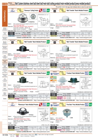THENUMBERNEXTTOTHELOGOMARKINDICATESITEMSINSTOCKFOREACHBRAND.IP-16W2051(Φ29)(4)341Φ5/8"DRAINHOLEX52-Φ4.5DIMENSIONS(UNIT:MM)DIMENSIONS(UNIT:MM)IP-16B2051(Φ29)(4)341DRAINHOLEX52-Φ4.5Φ5/8"DIMENSIONS(UNIT:MM)IP-25WΦ421"697.5DRAINHOLEX542734.5(UNIT:MM)DIMENSIONSIP-25BΦ421"697.5DRAINHOLEX542734.5(UNIT:MM)DIMENSIONS(UNIT:MM)DIMENSIONSJ-8Y-WHJ-8Y-BKC-8B267.3352025.40MM1"Φ50Φ44M81.5WIDTHX1.5DEPTH(P=1.25)Φ32DIMENSIONS(UNIT:MM)PV900FHSSΦ76.2Φ120206410016PCD140Φ1604-Φ11R18PVP30J70562-Φ5.64614SΦ25.4R8R333176956Φ42350317.523.52-Φ5.51°(POM)(25.40MM)(UNIT:MM)DIMENSIONSATEC"PLANEVEYOR"CUTTINGPRODUCTMADETOORDERSTOCK92ITEMSORDERCODEITEMNO.PRICE(PERPIECE)MSRP(PERPIECE)ALLOWABLEWEIGHT(KG)SPQ(PIECE)WEIGHT(G)★856-0285PV900FHS¥165,240¥180,000180015560CONTACTUS:0562-85-3101HTTP://WWW.PLANEVEYOR.COM/ATEC"PLANEVEYOR"RESINMOLDEDPRODUCTMADETOORDERORDERUNIT:1PIECEATECCO.,LTD.ORDERCODEITEMNO.PRICE(PERPIECE)MSRP(PERPIECE)ALLOWABLEWEIGHT(KG)SPQ(PIECE)WEIGHT(G)856-0333PVP30J¥826¥90081038CONTACTUS:0562-85-3101HTTP://WWW.PLANEVEYOR.COM/IGUCHIKIKO"BALLTRANSFER"RESINMOLDEDPRODUCTORDERCODEITEMNO.PRICE(PERPIECE)MSRP(PERPIECE)ALLOWABLEWEIGHT(KG)SPQ(PIECE)WEIGHT(G)395-0115IP-16B¥1,491¥1,70031010CONTACTUS:03-3923-1211HTTP://WWW.ISB-IGUCHI.COM/STOCK90ITEMSORDERUNIT:1PIECEIGUCHIKIKOCO.LTD.IGUCHIKIKO"BALLTRANSFER"RESINMOLDEDPRODUCTORDERCODEITEMNO.PRICE(PERPIECE)MSRP(PERPIECE)ALLOWABLEWEIGHT(KG)SPQ(PIECE)WEIGHT(G)290-2176IP-25B¥1,888¥2,150101030CONTACTUS:03-3923-1211HTTP://WWW.ISB-IGUCHI.COM/STOCK90ITEMSORDERUNIT:1PIECEIGUCHIKIKOCO.LTD.ORDERUNIT:1PIECEFACTORYDIRECTNOFREIGHTCHARGEEXCLUDINGREMOTEISLANDSATECCO.,LTD.SPECS●DUALPURPOSEUPWARD/DOWNWARD(ORIGINALSPHERICALSURFACE)MATERIALS●MAINBALL:POLYACETATE(POM)●SUB-BALL:SUS304●BODY:POM●BALLRECEIVER:POMORIGIN●JAPANSPECS●FORUPWARDFACINGTYPE(ORIGINALSPHERICALSURFACE)●DIRTDISCHARGETYPEMATERIALS●MAINBALL:STAINLESSSTEEL(SUS440C)●SUB-BALL:SUS440C●BODY:AI●BALLRECEIVER:SUS440CSPECS●FORUPWARDMATERIALS●MAINBALL:CONDUCTIVEULTRAHIGHMOLECULARWEIGHT(ESDUHMWPE)●BODY/CAP:POLYACETATE(POM)ORIGIN●JAPANSPECS●FORUPWARD●WATERDRAINHOLEASSTANDARDEQUIPMENTONTHEBOTTOMMATERIALS●MAINBALL:CONDUCTIVEULTRAHIGHMOLECULARWEIGHT(ESDUHMWPE)●BODY:POLYACETATE(POM)ORIGIN●JAPANORIGIN●JAPANIGUCHIKIKO"BALLTRANSFER"RESINMOLDEDPRODUCTORDERCODEITEMNO.PRICE(PERPIECE)MSRP(PERPIECE)ALLOWABLEWEIGHT(KG)SPQ(PIECE)WEIGHT(G)395-0140IP-16W¥789¥90032010CONTACTUS:03-3923-1211HTTP://WWW.ISB-IGUCHI.COM/STOCK90ITEMSORDERUNIT:1PIECEIGUCHIKIKOCO.LTD.IGUCHIKIKO"BALLTRANSFER"RESINMOLDEDPRODUCTORDERCODEITEMNO.PRICE(PERPIECE)MSRP(PERPIECE)ALLOWABLEWEIGHT(KG)SPQ(PIECE)WEIGHT(G)290-2168IP-25W¥966¥1,100102030CONTACTUS:03-3923-1211HTTP://WWW.ISB-IGUCHI.COM/STOCK90ITEMSORDERUNIT:1PIECEIGUCHIKIKOCO.LTD.FREEBEAR"FREEBEAR"RESINMOLDEDPRODUCTMADETOORDERSTOCK73ITEMSORDERCODEITEMNO.PRICE(PERPIECE)MSRP(PERPIECE)ALLOWABLEWEIGHT(KG)SPQ(PIECE)WEIGHT(G)434-8397J-8Y-WH¥913¥1,0401012039434-8389J-8Y-BK¥913¥1,0401012039CONTACTUS:0120-054-381HTTP://WWW.FREEBEAR.CO.JP/ORDERUNIT:1PIECEFREEBEARCORPORATIONFREEBEAR"FREEBEAR"PRESSMOLDEDPRODUCTMADETOORDERORDERCODEITEMNO.PRICE(PERPIECE)MSRP(PERPIECE)ALLOWABLEWEIGHT(KG)SPQ(PIECE)WEIGHT(G)500-5752C-8B¥755¥8603040166CONTACTUS:0120-054-381HTTP://WWW.FREEBEAR.CO.JP/STOCK73ITEMSORDERUNIT:1PIECEFREEBEARCORPORATIONGREENPURCHASING.COMECO.COMCADCHEMICALCONTENTINSPECTIONGREENPURCHASING.COMECO.COMCADSPECS●FORUPWARDMATERIALS●MAINBALL:STEEL●BODY:STEELORIGIN●JAPANSPECS●FORUPWARDMATERIALS●MAINBALL:POLYACETATE(POM)●SMALLBALL:STAINLESSSTEEL(SUS304)●BODY:POLYACETATE(POM)ORIGIN●JAPANSPECS●FORUPWARDMATERIALS●MAINBALL/SUB-BALL:POLYACETAL(POM)●BODY/CAP:POLYACETATE(POM)ORIGIN●JAPANSPECS●FORUPWARD●WATERDRAINHOLEASSTANDARDEQUIPMENTONTHEBOTTOMMATERIALS●MAINBALL/SUB-BALL:POLYACETAL(POM)●BODY:POLYACETATE(POM)ORIGIN●JAPANCONVEYORSSTEELROLLERCONVEYORSSTAINLESSSTEELROLLERCONVEYORSALUMINUMROLLERCONVEYORSRESINROLLERCONVEYORSEXTENSIONROLLERCONVEYORSWHEELSCONVEYORSBALLCASTERSUNITSUPWARDBALLCASTERSDOWNWARDBALLCASTERSUPWARD/DOWNWARDCOMBINEDUSEBALLCASTERSCLEANROOMTYPEBALLCASTERSBALLCASTERSFORSPECIALPURPOSEMOTORPULLEYS,MOTORROLLERSBELTCONVEYORSMINIBELTCONVEYORSBELTSSTOCK147ITEMSBALLCASTERS(STAINLESSSTEELBALL/STEELBALL/RESINBALL/CUTTINGPRODUCT/RESINMOLDEDPRODUCT/PRESSMOLDEDPRODUCT)8-1332*0509581*8-1332ORDERCODEYELLOW…INSTANTDELIVERY(JAPANONLY)BLUE…BACKORDER(CARRIAGEEXCLUDED)ITEMNO.PINK…STOCKININDONESIA/THAILAND