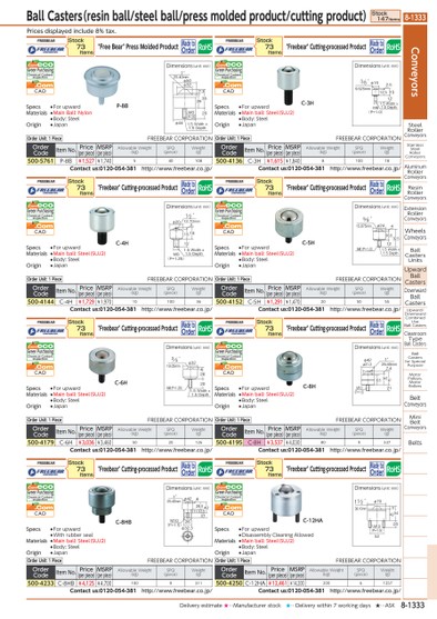 PRICESDISPLAYEDINCLUDE8%TAX.C-4HΦ2012.70MM31518121.5WIDTHX1.5DEPTHM8(P=1.25)12"DIMENSIONS(UNIT:MM)C-5HΦ2415.875MM432.516.5121.5WIDTHX1.5DEPTHM6(P=1.0)58"DIMENSIONS(UNIT:MM)C-6HΦ324262019.05MM1.5WIDTHX1.5DEPTHM8(P=1.25)34"DIMENSIONS(UNIT:MM)C-3HΦ159.525MM2.51512.5121.5WIDTHX1.5DEPTHM6(P=1.0)38"(UNIT:MM)DIMENSIONSC-8HΦ42Φ31.37.41"25.40MM34.6422130.5M10(P=1.5)C-8HBΦ422641"25.40MM422128.51113.5Φ32.3M10(P=1.5)DIMENSIONS(UNIT:MM)DIMENSIONS(UNIT:MM)P-8B267.3352025.40MM1"Φ50Φ44M81.5WIDTHX1.5DEPTH(P=1.25)Φ32(UNIT:MM)DIMENSIONSC-12HAΦ7052M10(P=1.5)1138.10MM542843112"DIMENSIONS(UNIT:MM)FREEBEAR"FREEBEAR"PRESSMOLDEDPRODUCTMADETOORDERORDERCODEITEMNO.PRICE(PERPIECE)MSRP(PERPIECE)ALLOWABLEWEIGHT(KG)SPQ(PIECE)WEIGHT(G)500-5761P-8B¥1,527¥1,740540108CONTACTUS:0120-054-381HTTP://WWW.FREEBEAR.CO.JP/STOCK73ITEMSORDERUNIT:1PIECEFREEBEARCORPORATIONFREEBEAR"FREEBEAR"CUTTING-PROCESSEDPRODUCTMADETOORDERORDERCODEITEMNO.PRICE(PERPIECE)MSRP(PERPIECE)ALLOWABLEWEIGHT(KG)SPQ(PIECE)WEIGHT(G)500-4144C-4H¥1,729¥1,9701010036CONTACTUS:0120-054-381HTTP://WWW.FREEBEAR.CO.JP/STOCK73ITEMSORDERUNIT:1PIECEFREEBEARCORPORATIONFREEBEAR"FREEBEAR"CUTTING-PROCESSEDPRODUCTMADETOORDERORDERCODEITEMNO.PRICE(PERPIECE)MSRP(PERPIECE)ALLOWABLEWEIGHT(KG)SPQ(PIECE)WEIGHT(G)500-4179C-6H¥3,036¥3,4605020126CONTACTUS:0120-054-381HTTP://WWW.FREEBEAR.CO.JP/STOCK73ITEMSORDERUNIT:1PIECEFREEBEARCORPORATIONFREEBEAR"FREEBEAR"CUTTING-PROCESSEDPRODUCTMADETOORDERORDERCODEITEMNO.PRICE(PERPIECE)MSRP(PERPIECE)ALLOWABLEWEIGHT(KG)SPQ(PIECE)WEIGHT(G)500-4233C-8HB¥4,125¥4,7001009311CONTACTUS:0120-054-381HTTP://WWW.FREEBEAR.CO.JP/STOCK73ITEMSORDERUNIT:1PIECEFREEBEARCORPORATIONCHEMICALCONTENTINSPECTIONGREENPURCHASING.COMECO.COMCADSPECS●FORUPWARDMATERIALS●MAINBALL:NYLON●BODY:STEELORIGIN●JAPANCHEMICALCONTENTINSPECTIONGREENPURCHASING.COMECO.COMCADSPECS●FORUPWARDMATERIALS●MAINBALL:STEEL(SUJ2)●BODY:STEELORIGIN●JAPANCHEMICALCONTENTINSPECTIONGREENPURCHASING.COMECO.COMCADSPECS●FORUPWARDMATERIALS●MAINBALL:STEEL(SUJ2)●BODY:STEELORIGIN●JAPANCHEMICALCONTENTINSPECTIONGREENPURCHASING.COMECO.COMCADSPECS●FORUPWARD●WITHRUBBERSEALMATERIALS●MAINBALL:STEEL(SUJ2)●BODY:STEELORIGIN●JAPANFREEBEAR"FREEBEAR"CUTTING-PROCESSEDPRODUCTMADETOORDERORDERCODEITEMNO.PRICE(PERPIECE)MSRP(PERPIECE)ALLOWABLEWEIGHT(KG)SPQ(PIECE)WEIGHT(G)500-4136C-3H¥1,615¥1,840810018CONTACTUS:0120-054-381HTTP://WWW.FREEBEAR.CO.JP/STOCK73ITEMSORDERUNIT:1PIECEFREEBEARCORPORATIONFREEBEAR"FREEBEAR"CUTTING-PROCESSEDPRODUCTMADETOORDERORDERCODEITEMNO.PRICE(PERPIECE)MSRP(PERPIECE)ALLOWABLEWEIGHT(KG)SPQ(PIECE)WEIGHT(G)500-4152C-5H¥1,291¥1,470205055CONTACTUS:0120-054-381HTTP://WWW.FREEBEAR.CO.JP/STOCK73ITEMSORDERUNIT:1PIECEFREEBEARCORPORATIONFREEBEAR"FREEBEAR"CUTTING-PROCESSEDPRODUCTMADETOORDERORDERCODEITEMNO.PRICE(PERPIECE)MSRP(PERPIECE)ALLOWABLEWEIGHT(KG)SPQ(PIECE)WEIGHT(G)500-4195C-8H¥3,537¥4,030809337CONTACTUS:0120-054-381HTTP://WWW.FREEBEAR.CO.JP/STOCK73ITEMSORDERUNIT:1PIECEFREEBEARCORPORATIONFREEBEAR"FREEBEAR"CUTTING-PROCESSEDPRODUCTMADETOORDERORDERCODEITEMNO.PRICE(PERPIECE)MSRP(PERPIECE)ALLOWABLEWEIGHT(KG)SPQ(PIECE)WEIGHT(G)500-4250C-12HA¥12,461¥14,20020061257CONTACTUS:0120-054-381HTTP://WWW.FREEBEAR.CO.JP/STOCK73ITEMSORDERUNIT:1PIECEFREEBEARCORPORATIONCHEMICALCONTENTINSPECTIONGREENPURCHASING.COMECO.COMCADSPECS●FORUPWARDMATERIALS●MAINBALL:STEEL(SUJ2)●BODY:STEELORIGIN●JAPANCHEMICALCONTENTINSPECTIONGREENPURCHASING.COMECO.COMCADSPECS●FORUPWARDMATERIALS●MAINBALL:STEEL(SUJ2)●BODY:STEELORIGIN●JAPANCHEMICALCONTENTINSPECTIONGREENPURCHASING.COMECO.COMCADSPECS●FORUPWARDMATERIALS●MAINBALL:STEEL(SUJ2)●BODY:STEELORIGIN●JAPANCHEMICALCONTENTINSPECTIONGREENPURCHASING.COMECO.COMCADSPECS●FORUPWARD●DISASSEMBLYCLEANINGALLOWEDMATERIALS●MAINBALL:STEEL(SUJ2)●BODY:STEELORIGIN●JAPANCONVEYORSSTEELROLLERCONVEYORSSTAINLESSSTEELROLLERCONVEYORSALUMINUMROLLERCONVEYORSRESINROLLERCONVEYORSEXTENSIONROLLERCONVEYORSWHEELSCONVEYORSBALLCASTERSUNITSUPWARDBALLCASTERSDOWNWARDBALLCASTERSUPWARD/DOWNWARDCOMBINEDUSEBALLCASTERSCLEANROOMTYPEBALLCASTERSBALLCASTERSFORSPECIALPURPOSEMOTORPULLEYS,MOTORROLLERSBELTCONVEYORSMINIBELTCONVEYORSBELTSBALLCASTERS(RESINBALL/STEELBALL/PRESSMOLDEDPRODUCT/CUTTINGPRODUCT)STOCK147ITEMS8-1333*0509511*8-1333DELIVERYESTIMATE★…MANUFACTURERSTOCK★…DELIVERYWITHIN7WORKINGDAYS★…ASK