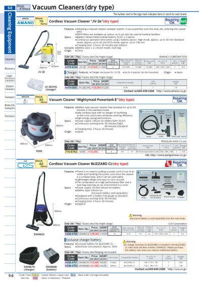 THENUMBERNEXTTOTHELOGOMARKINDICATESITEMSINSTOCKFOREACHBRAND.290MM420MM460MMJV-2EJV-2ECHG(CHARGER)350MM485MM360MM93955949670(CHARGER)5949688(BATTERY)5949653375MM390MM360MMHOSECREVICENOZZLEROUNDBRUSHCOMBINATIONNOZZLETELESCOPICWANDPAPERBAGTOOLADAPTERHOSENOZZLEFORFLOORNOZZLE/BRUSHFORFURNITURECREVICENOZZLEEXTENSIONPIPESETROUNDBRUSHCHARGERDUSTBAGACCESSORIESACCESSORIESCXSCORDLESSVACUUMCLEANERBLIZZARDCL(DRYTYPE)REPAIRINGOKSTOCK42ITEMSORDERUNIT:1PIECEFACTORYDIRECTSHIPPINGNOTINCLUDEDORDERCODEITEMNO.PRICE(PERPIECE)MSRP(PERPIECE)ITEMNAMECOMPATIBLEMODELWXDXH(MM)SPQ(PIECE)WEIGHT(KG)★836-47015949670¥22,680¥24,000CHARGERBLIZZARDCL140X170X8810.65★836-47025949688¥41,580¥44,000BATTERYBLIZZARDCL130X88X17011.85CONTACTUS:045-640-2280HTTP://CXS.CO.JP/ORDERUNIT:1PIECEFACTORYDIRECTNOFREIGHTCHARGECXSCORPORATIONORDERCODEITEMNO.PRICE(PERPIECE)MSRP(PERPIECE)DUSTCOLLECTIONCAPACITY(L)MAXVACUUMPRESSURE(KPA)MAXAIRVOLUME(M3/MIN)NOISELEVEL(DB)WXDXH(MM)SPQ(PIECE)WEIGHT(KG)★836-47005949653¥98,280¥104,00085.140.762375X390X36018.3AMANOCORDLESSVACUUMCLEANER"JV-2E"(DRYTYPE)REPAIRINGOKORDERCODEITEMNO.PRICE(PERPIECE)MSRP(PERPIECE)ADAPTATIONMODELSSPQ(PIECE)WEIGHT(KG)★474-0581JV-2ECHG¥28,080¥32,000JV-2E11.9CONTACTUS:045-439-2206HTTP://WWW.AMANO.CO.JP/ORDERCODEITEMNO.PRICE(PERPIECE)MSRP(PERPIECE)DUSTCOLLECTIONCAPACITY(L)MAXVACUUMPRESSURE(KPA)MAXAIRVOLUME(M3/MIN)NOISELEVEL(DB)WXDXH(MM)SPQ(PIECE)WEIGHT(KG)★470-8334JV-2E¥103,545¥118,000210.0(HIGH)1.4(HIGH)53(HIGH)290X420X460114.0STOCK70ITEMSORDERUNIT:1PIECEFACTORYDIRECTNOFREIGHTCHARGEAMANOCORPORATIONORDERUNIT:1PIECEFACTORYDIRECTNOFREIGHTCHARGEPENGUINVACUUMCLEANER"MIGHTYMAIDPOWERTANKⅡ"(DRYTYPE)REPAIRINGOKORDERCODEITEMNO.PRICE(PERPIECE)MSRP(PERPIECE)DUSTCOLLECTIONCAPACITY(L)MAXVACUUMPRESSURE(KPA)MAXAIRVOLUME(M3/MIN)NOISELEVEL(DB)WXDXH(MM)SPQ(PIECE)WEIGHT(KG)775-87829395¥162,000-69.02.765/62(STRONG/STANDARDMODE)350X485X36016.8STOCK33ITEMSURLHTTP://WWW.PENGUINWAX.CO.JP/ORDERUNIT:1PIECEPENGUINWAXCO.LTD.FEATURES●THEREISNONEEDTOPUTTINGAPOWERCORDIN/OUTOFANOUTLETANDHANDLINGTHEPOWERCORDSINCETHECLEANERISACORDLESSTYPE,ANDITCANBEUSEDSAFELY.●LIGHTWEIGHTDESIGNANDEASYTOCARRYAROUND.●THECOMBINATIONOFAHIGHPERFORMANCEFILTERANDADUSTBAGIMPROVESANAIRENVIRONMENTINAROOM.SPECS●POWERSUPPLY:DC36VLITHIUMIONBATTERY●BATTERYTYPE:LITHIUMION(EXCLUSIVEBATTERYSOLDSEPARATELY)●EQUIPPEDWITHABATTERYFUELGAUGEASSTANDARD●CONTINUOUSWORKINGTIME:40MINUTES●CHARGINGTIME:3HOURS30MINUTESORIGIN●ENGLANDFEATURES●EXCLUSIVEBATTERYFORBLIZZARDCL.SPECS●ELECTRICITYCONSUMPTION:APPROX.50WEXCLUSIVECHARGER/BATTERYFEATURES●CHARGEREXCLUSIVEFORJV-2E.●UPTO4PIECESCANBEMOUNTED.CHARGERFEATURES●ADOPTINGAMANUALROTATIONSWEEPERSYSTEM,ITCANPOWERFULLYSUCKFINEDUST,ETC.ENTERINGINTOCARPETPILES.●HEPAFILTERSAREAVAILABLEASOPTION,SOITCANALSOBEUSEDATMEDICALFACILITIES.SPECS●BATTERY:NICKEL-METAL-HYDRIDEBATTERY32.4VX2PIECES●CONTINUOUSOPERATIONTIME(WHENUSING2BATTERYPACKS):HIGHMODE,APPROX.UPTO40MIN/STANDARDMODE,APPROX.UPTO60MIN/ECOMODE,APPROX.UPTO100MIN●CHARGINGTIME:3HOURS30MINUTES(PERBATTERY)ACCESSORIES●BATTERYPACKX2,CREVICENOZZLE,DUSTBAGORIGIN●CHINAORIGIN●JAPANFEATURES●BATTERYTYPEVACUUMCLEANERTHATOPERATESFORUPTO60MINUTESINTHESTANDARDMODE.●SAFECORDLESSTYPEWITHNODANGEROFSTUMBLINGONTHECORD,ANDITALSOENHANCESWORKINGEFFICIENCY.●HIGHENERGYSAVINGPERFORMANCE.SPECS●POWERSUPPLY:LITHIUMIONBATTERY(6AH26.6V)●CONTINUOUSWORKINGTIME:45MINUTES(HIGH),60MINUTES(STANDARD)●CHARGINGTIME:3HOURS30MINUTESORIGIN●JAPAN●EXCLUSIVEBATTERYISSOLDSEPARATELYFROMTHEMAINBODY.WARNING●ACHARGEREXCLUSIVEFORBLIZZARDISINCLUDEDINTHEBLIZZARDCLMAINBODYSET(ITEMNUMBER:5949653).PLEASEPURCHASETHISBATTERYONLYWHENYOUNEEDANADDITIONALBATTERY.WARNINGCLEANINGEQUIPMENTCLEANERSBLOWERSHIGH-PRESSURECLEANERSSTEAMCLEANERSSWEEPERSRIDE-ONSWEEPERSPOLISHERSSTOCK470ITEMSVACUUMCLEANERS(DRYTYPE)9-8*0515172*9-8ORDERCODEYELLOW…INSTANTDELIVERY(JAPANONLY)BLUE…BACKORDER(CARRIAGEEXCLUDED)ITEMNO.PINK…STOCKININDONESIA/THAILAND