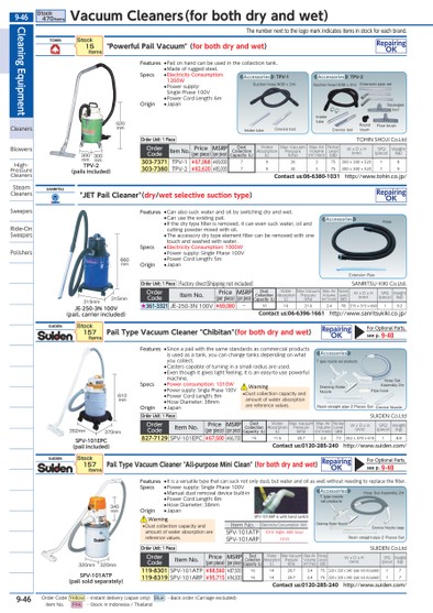 THENUMBERNEXTTOTHELOGOMARKINDICATESITEMSINSTOCKFOREACHBRAND.SPV-101ATP(PAILSOLDSEPARATELY)SPV-101ARPISWITHHANDSWITCHITEMNO.ELECTRICITYCONSUMPTION(W)SPV-101ATP1010(HIGH),600(LOW)SPV-101ARP1010340MM320MM320MMDRAININGWATERNOZZLEHOSESETASSEMBLY2MCREVICENOZZLELARGETTYPENOZZLESETPRODUCTSRESINSTRAIGHTPIPE2PIECESSET610MM352MM370MMSPV-101EPC(PAILINCLUDED)HOSESETASSEMBLY2MCREVICENOZZLETTYPENOZZLESETPRODUCTSRESINSTRAIGHTPIPE2PIECESSETJE-250-3N100V(PAIL,CARRIERINCLUDED)660MM315MM315MMTPV-2(PAILSINCLUDED)520MM300MM300MMDRAININGWATERNOZZLEPIPEHOOKHOSEEXTENSIONPIPETPV-1TPV-2INTAKETUBECREVICETOOLSUCTIONHOSE(Φ38X2M)SUCTIONHOSE(Φ38X2M)EXTENSIONPIPESETSQUEEGEETOOLFLOORBRUSHROUNDBRUSHCREVICETOOLINTAKETUBEACCESSORIESACCESSORIESACCESSORIESACCESSORIESACCESSORIESSUIDENPAILTYPEVACUUMCLEANER"ALL-PURPOSEMINICLEAN"(FORBOTHDRYANDWET)REPAIRINGOKORDERCODEITEMNO.PRICE(PERPIECE)MSRP(PERPIECE)DUSTCOLLECTIONCAPACITY(L)WATERABSORPTION(L)MAXVACUUMPRESSURE(KPA)MAXAIRVOLUME(M3/MIN)NOISELEVEL(DB)WXDXH(MM)SPQ(PIECE)WEIGHT(KG)119-8301SPV-101ATP¥88,560¥87,500161420.73.475320X320X340(PAILNOTINCLUDED)17119-8319SPV-101ARP¥95,715¥94,500161420.73.475320X320X340(PAILNOTINCLUDED)17CONTACTUS:0120-285-240HTTP://WWW.SUIDEN.COM/STOCK157ITEMSORDERUNIT:1PIECESUIDENCO.LTDSUIDENPAILTYPEVACUUMCLEANER"CHIBITAN"(FORBOTHDRYANDWET)REPAIRINGOKORDERCODEITEMNO.PRICE(PERPIECE)MSRP(PERPIECE)DUSTCOLLECTIONCAPACITY(L)WATERABSORPTION(L)MAXVACUUMPRESSURE(KPA)MAXAIRVOLUME(M3/MIN)NOISELEVEL(DB)WXDXH(MM)SPQ(PIECE)WEIGHT(KG)827-7129SPV-101EPC¥67,500¥66,7001611.520.72.373352X370X61018.8CONTACTUS:0120-285-240HTTP://WWW.SUIDEN.COM/STOCK157ITEMSORDERUNIT:1PIECESUIDENCO.LTDSANRITSU"JETPAILCLEANER"(DRY/WETSELECTIVESUCTIONTYPE)REPAIRINGOKORDERCODEITEMNO.PRICE(PERPIECE)MSRP(PERPIECE)DUSTCOLLECTIONCAPACITY(L)WATERABSORPTION(L)MAXVACUUMPRESSURE(KPA)MAXAIRVOLUME(M3/MIN)NOISELEVEL(DB)WXDXH(MM)SPQ(PIECE)WEIGHT(KG)★361-3321JE-250-3N100V¥69,080-101021.62.478315X315X66019.2CONTACTUS:06-6396-1661HTTP://WWW.SANRITSUKIKI.CO.JP/ORDERUNIT:1PIECEFACTORYDIRECTSHIPPINGNOTINCLUDEDSANRITSU・KIKICO.LTD.TOHIN"POWERFULPAILVACUUM"(FORBOTHDRYANDWET)REPAIRINGOKORDERCODEITEMNO.PRICE(PERPIECE)MSRP(PERPIECE)DUSTCOLLECTIONCAPACITY(L)WATERABSORPTION(L)MAXVACUUMPRESSURE(KPA)MAXAIRVOLUME(M3/MIN)NOISELEVEL(DB)WXDXH(MM)SPQ(PIECE)WEIGHT(KG)303-7371TPV-1¥67,068¥69,0007930375300X300X52018303-7380TPV-2¥82,620¥85,0007930375300X300X52019CONTACTUS:06-6380-1031HTTP://WWW.TOHIN.CO.JP/STOCK15ITEMSORDERUNIT:1PIECETOHINSHOJICO.LTDFEATURES●ITISAVERSATILETYPETHATCANSUCKNOTONLYDUST,BUTWATERANDOILASWELLWITHOUTNEEDINGTOREPLACETHEFILTER.SPECS●POWERSUPPLY:SINGLEPHASE100V●MANUALDUSTREMOVALDEVICEBUILT-IN●POWERCORDLENGTH:8M●HOSEDIAMETER:38MMORIGIN●JAPAN●DUSTCOLLECTIONCAPACITYANDAMOUNTOFWATERABSORPTIONAREREFERENCEVALUES.WARNINGFEATURES●SINCEAPAILWITHTHESAMESTANDARDSASCOMMERCIALPRODUCTSISUSEDASATANK,YOUCANCHANGETANKSDEPENDINGONWHATYOUCOLLECT.●CASTERSCAPABLEOFTURNINGINASMALLRADIUSAREUSED.●EVENTHOUGHITGIVESLIGHTFEELING,ITISANEASY-TO-USEPOWERFULMACHINE.SPECS●POWERCONSUMPTION:1010W●POWERSUPPLY:SINGLEPHASE100V●POWERCORDLENGTH:8M●HOSEDIAMETER:38MMORIGIN●JAPAN●DUSTCOLLECTIONCAPACITYANDAMOUNTOFWATERABSORPTIONAREREFERENCEVALUES.WARNINGFEATURES●CANALSOSUCKWATERANDOILBYSWITCHINGDRYANDWET.●CANUSETHEEXISTINGPAIL.●IFTHEDRYTYPEFILTERISREMOVED,ITCANEVENSUCKWATER,OILANDCUTTINGPOWDERMIXEDWITHOIL.●THEACCESSORYDRYTYPEELEMENTFILTERCANBEREMOVEDWITHONETOUCHANDWASHEDWITHWATER.SPECS●ELECTRICITYCONSUMPTION:1000W●POWERSUPPLY:SINGLEPHASE100V●POWERCORDLENGTH:5MORIGIN●JAPANFEATURES●PAILONHANDCANBEUSEDINTHECOLLECTIONTANK.●MADEOFRUGGEDSTEEL.SPECS●ELECTRICITYCONSUMPTION:1200W●POWERSUPPLY:SINGLEPHASE100V●POWERCORDLENGTH:6MORIGIN●JAPANFOROPTIONALPARTS,SEEP.9-40FOROPTIONALPARTS,SEEP.9-40CLEANINGEQUIPMENTCLEANERSBLOWERSHIGH-PRESSURECLEANERSSTEAMCLEANERSSWEEPERSRIDE-ONSWEEPERSPOLISHERSSTOCK470ITEMSVACUUMCLEANERS(FORBOTHDRYANDWET)9-46*0515532*9-46ORDERCODEYELLOW…INSTANTDELIVERY(JAPANONLY)BLUE…BACKORDER(CARRIAGEEXCLUDED)ITEMNO.PINK…STOCKININDONESIA/THAILAND