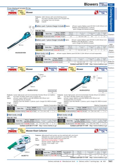 PRICESDISPLAYEDINCLUDE8%TAX.921MM204MM142MMMUB360DWBX905MM194MM141MMMUB361DPG2930MM295MM205MMMUB362DPG2MUB07101060MMNOISELEVEL(DB)79NOISELEVEL(DB)86MAKITABLOWERREPAIRINGOKSTOCK490ITEMSMAKITABLOWERREPAIRINGOKSTOCK490ITEMSORDERUNIT:1PIECEMAKITACORPORATIONORDERCODEITEMNO.PRICE(PERPIECE)MSRP(PERPIECE)MAXAIRVOLUME(M3/MIN)WXDXH(MM)SPQ(PIECE)WEIGHT(KG)858-6464MUB361DPG2¥84,132¥77,9004.4141X905X19413.1MAKITABLOWER/DUSTCOLLECTORREPAIRINGOKSTOCK490ITEMSORDERUNIT:1PIECEMAKITACORPORATIONORDERCODEITEMNO.PRICE(PERPIECE)MSRP(PERPIECE)DUSTCOLLECTIONCAPACITY(L)MAXAIRVOLUME(M3/MIN)TOTALLENGTH(MM)SPQ(PIECE)WEIGHT(KG)858-6459MUB0710¥21,708¥20,100258.6106014.5CONTACTUS:0120-17-1197HTTP://WWW.MAKITA.CO.JP/ORDERUNIT:1PIECEORDERCODEITEMNO.PRICE(PERPIECE)MSRP(PERPIECE)MAXAIRVOLUME(M3/MIN)WXDXH(MM)SPQ(PIECE)WEIGHT(KG)858-6463MUB361DZ¥26,460¥24,5004.4141X905X19413.1CONTACTUS:0120-17-1197HTTP://WWW.MAKITA.CO.JP/ORDERUNIT:1PIECEORDERCODEITEMNO.PRICE(PERPIECE)MSRP(PERPIECE)MAXAIRVOLUME(M3/MIN)WXDXH(MM)NOISELEVEL(DB)SPQ(PIECE)WEIGHT(KG)858-6462MUB360DZ¥21,816¥20,2004.4142X921X2048611.8CONTACTUS:0120-17-1197HTTP://WWW.MAKITA.CO.JP/ORDERUNIT:1PIECEORDERCODEITEMNO.PRICE(PERPIECE)MSRP(PERPIECE)MAXAIRVOLUME(M3/MIN)WXDXH(MM)NOISELEVEL(DB)SPQ(PIECE)WEIGHT(KG)858-6461MUB360DWB¥54,108¥50,1004.4142X921X2048613.1ORDERUNIT:1PIECEMAKITACORPORATIONORDERCODEITEMNO.PRICE(PERPIECE)MSRP(PERPIECE)MAXAIRVOLUME(M3/MIN)WXDXH(MM)NOISELEVEL(DB)SPQ(PIECE)WEIGHT(KG)858-6460MUB360DWBX¥76,464¥70,8004.4142X921X2048613.1FEATURES●36VBLOWERWITHOVERWHELMINGPOWER.USE●TOBLOWOFFFALLENLEAVESANDCUTGRASSETC.SPECS●CHARGINGTIME:60MINUTESORIGIN●JAPANSPECS●POWERSUPPLY:BATTERYPACK(DC36V/2.2AHLITHIUMION)●BATTERYPACK(BL3622A)X2PIECES,QUICKCHARGER(DC36WA)INCLUDEDBATTERYPACK2PIECES/CHARGERINCLUDEDSPECS●POWERSUPPLY:BATTERYPACK(DC36V/2.2AHLITHIUMION)●BATTERYPACK(BL3622A)X1PIECE,QUICKCHARGER(DC36WA)INCLUDEDBATTERYPACK1PIECE/CHARGERINCLUDEDSPECS●POWERSUPPLY:BATTERYPACK(DC36V/2.2AHLITHIUMION)SOLDSEPARATELYMAINBODYONLYMAINBODYONLYFEATURES●BLOWING-OFFANDSUCTIONCANBESWITCHEDWITHONETOUCH.●STEPLESSAIRVOLUMEADJUSTMENTISPOSSIBLEWITHADIAL.USE●TOBLOWOFFFALLENLEAVESANDCUTGRASSETC.SPECS●ELECTRICITYCONSUMPTION:1100W●POWERSUPPLY:SINGLEPHASE100V●POWERCORDLENGTH:10MORIGIN●JAPANFEATURES●USESHIGH-POWERANDENVIRONMENTALLYFRIENDLYLITHIUMIONBATTERY.USE●TOBLOWOFFFALLENLEAVESANDCUTGRASSETC.SPECS●POWERSUPPLY:BATTERYPACK(BL1860B/6.0AHLITHIUMION)●CHARGINGTIME:55MINUTES●BATTERYPACK(BL1860B)X2PIECES,QUICKCHARGER(DL18RD)INCLUDEDORIGIN●JAPANMAKITABLOWERREPAIRINGOKSTOCK490ITEMSORDERUNIT:1PIECEMAKITACORPORATIONORDERCODEITEMNO.PRICE(PERPIECE)MSRP(PERPIECE)MAXAIRVOLUME(M3/MIN)WXDXH(MM)SPQ(PIECE)WEIGHT(KG)858-6466MUB362DPG2¥98,712¥91,40013.4205X930X29514.1ORDERUNIT:1PIECEORDERCODEITEMNO.PRICE(PERPIECE)MSRP(PERPIECE)MAXAIRVOLUME(M3/MIN)WXDXH(MM)SPQ(PIECE)WEIGHT(KG)858-6465MUB362DZ¥41,040¥38,00013.4205X930X29514.1CONTACTUS:0120-17-1197HTTP://WWW.MAKITA.CO.JP/MAINBODYONLYFEATURES●USESHIGH-POWERANDENVIRONMENTALLYFRIENDLYLITHIUMIONBATTERY.USE●TOBLOWOFFFALLENLEAVESANDCUTGRASSETC.SPECS●POWERSUPPLY:BATTERYPACK(BL1860B/6.0AHLITHIUMION)●CHARGINGTIME:55MINUTES●BATTERYPACK(BL1860B)X2PIECES,QUICKCHARGER(DL18RD)INCLUDEDORIGIN●JAPANCLEANINGEQUIPMENTCLEANERSBLOWERSHIGH-PRESSURECLEANERSSTEAMCLEANERSSWEEPERSRIDE-ONSWEEPERSPOLISHERSBLOWERSSTOCK57ITEMS9-61*C087001*9-61DELIVERYESTIMATE★…MANUFACTURERSTOCK★…DELIVERYWITHIN7WORKINGDAYS★…ASK