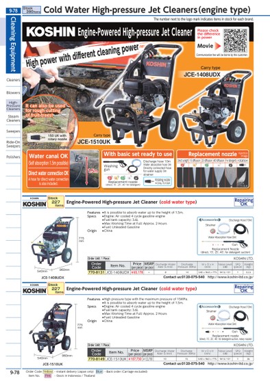 THENUMBERNEXTTOTHELOGOMARKINDICATESITEMSINSTOCKFOREACHBRAND.775MM775MMJCE-1408UDXJCE-1510UK540MM540MM960MM960MMSTRAINERWATERABSORPTIONHOSE(3M)DISCHARGEHOSE(10M)REPLACEMENTNOZZLE(DIRECT,15°,25°,40°,FORDETERGENTSUCTION,ROTARYNOZZLE)GUNSTRAINERWATERABSORPTIONHOSE(3M)DISCHARGEHOSE(10M)REPLACEMENTNOZZLE(DIRECT,15°,25°,40°,FORDETERGENTSUCTION)GUNJCE-1408UDXINJECTIONIMAGEJCE-1510UK150UKWITHROTARYNOZZLEWASHINGGUNDIRECTSUNLIGHT15°DIffUSION25°DIffUSION40°DIffUSIONFORDETERGENTSROTATION(SELFABSORPTION1.5MPOSSIBLE)WATERCANALOKDIRECTWATERCONNECTIONOKHIGHPOWERWITHDIffERENTCLEANINGPOWER1.5M*ONLY1510UKROTATINGNOZZLE(DIRECT,15°,25°,40°FORDETERGENT)REPLACEMENTNOZZLEDISCHARGEHOSE10MWATERABSORPTIONHOSE3MDIRECTLYCONNECTEDHOSEFORWATERSUPPLY3MSTRAINER*WHENROUGHCUTTING,PLEASEWEARMASKANDGOGGLES.COMMUNICATIONFEEWILLBEBORNEBYTHECUSTOMER.MOVIEPLEASECHECKTHEDIffERENCEINPOWERWITHBASICSETREADYTOUSEREPLACEMENTNOZZLEENGINE-POWEREDHIGH-PRESSUREJETCLEANERCARRYTYPEAHOSEFORDIRECTWATERCONNECTIONISALSOINCLUDED.*ONLY1510UKITCANALSOBEUSEDFORROUGHCUTTINGOFFRUITTREES!CARRYTYPEACCESSORIESACCESSORIESKOSHINENGINE-POWEREDHIGH-PRESSUREJETCLEANER(COLDWATERTYPE)REPAIRINGOKSTOCK227ITEMSORDERUNIT:1PIECEKOSHINLTD.ORDERCODEITEMNO.PRICE(PERPIECE)MSRP(PERPIECE)DISCHARGEWATERRATE(L/MIN)DISCHARGEPRESSURE(MPA)WXDXH(MM)NOISELEVEL(DB)SPQ(PIECE)WEIGHT(KG)770-8131JCE-1408UDX¥65,178-814540X960X77594TO101132.5CONTACTUS:0120-075-540HTTP://WWW.KOSHIN-LTD.CO.JP/KOSHINENGINE-POWEREDHIGH-PRESSUREJETCLEANER(COLDWATERTYPE)REPAIRINGOKORDERCODEITEMNO.PRICE(PERPIECE)MSRP(PERPIECE)DISCHARGEWATERRATE(L/MIN)DISCHARGEPRESSURE(MPA)WXDXH(MM)NOISELEVEL(DB)SPQ(PIECE)WEIGHT(KG)770-8149JCE-1510UK¥107,730¥122,7001015540X960X77594TO101136CONTACTUS:0120-075-540HTTP://WWW.KOSHIN-LTD.CO.JP/STOCK227ITEMSORDERUNIT:1PIECEKOSHINLTD.FEATURES●ITISPOSSIBLETOABSORBWATERUPTOTHEHEIGHTOF1.5M.SPECS●ENGINE:AIRCOOLED4CYCLEGASOLINEENGINE●FUELTANKCAPACITY:3.6L●MAXWORKINGTIMEATFULL:APPROX.2HOURS●FUEL:UNLEADEDGASOLINEORIGIN●CHINAFEATURES●HIGHPRESSURETYPEWITHTHEMAXIMUMPRESSUREOF15MPA.●ITISPOSSIBLETOABSORBWATERUPTOTHEHEIGHTOF1.5M.SPECS●ENGINE:AIRCOOLED4CYCLEGASOLINEENGINE●FUELTANKCAPACITY:3.6L●MAXWORKINGTIMEATFULL:APPROX.2HOURS●FUEL:UNLEADEDGASOLINEORIGIN●CHINACLEANINGEQUIPMENTCLEANERSBLOWERSHIGH-PRESSURECLEANERSSTEAMCLEANERSSWEEPERSRIDE-ONSWEEPERSPOLISHERSSTOCK390ITEMSCOLDWATERHIGH-PRESSUREJETCLEANERS(ENGINETYPE)9-78*0515820*9-78ORDERCODEYELLOW…INSTANTDELIVERY(JAPANONLY)BLUE…BACKORDER(CARRIAGEEXCLUDED)ITEMNO.PINK…STOCKININDONESIA/THAILAND