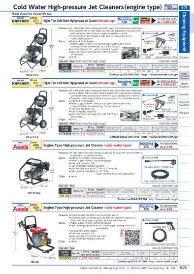 PRICESDISPLAYEDINCLUDE8%TAX.HD1010G2VARIABLELANCE+TRIGGERGUNHIGH-PRESSUREHOSE1/4(10M)VARIABLEGUNHIGH-PRESSUREHOSE3/8(10M)HD6/12GHD6/15G799MM799MM637MM637MMHD128440MM517MM363MM669MM704MM407MMVIDEO1097MM1097MMEXAMPLEEXAMPLESPRAYLANCE(840MM)WATERSUPPLYPARTSSPRAYLANCE(840MM)TRIGGERGUN(DIRECTATTACHMENTTYPE)WATERSUPPLYPARTSHIGH-PRESSUREHOSE(10M)POWERNOZZLE25°TRIGGERGUN(DIRECTATTACHMENTTYPE)HIGH-PRESSUREHOSE(10M)POWERNOZZLE25°ACCESSORIESACCESSORIESACCESSORIESACCESSORIESASADAENGINETYPEHIGH-PRESSUREJETCLEANER(COLDWATERTYPE)REPAIRINGOKORDERCODEITEMNO.PRICE(PERPIECE)MSRP(PERPIECE)DISCHARGEWATERRATE(L/MIN)DISCHARGEPRESSURE(MPA)WXDXH(MM)NOISELEVEL(DB)SPQ(PIECE)WEIGHT(KG)759-7053HD1010G2¥137,025¥145,0001010363X517X44074126CONTACTUS:052-911-7165HTTP://WWW.ASADA.CO.JP/ASADAENGINETYPEHIGH-PRESSUREJETCLEANER(COLDWATERTYPE)REPAIRINGOKORDERCODEITEMNO.PRICE(PERPIECE)MSRP(PERPIECE)DISCHARGEWATERRATE(L/MIN)DISCHARGEPRESSURE(MPA)WXDXH(MM)NOISELEVEL(DB)SPQ(PIECE)WEIGHT(KG)252-8223HD128¥187,110¥198,000127.8407X704X66970129CONTACTUS:052-911-7165HTTP://WWW.ASADA.CO.JP/KARCHERENGINETYPECOLDWATERHIGH-PRESSUREJETCLEANER(COLDWATERTYPE)REPAIRINGOKHEAVYCAUTIONORDERCODEITEMNO.PRICE(PERPIECE)MSRP(PERPIECE)DISCHARGEWATERRATE(L/MIN)DISCHARGEPRESSURE(MPA)WXDXH(MM)NOISELEVEL(DB)SPQ(PIECE)WEIGHT(KG)★778-5810HD6/12G¥192,375¥190,0001012637X799X1097103144.7CONTACTUS:022-344-3140HTTPS://WWW.KAERCHER.COM/JP/KARCHERENGINETYPECOLDWATERHIGH-PRESSUREJETCLEANER(COLDWATERTYPE)REPAIRINGOKHEAVYCAUTIONORDERCODEITEMNO.PRICE(PERPIECE)MSRP(PERPIECE)DISCHARGEWATERRATE(L/MIN)DISCHARGEPRESSURE(MPA)WXDXH(MM)NOISELEVEL(DB)SPQ(PIECE)WEIGHT(KG)★778-5828HD6/15G¥232,875¥230,0001015637X799X1097103144.7CONTACTUS:022-344-3140HTTPS://WWW.KAERCHER.COM/JP/STOCK371ITEMSSTOCK371ITEMSSTOCK459ITEMSSTOCK459ITEMSORDERUNIT:1PIECEFACTORYDIRECTNOFREIGHTCHARGEKARCHERJAPANORDERUNIT:1PIECEFACTORYDIRECTNOFREIGHTCHARGEKARCHERJAPANORDERUNIT:1PIECEASADACORPORATIONORDERUNIT:1PIECEASADACORPORATIONFEATURES●AHIGH-PRESSUREPUMPHAVINGACAPACITYOF10.0L/MINAND10.0MPAISMOUNTEDONACOMPACTFRAME.SPECS●ENGINE:AIRCOOLED4CYCLEENGINE●WATERSUPPLYSYSTEM:SELF-PRIMINGTYPE●FUELTANKCAPACITY:3.1L●FUEL:UNLEADEDREGULARGASOLINE●MAXWORKINGTIMEATFULL:2HOURS20MINUTES●PIPECLEANINGCAPABILITY:TOΦ110MM(PIPECLEANINGHOSESOLDSEPARATELY)ORIGIN●JAPANFEATURES●EQUIPPEDWITHDURABLE3-SERIESPLUNGERPUMP.●EQUIPPEDWITHAVARIABLEGUNCAPABLEOF2INJECTIONPATTERNSOFDIRECTANDFAN-SHAPEDINJECTIONASASTANDARDFEATURE.SPECS●WATERSUPPLYSYSTEM:SELF-PRIMINGTYPE●PIPECLEANINGCAPABILITY:TOΦ110MM(PIPECLEANINGHOSESOLDSEPARATELY)●AIRCOOLED4CYCLEENGINE●FUELTANKCAPACITY:3.0L●MAXWORKINGTIMEATFULL:4.4HOURS●FUEL:UNLEADEDREGULARGASOLINEORIGIN●JAPANFEATURES●ACRANKSHAFTPUMPHAVINGDURABILITYANDPOWERHASBEENEMPLOYED.●EVENATPLACESWITHNOWATERSUPPLYANDELECTRICITY,HIGH-PRESSURECLEANINGCANBEPERFORMEDATANYPLACESIFTHEREISAWATERSTORAGETANKORTHELIKE.●THEPOSITIONOFTHEHANDLEISHIGHANDYOUCANMOVEITINACOMFORTABLEPOSTURE.SPECS●ENGINE:4CYCLEENGINE●WATERSUPPLYSYSTEM:SELF-SUCTIONTYPE/WATERWORKSDIRECTCONNECTION(CANBESELECTEDBYTHEACCESSORY.)●FUELTANKCAPACITY:3.6L●FUEL:UNLEADEDGASOLINE●MAXCONTINUOUSWORKINGTIMEWITHFULLOFFUEL:210MINUTESORIGIN●CHINAFEATURES●ACRANKSHAFTPUMPHAVINGDURABILITYANDPOWERHASBEENEMPLOYED.●EVENATPLACESWITHNOWATERSUPPLYANDELECTRICITY,HIGH-PRESSURECLEANINGCANBEPERFORMEDATANYPLACESIFTHEREISAWATERSTORAGETANKORTHELIKE.●THEPOSITIONOFTHEHANDLEISHIGHANDYOUCANMOVEITINACOMFORTABLEPOSTURE.SPECS●ENGINE:4CYCLEENGINE●WATERSUPPLYSYSTEM:SELF-SUCTIONTYPE/WATERWORKSDIRECTCONNECTION(CANBESELECTEDBYTHEACCESSORY.)●FUELTANKCAPACITY:3.6L●FUEL:UNLEADEDGASOLINE●MAXCONTINUOUSWORKINGTIMEWITHFULLOFFUEL:210MINUTESORIGIN●CHINAFOROPTIONALPARTS,SEEP.9-88TO93FOROPTIONALPARTS,SEEP.9-94FOROPTIONALPARTS,SEEP.9-94FOROPTIONALPARTS,SEEP.9-88TO93CLEANINGEQUIPMENTCLEANERSBLOWERSHIGH-PRESSURECLEANERSSTEAMCLEANERSSWEEPERSRIDE-ONSWEEPERSPOLISHERSCOLDWATERHIGH-PRESSUREJETCLEANERS(ENGINETYPE)STOCK390ITEMS9-79*0515810*9-79DELIVERYESTIMATE★…MANUFACTURERSTOCK★…DELIVERYWITHIN7WORKINGDAYS★…ASK