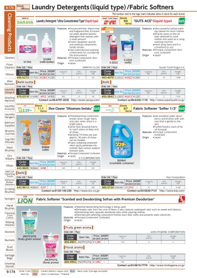 THENUMBERNEXTTOTHELOGOMARKINDICATESITEMSINSTOCKFOREACHBRAND.51699(REFILLBOTTLE)505941(CRUSHABLECONTAINER)51702S-2022S-2202(REFILL)9086890869(REFILL)JNCFPGTQ(FLORALAROMA)JNCFCGTQ(FRUITYGREENAROMA)LIONFABRICSOFTENER"SCENTEDANDDEODORIZINGSOFRANWITHPREMIUMDEODORIZER"ORDERUNIT:1PIECEORDERCODEITEMNO.PRICE(PERPIECE)MSRP(PERPIECE)CAPACITY(L)SPQ(PIECE)WEIGHT(KG)856-9952JNCFPGTQ¥1,296-1.9262CONTACTUS:03-5819-7770HTTP://WWW.LIONHYGIENE.CO.JP/ORDERUNIT:1PIECELIONHYGIENECORPORATIONORDERCODEITEMNO.PRICE(PERPIECE)MSRP(PERPIECE)CAPACITY(L)SPQ(PIECE)WEIGHT(KG)856-9951JNCFCGTQ¥1,296-1.9262SARAYALAUNDRYDETERGENT"ULTRACONCENTRATEDTYPE"(LIQUIDTYPE)ORDERCODEITEMNO.PRICE(PERPIECE)MSRP(PERPIECE)CAPACITY(ML)SPQ(PIECE)WEIGHT(G)470-531951699¥912¥9008501094CONTACTUS:06-6797-2525HTTP://WWW.SARAYA.COM/ORDERCODEITEMNO.PRICE(PERPIECE)MSRP(PERPIECE)CAPACITY(L)SPQ(PIECE)WEIGHT(KG)495-627351702¥5,063¥5,000535.4S.TSHOECLEANER"OHISAMANOSENTAKU"ORDERCODEITEMNO.PRICE(PERPIECE)MSRP(PERPIECE)CAPACITY(ML)SPQ(PIECE)WEIGHT(G)442-960590868¥498-24018303ORDERCODEITEMNO.PRICE(PERPIECE)MSRP(PERPIECE)CAPACITY(ML)SPQ(PIECE)WEIGHT(G)442-961390869¥357-20024205CONTACTUS:0120-145-230HTTP://WWW.ST-C.CO.JP/STOCK111ITEMSORDERUNIT:1PIECEORDERUNIT:1PIECES.T.CORPORATIONORDERUNIT:1PIECESARAYACO.LTD.ORDERUNIT:1PIECEFEATURES●PATENTEDDEODORIZINGTECHNOLOGYISBEINGUSED.●ELIMINATESODORFROMTHECOREOFFIBERS.ITALSOREDUCESUNPLEASANTODORSUCHASSWEATANDTOBACCO.●DEODORIZINGHERBCAPSULESDEODORIZEODORWHILEWEARINGCLOTHES.●PLANT-DERIVEDSOFTENINGCOMPONENTFINISHESEACHFIBERSOFTLYANDPREVENTSSTATICELECTRICITY.MATERIALS●PRINCIPALCOMPONENT:SURFACTANTORIGIN●JAPANFRUITYGREENAROMAFLORALAROMAREFILLBOTTLEREFILLFEATURES●FLUORESCENT-FREE,BLEACH-FREEANDFRAGRANCE-FREE.ECONOMI-CALWEAKALKALINELAUNDRYDETERGENTTHATWASHESWITHASMALLAMOUNT.●FOAMSDISAPPEARQUICKLYANDWASHINGCOMPONENTSHARDLYREMAIN.●USESPLANT-DERIVEDWASHINGCOMPONENTSFORCONSIDERINGTHEENVIRONMENT.MATERIALS●PRINCIPALCOMPONENT:NON-IONICSURFACTANTORIGIN●JAPANFEATURES●PHOTOBLEACHINGCOMPONENTBREAKSDOWNTOUGHSTAINSANDODORWHENDRIEDINABRIGHTPLACE.●SPRAYTYPEALLOWINGFOAMSTOREACHSTAINSATDEEPENDOFSHOES.●SPRAYING10TIMESPERPAIRAPPROX.30PAIRSOFSHOESCANBETREATED.●FOAMSCONTAININGCOMPONENTWHICHQUICKLYPENETRATESINTOSYNTHETICFIBERSREMOVESTUBBORNFOOTMARKSTAINS.MATERIALS●PRINCIPALCOMPONENT:SURFACTANTORIGIN●JAPANSUZUKIYUSHIKOGYO"GUTSACE"(LIQUIDTYPE)ORDERCODEITEMNO.PRICE(PERPIECE)MSRP(PERPIECE)CAPACITY(KG)SPQ(PIECE)WEIGHT(KG)493-4075S-2022¥4,922¥5,8001101.098ORDERCODEITEMNO.PRICE(PERPIECE)MSRP(PERPIECE)CAPACITY(KG)SPQ(PIECE)WEIGHT(KG)493-3842S-2202¥4,413¥5,200121.024CONTACTUS:06-6326-1118HTTP://WWW.SUZUKIYUSHI.CO.JP/KAOFABRICSOFTENER"SOFTER1/3"ORDERCODEITEMNO.PRICE(PERPIECE)MSRP(PERPIECE)CAPACITY(L)SPQ(PIECE)WEIGHT(KG)385-5724505941¥1,674-2.162.182CONTACTUS:03-5630-7141HTTP://WWW.KAO.COM/STOCK87ITEMSSTOCK69ITEMSORDERUNIT:1PIECEKAOCORPORATIONORDERUNIT:1PIECEORDERUNIT:1PIECESUZUKIYUSHIKOGYOK.K.REFILL.COMSDSFEATURES●HASEXCELLENTWATERABSOR-BENCYANDFINISHESWITHSOFT-NESSTHATISGENTLETOTHESKIN.●FLUFFEDFLOWERYSCENTOFFLO-RALBOUQUET.MATERIALS●PRINCIPALCOMPONENT:SURFACTANTORIGIN●JAPANFEATURES●ULTRAPOWERFULPARTIALWASH-INGCLEANERFORWORKCLOTHES.●DIRECTLYSPRAYONTHEOILSTAINATTACHEDTOWORKCLOTHESANDWASHASISUSINGWASHINGMACHINE.●HANDSPRAYTYPEANDITISCONVENIENTTOUSE.MATERIALS●PRINCIPALCOMPONENT:NON-IONICSURFACTANTORIGIN●JAPANCLEANINGPRODUCTSCLEANERSFLOORCLEANERSWAXESWAXREMOVERSLAUNDRYDETERGENTSWASHINGMACHINESLAUNDRYACCESSORIESLAUNDRYHANGERSBATHROOMSUPPLIESBROOMS/DUSTPANSTONGS/DITCHSHOVELSDECKBRUSHESDRYWIPERSMOPSHACCPCLEANINGTOOLSADHESIVEROLLERCLEANERSSCRUBBINGBRUSHESSPONGESHANDBRUSHESCLEANINGTOOLCASESWIPINGWASTESABSORBENTSBUCKETSDUSTBOXESGARBAGEBAGSSMOKINGSTANDSSTOCK46ITEMSLAUNDRYDETERGENTS(LIQUIDTYPE)/FABRICSOFTNERS9-174*0516671*9-174ORDERCODEYELLOW…INSTANTDELIVERY(JAPANONLY)BLUE…BACKORDER(CARRIAGEEXCLUDED)ITEMNO.PINK…STOCKININDONESIA/THAILAND