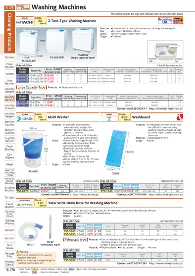 THENUMBERNEXTTOTHELOGOMARKINDICATESITEMSINSTOCKFOREACHBRAND.PS-65AS2WPS-55AS2WWIDTHDEPTHHEIGHTPS-80SW(LARGECAPACITYTYPE)DEHYDRATIONTANKWASHINGTANKAK-M60362MM525MM00809520MM210MMHS-01HS-27(TELESCOPICTYPE)MITSUGIRON"NEWWIDEDRAINHOSEFORWASHINGMACHINE"STOCK110ITEMSORDERUNIT:1PIECEMITSUGIRONCO.LTDORDERCODEITEMNO.PRICE(PERPIECE)MSRP(PERPIECE)COLORDIAMETER(MM)LENGTH(M)SPQ(PIECE)WEIGHT(G)795-5685HS-01¥725¥900WHITE301.050173795-5693HS-02¥879¥1,100WHITE301.550240ORDERUNIT:1PIECEORDERCODEITEMNO.PRICE(PERPIECE)MSRP(PERPIECE)COLORDIAMETER(MM)LENGTH(M)SPQ(PIECE)WEIGHT(G)795-5707HS-27¥926¥1,200WHITE340.4TO1.160148CONTACTUS:072-257-7281HTTP://WWW.MITSUGIRON.CO.JP/HITACHI2TANKTYPEWASHINGMACHINEREPAIRINGOKHEAVYCAUTIONORDERCODEITEMNO.PRICE(PERPIECE)MSRP(PERPIECE)WASHINGCAPACITY(KG)DEWATERINGCAPACITY(KG)WXDXH(MM)DEHYDRATIONTANKPOWERCONSUMPTION(WASHING)50HZ/60HZ(W)POWERCONSUMPTION(DEHYDRATION)50HZ/60HZ(W)SPQ(PIECE)WEIGHT(KG)★363-2211PS-80SW¥68,891-88922X509X935STAINLESSSTEEL285/340185/190134★440-4505PS-120AW¥146,964-12121021X571X1130PLASTIC300/410180/220147CONTACTUS:0120-3121-11HTTP://KADENFAN.HITACHI.CO.JP/ORDERCODEITEMNO.PRICE(PERPIECE)MSRP(PERPIECE)WASHINGCAPACITY(KG)DEWATERINGCAPACITY(KG)WXDXH(MM)DEHYDRATIONTANKPOWERCONSUMPTION(WASHING)50HZ/60HZ(W)POWERCONSUMPTION(DEHYDRATION)50HZ/60HZ(W)SPQ(PIECE)WEIGHT(KG)★819-9612PS-H45LCP¥34,560-4.55.0750X425X893PLASTIC330/380140/150123★819-9613PS-55AS2W¥62,910-5.55.5760X449X930STAINLESSSTEEL385/420125/130125★819-9614PS-65AS2W¥71,280-6.56.5800X434X882STAINLESSSTEEL345/420115/140127STOCK80ITEMSORDERUNIT:1PIECEHITACHIAPPLIANCES,INC.ORDERUNIT:1PIECEALUMISMULTIWASHERORDERCODEITEMNO.PRICE(PERPIECE)MSRP(PERPIECE)WASHINGCAPACITY(KG)WXDXH(MM)SPQ(PIECE)WEIGHT(KG)759-0229AK-M60¥9,653-0.6362X362X52514.5CONTACTUS:048-796-4841HTTP://WWW.ALUMIS.JP/STOCK36ITEMSORDERUNIT:1PIECEALUMISCO.LTD.FEATURES●CANBECUTIN3STAGES(26,31,41MM)WITHSCISSORSTOMATCHTHESIZEOFHOSE.MATERIALS●POLYVINYLCHLORIDE●POLYETHYLENEORIGIN●JAPANFEATURES●CANBEATTACHEDTOΦ32ANDΦ34MMHOMEWASHINGMACHINEDRAINHOSEMADEBYVARIOUSMANUFACTURERS.●LENGTHISADJUSTABLEWITHBELLOWSHOSE.MATERIALS●POLYPROPYLENE●POLYETHYLENETELESCOPICTYPEFEATURES●ALARGECAPACITYTYPE.LARGECAPACITYTYPEFEATURES●ITCOMESWITHANOTICEBUZZER(EXCEPTFORLARGEVOLUMETYPE).USE●FORUSEINFACTORIES,OFFICES.SPECS●POWERSUPPLY:SINGLEPHASE100VORIGIN●THAILANDFEATURES●APOWERFULWASHINGTHATAUTOMATICALLYCHANGESTHEDIRECTIONOFWATERFLOWEVERYAPPROX.6SECONDS.●ITISOPTIMUMFORABITOFLAUNDRYSUCHASTOWELSANDWORKGLOVES.SPECS●POWERSUPPLY:SINGLEPHASE100V●ELECTRICITYCONSUMPTION:85W●WASHINGCAPACITY:600G●ESTIMATEDLAUNDRYVOLUMETARGET:APPROXIMATELY20PAIRSOFGLOVES●MAXWATERVOLUME:10L●TIMERSETTING:3,6,9,12,15MINS●WATERSETTING:STANDARD/LOWORIGIN●CHINA●CANNOTBEATTACHEDTOTHEWASHINGMACHINEMAINUNIT.●NOTFORCONNECTINGDRAINAGEFITTINGSFORWASHINGMACHINEPAN,ETC.WARNINGORIGIN●KOREATOMBOWASHBOARDSTOCK265ITEMSORDERUNIT:1PIECESHINKIGOSEICO.LTDORDERCODEITEMNO.PRICE(PERPIECE)MSRP(PERPIECE)WXDXH(MM)SPQ(PIECE)WEIGHT(G)779-104600809¥1,018¥1,100210X520X2540443CONTACTUS:0077-781-088HTTP://WWW.SHINKIGOSEI.CO.JP/FEATURES●COMPLETELYREMOVESSTAINSTHATAREDIFFICULTTOREMOVEUSINGWASHINGMACHINE.MADEOFPLAS-TICWHICHREPELSWATER,ALLOWINGCLEANUSE.MATERIALS●POLYPROPYLENE(PP)ORIGIN●JAPANCLEANINGPRODUCTSCLEANERSFLOORCLEANERSWAXESWAXREMOVERSLAUNDRYDETERGENTSWASHINGMACHINESLAUNDRYACCESSORIESLAUNDRYHANGERSBATHROOMSUPPLIESBROOMS/DUSTPANSTONGS/DITCHSHOVELSDECKBRUSHESDRYWIPERSMOPSHACCPCLEANINGTOOLSADHESIVEROLLERCLEANERSSCRUBBINGBRUSHESSPONGESHANDBRUSHESCLEANINGTOOLCASESWIPINGWASTESABSORBENTSBUCKETSDUSTBOXESGARBAGEBAGSSMOKINGSTANDSSTOCK27ITEMSWASHINGMACHINES9-176*0516611*9-176ORDERCODEYELLOW…INSTANTDELIVERY(JAPANONLY)BLUE…BACKORDER(CARRIAGEEXCLUDED)ITEMNO.PINK…STOCKININDONESIA/THAILAND