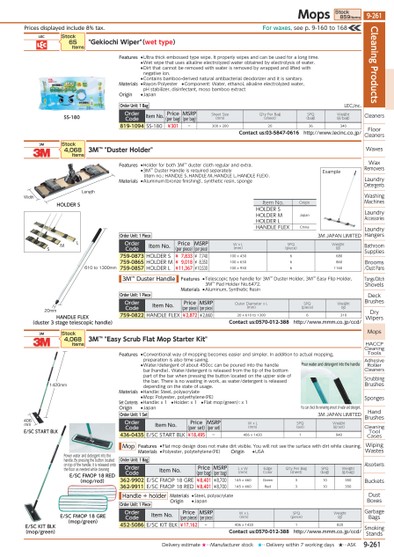 PRICESDISPLAYEDINCLUDE8%TAX.FORWAXES,SEEP.9-160TO168HOLDERSLENGTHWIDTHEXAMPLESMLHANDLEFLEX(DUSTER3STAGETELESCOPICHANDLE)20MM610TO1300MME/SCFMOP18RED(MOP/RED)E/SCFMOP18GRE(MOP/GREEN)POWERWATERANDDETERGENTINTOTHEHANDLE.BYPRESSINGTHEBUTTONLOCATEDONTOPOFTHEHANDLE,ITISRELEASEDONTOTHEFLOORASNEEDEDWHILECLEANINGYOUCANCHECKTHEREMAININGAMOUNTOFWATERANDDETERGENT.POURWATERANDDETERGENTINTOTHEHANDLE1420MM406MME/SCKITBLK(MOP/GREEN)E/SCSTARTBLKITEMNO.ORIGINHOLDERSHOLDERMJAPANHOLDERLHANDLEFLEXCHINASS-180LEC"GEKIOCHIWIPER"(WETTYPE)STOCK65ITEMSORDERUNIT:1BAGLEC,INC.ORDERCODEITEMNO.PRICE(PERBAG)MSRP(PERBAG)SHEETSIZE(MM)Q'TYPERBAG(SHEET)SPQ(BAG)WEIGHT(G/BAG)819-1094SS-180¥301-300X2002036340CONTACTUS:03-5847-0616HTTP://WWW.LECINC.CO.JP/3M3MTM"DUSTERHOLDER"STOCK4,068ITEMSORDERCODEITEMNO.PRICE(PERPIECE)MSRP(PERPIECE)OUTERDIAMETERXL(MM)SPQ(PIECE)WEIGHT(G)759-0822HANDLEFLEX¥2,872¥2,66020X610TO13006310CONTACTUS:0570-012-388HTTP://WWW.MMM.CO.JP/CCD/ORDERCODEITEMNO.PRICE(PERPIECE)MSRP(PERPIECE)WXL(MM)SPQ(PIECE)WEIGHT(G)759-0873HOLDERS¥7,833¥7,740100X4306680759-0865HOLDERM¥9,018¥8,350100X6306860759-0857HOLDERL¥11,367¥10,530100X930611603M3MTM"EASYSCRUBFLATMOPSTARTERKIT"ORDERCODEITEMNO.PRICE(PERPIECE)MSRP(PERPIECE)WXL(MM)SPQ(PIECE)WEIGHT(G)452-5086E/SCKITBLK¥17,162-406X14201820CONTACTUS:0570-012-388HTTP://WWW.MMM.CO.JP/CCD/ORDERCODEITEMNO.PRICE(PERBAG)MSRP(PERBAG)LXW(MM)EDGECOLORQ'TYPERBAG(SHEET)SPQ(BAG)WEIGHT(G/BAG)362-9902E/SCFMOP18GRE¥8,401¥8,700145X460GREEN310350362-9911E/SCFMOP18RED¥8,401¥8,700145X460RED310350ORDERCODEITEMNO.PRICE(PERSET)MSRP(PERSET)WXL(MM)SPQ(SET)WEIGHT(G/SET)436-0435E/SCSTARTBLK¥18,495-406X14201940STOCK4,068ITEMSORDERUNIT:1SET3MJAPANLIMITEDORDERUNIT:1BAGORDERUNIT:1PIECEORDERUNIT:1PIECE3MJAPANLIMITEDORDERUNIT:1PIECEFEATURES●ULTRATHICKEMBOSSEDTYPEWIPE.ITPROPERLYWIPESANDCANBEUSEDFORALONGTIME.●WETWIPETHATUSESALKALINEELECTROLYZEDWATEROBTAINEDBYELECTROLYSISOFWATER.●DIRTTHATCANNOTBEREMOVEDWITHWATERISREMOVEDBYWRAPPEDANDLIFTEDWITHNEGATIVEION.●CONTAINSBAMBOO-DERIVEDNATURALANTIBACTERIALDEODORIZERANDITISSANITARY.MATERIALS●RAYON/POLYESTER●COMPONENT:WATER,ETHANOL,ALKALINEELECTROLYZEDWATER,PHSTABILIZER,DISINFECTANT,MOSOBAMBOOEXTRACTORIGIN●JAPANFEATURES●TELESCOPICTYPEHANDLEFOR3MTMDUSTERHOLDER,3MTMEASYFLIPHOLDER,3MTMPADHOLDERNO.6472.MATERIALS●ALUMINUM,SYNTHETICRESIN3MTMDUSTERHANDLEFEATURES●FLATMOPDESIGNDOESNOTMAKEDIRTVISIBLE.YOUWILLNOTSEETHESURFACEWITHDIRTWHILECLEANING.MATERIALS●POLYESTER,POLYTEHYLENE(PE)MOPMATERIALS●STEEL,POLYACRYLATEORIGIN●JAPANHANDLE+HOLDERFEATURES●CONVENTIONALWAYOFMOPPINGBECOMESEASIERANDSIMPLER.INADDITIONTOACTUALMOPPING,PREPARATIONISALSOTIMESAVING.●WATER/DETERGENTOFABOUT450CCCANBEPOUREDINTOTHEHANDLEBAR(HANDLE).WATER/DETERGENTISRELEASEDFROMTHETIPOFTHEBOTTOMPARTOFTHEBARWHENPRESSINGTHEBUTTONLOCATEDONTHEUPPERSIDEOFTHEBAR.THEREISNOWASTINGINWORK,ASWATER/DETERGENTISRELEASEDDEPENDINGONTHESTATEOFUSAGE.MATERIALS●HANDLE:STEEL,POLYACRYLATE●MOP:POLYESTER,POLYETHYLENE(PE)SETCONTENTS●HANDLE:X1●HOLDER:X1●FLATMOP(GREEN):X1ORIGIN●JAPANORIGIN●USAFEATURES●HOLDERFORBOTH3MTMDUSTERCLOTHREGULARANDEXTRA.●3MTMDUSTERHANDLEISREQUIREDSEPARATELY(ITEMNO.:HANDLES、HANDLEM、HANDLEL、HANDLEFLEX).MATERIALS●ALUMINUM(BRONZEFINISHING),SYNTHETICRESIN,SPONGECLEANINGPRODUCTSCLEANERSFLOORCLEANERSWAXESWAXREMOVERSLAUNDRYDETERGENTSWASHINGMACHINESLAUNDRYACCESSORIESLAUNDRYHANGERSBATHROOMSUPPLIESBROOMS/DUSTPANSTONGS/DITCHSHOVELSDECKBRUSHESDRYWIPERSMOPSHACCPCLEANINGTOOLSADHESIVEROLLERCLEANERSSCRUBBINGBRUSHESSPONGESHANDBRUSHESCLEANINGTOOLCASESWIPINGWASTESABSORBENTSBUCKETSDUSTBOXESGARBAGEBAGSSMOKINGSTANDSMOPSSTOCK859ITEMS9-261*0517370*9-261DELIVERYESTIMATE★…MANUFACTURERSTOCK★…DELIVERYWITHIN7WORKINGDAYS★…ASK