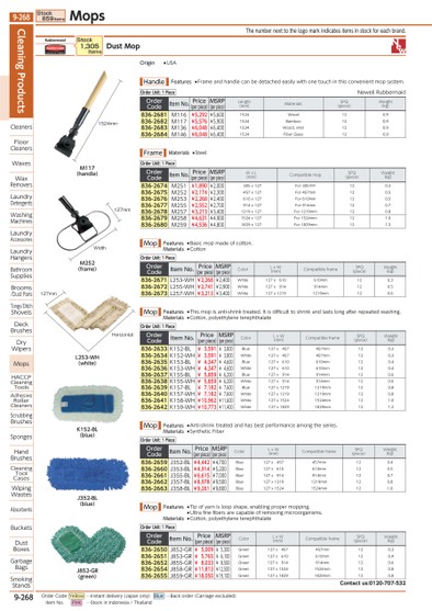 THENUMBERNEXTTOTHELOGOMARKINDICATESITEMSINSTOCKFOREACHBRAND.M117(HANDLE)1524MMM252(FRAME)127MMWIDTHL253-WH(WHITE)HORIZONTAL127MMK152-BL(BLUE)J352-BL(BLUE)J852-GR(GREEN)RUBBERMAIDDUSTMOPSTOCK1,305ITEMSORDERUNIT:1PIECEORDERCODEITEMNO.PRICE(PERPIECE)MSRP(PERPIECE)COLORLXW(MM)COMPATIBLEFRAMESPQ(PIECE)WEIGHT(KG)836-2650J852-GR¥5,009¥5,300GREEN127X457457MM120.3836-2651J853-GR¥5,765¥6,100GREEN127X610610MM120.4836-2652J855-GR¥8,033¥8,500GREEN127X914914MM120.6836-2654J858-GR¥11,813¥12,500GREEN127X15241524MM120.8836-2655J859-GR¥18,050¥19,100GREEN127X18291829MM120.8CONTACTUS:0120-707-532ORDERUNIT:1PIECENEWELLRUBBERMAIDORDERCODEITEMNO.PRICE(PERPIECE)MSRP(PERPIECE)LENGTH(MM)MATERIALSSPQ(PIECE)WEIGHT(KG)836-2681M116¥5,292¥5,6001524WOOD120.9836-2682M117¥5,576¥5,9001524BAMBOO120.9836-2683M136¥6,048¥6,4001524WOOD,VINYL120.9836-2684M146¥6,048¥6,4001524FIBERGLASS120.9ORDERUNIT:1PIECEORDERCODEITEMNO.PRICE(PERPIECE)MSRP(PERPIECE)WXL(MM)COMPATIBLEMOPSPQ(PIECE)WEIGHT(KG)836-2674M251¥1,890¥2,000305X127FOR305MM120.3836-2675M252¥2,174¥2,300457X127FOR457MM120.5836-2676M253¥2,268¥2,400610X127FOR610MM120.5836-2677M255¥2,552¥2,700914X127FOR914MM120.7836-2678M257¥3,213¥3,4001219X127FOR1219MM120.8836-2679M258¥4,631¥4,9001524X127FOR1524MM121.0836-2680M259¥4,536¥4,8001829X127FOR1829MM121.2ORDERUNIT:1PIECEORDERCODEITEMNO.PRICE(PERPIECE)MSRP(PERPIECE)COLORLXW(MM)COMPATIBLEFRAMESPQ(PIECE)WEIGHT(KG)836-2671L253-WH¥2,268¥2,400WHITE127X610610MM120.3836-2672L255-WH¥2,741¥2,900WHITE127X914914MM120.5836-2673L257-WH¥3,213¥3,400WHITE127X12191219MM120.6ORDERUNIT:1PIECEORDERCODEITEMNO.PRICE(PERPIECE)MSRP(PERPIECE)COLORLXW(MM)COMPATIBLEFRAMESPQ(PIECE)WEIGHT(KG)836-2633K152-BL¥3,591¥3,800BLUE127X457457MM120.3836-2634K152-WH¥3,591¥3,800WHITE127X457457MM120.3836-2635K153-BL¥4,347¥4,600BLUE127X610610MM120.4836-2636K153-WH¥4,347¥4,600WHITE127X610610MM120.4836-2637K155-BL¥5,859¥6,200BLUE127X914914MM120.6836-2638K155-WH¥5,859¥6,200WHITE127X914914MM120.6836-2639K157-BL¥7,182¥7,600BLUE127X12191219MM120.8836-2640K157-WH¥7,182¥7,600WHITE127X12191219MM120.8836-2641K158-WH¥10,962¥11,600WHITE127X15241524MM121.0836-2642K159-WH¥10,773¥11,400WHITE127X18291829MM121.2ORDERUNIT:1PIECEORDERCODEITEMNO.PRICE(PERPIECE)MSRP(PERPIECE)COLORLXW(MM)COMPATIBLEFRAMESPQ(PIECE)WEIGHT(KG)836-2659J352-BL¥4,442¥4,700BLUE127X457457MM120.4836-2660J353-BL¥4,914¥5,200BLUE127X610610MM120.5836-2661J355-BL¥6,615¥7,000BLUE127X914914MM120.7836-2662J357-BL¥8,978¥9,500BLUE127X12191219MM120.8836-2663J358-BL¥9,261¥9,800BLUE127X15241524MM121.0ORIGIN●USAFEATURES●TIPOFYARNISLOOPSHAPE,ENABLINGPROPERMOPPING.●ULTRAFINEFIBERSARECAPABLEOFREMOVINGMICROORGANISMS.MATERIALS●COTTON,POLYETHYLENETEREPHTHALATEMOPFEATURES●FRAMEANDHANDLECANBEDETACHEDEASILYWITHONETOUCHINTHISCONVENIENTMOPSYSTEM.HANDLEMATERIALS●STEELFRAMEFEATURES●BASICMOPMADEOFCOTTON.MATERIALS●COTTONMOPFEATURES●THISMOPISANTI-SHRINKTREATED.ITISDIFFICULTTOSHRINKANDLASTSLONGAFTERREPEATEDWASHING.MATERIALS●COTTON,POLYETHYLENETEREPHTHALATEMOPFEATURES●ANTI-SHRINKTREATEDANDHASBESTPERFORMANCEAMONGTHESERIES.MATERIALS●SYNTHETICFIBERMOPCLEANINGPRODUCTSCLEANERSFLOORCLEANERSWAXESWAXREMOVERSLAUNDRYDETERGENTSWASHINGMACHINESLAUNDRYACCESSORIESLAUNDRYHANGERSBATHROOMSUPPLIESBROOMS/DUSTPANSTONGS/DITCHSHOVELSDECKBRUSHESDRYWIPERSMOPSHACCPCLEANINGTOOLSADHESIVEROLLERCLEANERSSCRUBBINGBRUSHESSPONGESHANDBRUSHESCLEANINGTOOLCASESWIPINGWASTESABSORBENTSBUCKETSDUSTBOXESGARBAGEBAGSSMOKINGSTANDSSTOCK859ITEMSMOPS9-268*C088012*9-268ORDERCODEYELLOW…INSTANTDELIVERY(JAPANONLY)BLUE…BACKORDER(CARRIAGEEXCLUDED)ITEMNO.PINK…STOCKININDONESIA/THAILAND