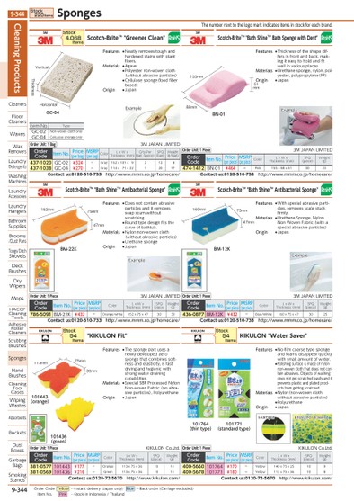 THENUMBERNEXTTOTHELOGOMARKINDICATESITEMSINSTOCKFOREACHBRAND.160MM75MM47MMBM-12KBM-22K101443(ORANGE)101764(THINTYPE)101771(STANDARDTYPE)ENLARGEDDRAWINGEXAMPLEEXAMPLE152MM75MM47MMEXAMPLE36MM75MM113MM101436(GREEN)ITEMNO.TYPEGC-02NON-WOVENCLOTHONLYGC-04CELLULOSESPONGEONLYBN-0188MM51MM155MMEXAMPLEHORIZONTALTHICKNESSVERTICALGC-04EXAMPLE3MSCOTCH-BRITETM"BATHSHINETMANTIBACTERIALSPONGE"ORDERCODEITEMNO.PRICE(PERPIECE)MSRP(PERPIECE)COLORLXWXTHICKNESS(MM)SPQ(PIECE)WEIGHT(G)786-5091BM-22K¥432-ORANGE/WHITE152X75X473030CONTACTUS:0120-510-733HTTP://WWW.MMM.CO.JP/HOMECARE/KIKULON"KIKULONFIT"ORDERCODEITEMNO.PRICE(PERPIECE)MSRP(PERPIECE)COLORLXWXTHICKNESS(MM)SPQ(PIECE)WEIGHT(G)381-0577101443¥177-ORANGE113X75X361010381-0569101436¥216-GREEN113X75X361010CONTACTUS:0120-72-5670HTTP://WWW.KIKULON.COM/STOCK54ITEMSORDERUNIT:1PIECEKIKULONCO.LTD.ORDERUNIT:1PIECE3MJAPANLIMITED3MSCOTCH-BRITETM"GREENERCLEAN"ORDERCODEITEMNO.PRICE(PERBAG)MSRP(PERBAG)COLORLXWXTHICKNESS(MM)Q'TYPERBAG(PIECE)SPQ(BAG)WEIGHT(G/BAG)437-1020GC-02¥324-GRAY152X101X92128437-1038GC-04¥270-GRAY114X71X2212017CONTACTUS:0120-510-733HTTP://WWW.MMM.CO.JP/HOMECARE/STOCK4,068ITEMSORDERUNIT:1BAG3MJAPANLIMITEDFEATURES●DOESNOTCONTAINABRASIVEPARTICLESANDITREMOVESSOAPSCUMWITHOUTSCRATCHING.●ROUNDTYPEDESIGNFITSTHECURVEOFBATHTUB.MATERIALS●NYLONNON-WOVENCLOTH(WITHOUTABRASIVEPARTICLES)●URETHANESPONGEORIGIN●JAPANFEATURES●THESPONGEPARTUSESANEWLYDEVELOPEDAEROSPONGETHATCOMBINESSOFT-NESSANDELASTICITY,ISFASTDRYINGANDHYGIENICWITHSTRONGWATERDRAININGCAPABILITIES.MATERIALS●SPECIALSBRPROCESSEDNYLONNON-WOVENFABRIC(NOABRA-SIVEPARTICLES),POLYURETHANEORIGIN●JAPANFEATURES●NEATLYREMOVESTOUGHANDHARDENEDSTAINSWITHPLANTFIBERS.MATERIALS●AGAVE●POLYESTERNON-WOVENCLOTH(WITHOUTABRASIVEPARTICLES)●CELLULOSESPONGE(FOODFIBERBASED)ORIGIN●JAPAN3MSCOTCH-BRITETM"BATHSHINETMANTIBACTERIALSPONGE"ORDERCODEITEMNO.PRICE(PERPIECE)MSRP(PERPIECE)COLORLXWXTHICKNESS(MM)SPQ(PIECE)WEIGHT(G)436-0877BM-12K¥432-BLUE/WHITE160X75X473025CONTACTUS:0120-510-733HTTP://WWW.MMM.CO.JP/HOMECARE/KIKULONKIKULON"WATERSAVER"ORDERCODEITEMNO.PRICE(PERPIECE)MSRP(PERPIECE)COLORLXWXTHICKNESS(MM)SPQ(PIECE)WEIGHT(G)400-5660101764¥170-YELLOW140X75X25109400-5678101771¥180-YELLOW113X75X36108CONTACTUS:0120-72-5670HTTP://WWW.KIKULON.COM/STOCK54ITEMSORDERUNIT:1PIECEKIKULONCO.LTD.ORDERUNIT:1PIECE3MJAPANLIMITED3MSCOTCH-BRITETM"BATHSHINETMBATHSPONGEWITHDENT"ORDERCODEITEMNO.PRICE(PERPIECE)MSRP(PERPIECE)COLORLXWXTHICKNESS(MM)SPQ(PIECE)WEIGHT(G)474-1412BN-01¥464-PINK155X88X513023CONTACTUS:0120-510-733HTTP://WWW.MMM.CO.JP/HOMECARE/ORDERUNIT:1PIECE3MJAPANLIMITEDFEATURES●WITHSPECIALABRASIVEPARTI-CLES,REMOVESSCALESTUCKFIRMLY.MATERIALS●URETHANESPONGE,NYLONNONWOVENFABRIC(WITHASPECIALABRASIVEPARTICLES)ORIGIN●JAPANFEATURES●NO-FILMCOARSETYPESPONGEANDFOAMSDISAPPEARQUICKLYWITHSMALLAMOUNTOFWATER.●POLISHINGSURFACEISMADEOFNYLONNON-WOVENCLOTHTHATDOESNOTCON-TAINABRASIVES.OBJECTSOFWASHINGDOESNOTGETSCRATCHEDEASILYANDITPREVENTSPLASTICANDPLATEDPROD-UCTSFROMGETTINGSCRATCHED.MATERIALS●NYLON(NON-WOVENCLOTHWITHOUTABRASIVEPARTICLES)●POLYURETHANEORIGIN●JAPANFEATURES●THICKNESSOFTHESHAPEDIF-FERSINFRONTANDBACK,MAK-INGITEASYTOHOLDANDFITWELLINVARIOUSPLACES.MATERIALS●URETHANESPONGE,NYLON,POL-YESTER,POLYPROPYLENE(PP)ORIGIN●JAPANCLEANINGPRODUCTSCLEANERSFLOORCLEANERSWAXESWAXREMOVERSLAUNDRYDETERGENTSWASHINGMACHINESLAUNDRYACCESSORIESLAUNDRYHANGERSBATHROOMSUPPLIESBROOMS/DUSTPANSTONGS/DITCHSHOVELSDECKBRUSHESDRYWIPERSMOPSHACCPCLEANINGTOOLSADHESIVEROLLERCLEANERSSCRUBBINGBRUSHESSPONGESHANDBRUSHESCLEANINGTOOLCASESWIPINGWASTESABSORBENTSBUCKETSDUSTBOXESGARBAGEBAGSSMOKINGSTANDSSTOCK220ITEMSSPONGES9-344*0518005*9-344ORDERCODEYELLOW…INSTANTDELIVERY(JAPANONLY)BLUE…BACKORDER(CARRIAGEEXCLUDED)ITEMNO.PINK…STOCKININDONESIA/THAILAND