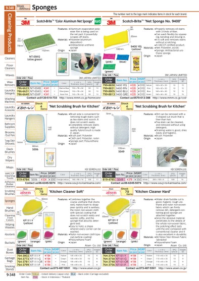 THENUMBERNEXTTOTHELOGOMARKINDICATESITEMSINSTOCKFOREACHBRAND.EXAMPLE152MM78MM24MMNT-05KG(OLIVEGREEN)30MM65MM160MM(BLUE)(PINK)(GREEN)9400YEL(YELLOW)KF111-Y(YELLOW)KF101-Y(YELLOW)(GREEN)(ORANGE)(PINK)80MM65MM105MM35MM35MM110MM(PINK)(ORANGE)(GREEN)EXAMPLES00690MM140MM14MM5MM100MM200MMS0493MSCOTCH-BRITETM"COLORALUMINUMNETSPONGE"ORDERCODEITEMNO.PRICE(PERPIECE)MSRP(PERPIECE)COLORLXWXTHICKNESS(MM)SPQ(PIECE)WEIGHT(G)786-6623NT-05KB¥341-MARINEBLUE152X78X243012786-6631NT-05KG¥341-OLIVEGREEN152X78X243012786-6640NT-05KP¥341-ROSEPINK152X78X243012CONTACTUS:0120-510-733HTTP://WWW.MMM.CO.JP/HOMECARE/ORDERUNIT:1PIECE3MJAPANLIMITEDAISEN"KITCHENCLEANERSOFT"ORDERCODEITEMNO.PRICE(PERPIECE)MSRP(PERPIECE)COLORLXWXTHICKNESS(MM)SPQ(PIECE)WEIGHT(G)764-3802KF111-Y¥194-YELLOW105X80X35108764-3772KF111-G¥194-GREEN105X80X35108764-3781KF111-OR¥194-ORANGE105X80X35108764-3799KF111-P¥194-PINK105X80X35108CONTACTUS:073-487-5501HTTP://WWW.AISEN.CO.JP/STOCK79ITEMSORDERUNIT:1PIECEAISENCO.LTD.KBSEIREN"NETSCRUBBINGBRUSHFORKITCHEN"ORDERCODEITEMNO.PRICE(PERPIECE)MSRP(PERPIECE)COLORLXWXTHICKNESS(MM)SPQ(PIECE)WEIGHT(G)819-4784S006¥324¥300ORANGE/YELLOW140X90X1410011CONTACTUS:06-6345-5074HTTP://WWW.SOUJI-NO-KAMISAMA.COM/STOCK4ITEMSORDERUNIT:1PIECEKBSEIREN,LTD.FEATURES●ALUMINUMEVAPORATIONPOLY-ESTERFILMISBEINGUSEDONTHENETPART.ITPOWERFULLYSCRAPESOFFSTAINS.MATERIALS●POLYESTER(ALUMINUMDEPOSITION)●ANTIBACTERIALURETHANESPONGEORIGIN●JAPANFEATURES●COMBINESTOGETHERTHECOARSEURETHANETHATDRAINSWELL,MAKESFOAMTODISAP-PEARQUICKLYANDISSANITARY,THENYLONNON-WOVENCLOTHWITHSPECIALCOATINGTHATDOESNOTSCRATCHEASILYANDWASHESSOFTLY,ANDTHESPONGETHATABSORBSDETER-GENTWELL.●EASYTOHOLD,ASHAPEWHEREINEVERYCORNERCANBEWASHED.MATERIALS●NYLONNON-WOVENCLOTH(SPE-CIALPARTICLECOATING)●POLYURETHANEFOAMORIGIN●JAPANFEATURES●BRUSHSIDEISCONVENIENTFORREMOVINGTOUGHSTAINSSUCHASTEASTAINSANDSCORCH.ITDOESNOTSCRATCHEASILY.●COMPLETELYREMOVESSTAINSWITHOUTDETERGENT.HIGHQUALITYHYBRIDBRUSHISMADEINJAPAN.MATERIALS●BRUSHPART:POLYESTER●CLOTHPART:POLYESTER,NYLON●SPONGEPART:POLYURETHANEORIGIN●JAPAN3MSCOTCH-BRITETM"NETSPONGENO.9400"ORDERUNIT:1PIECE3MJAPANLIMITEDORDERCODEITEMNO.PRICE(PERPIECE)MSRP(PERPIECE)COLORLXWXTHICKNESS(MM)SPQ(PIECE)WEIGHT(G)799-88309400YEL¥335¥310YELLOW160X65X301015799-88219400PIN¥335¥310PINK160X65X301015799-88059400BLU¥335¥310BLUE160X65X301015799-88139400GRE¥335¥310GREEN160X65X301015CONTACTUS:0570-012-388HTTP://WWW.MMM.CO.JP/CCD/AISEN"KITCHENCLEANERHARD"ORDERCODEITEMNO.PRICE(PERPIECE)MSRP(PERPIECE)COLORLXWXTHICKNESS(MM)SPQ(PIECE)WEIGHT(G)764-3764KF101-Y¥194-YELLOW110X65X35109764-3730KF101-G¥194-GREEN110X65X35109764-3748KF101-OR¥194-ORANGE110X65X35109764-3756KF101-P¥194-PINK110X65X35109CONTACTUS:073-487-5501HTTP://WWW.AISEN.CO.JP/STOCK79ITEMSORDERUNIT:1PIECEAISENCO.LTD.KBSEIREN"NETSCRUBBINGBRUSHFORKITCHEN"ORDERCODEITEMNO.PRICE(PERPIECE)MSRP(PERPIECE)COLORLXWXTHICKNESS(MM)SPQ(PIECE)WEIGHT(G)819-4785S049¥378¥350WHITE200X100X510015CONTACTUS:06-6345-5074HTTP://WWW.SOUJI-NO-KAMISAMA.COM/STOCK4ITEMSORDERUNIT:1PIECEKBSEIREN,LTD.FEATURES●WATERDRAIN/BUBBLECUTISGOOD,HYGIENICROUGHURE-THANEANDNYLONNON-WOVENFABRICWHICHCANFIRMLYREMOVEDIRT,DETERGENT-CON-TAININGGOODSPONGEAREATTACHEDTOGETHER.●SINCETHEABRASIVEMATERIALPENETRATESTOTHEDETAILSOFTHEWHOLENON-WOVENFABRIC,THEPOLISHINGEFFECTLASTSUNTILTHEENDCOMPAREDWITHCONVENTIONALCLEANERANDITISALSOEXCELLENTINDURABILITY.MATERIALS●66NYLONNONWOVENFABRIC(ABRASIVE)●POLYURETHANEFOAMORIGIN●JAPANFEATURES●PROPERLYREMOVESOILSTAINSWITH3KINDSOFFIBER.●CANWASHFLEXIBLYBYSQUEEZ-ING,BENDINGANDSHOVINGIN.●ITISSOFTANDREMOVESSTAINSWITHOUTSCRATCHING.●AHACCPCERTIFIEDPRODUCT.MATERIALS●NET:POLYESTER,ACRYLIC●SPONGE:ANTIBACTERIALURE-THANESPONGEORIGIN●JAPANFEATURES●DIRTCANBEREMOVEDWITHAV-SHAPEDCUTBRUSHTHATISFINERTHANHAIR.●TEASTAINCANBECLEANED,ANDREMOVEDWITHOUTUSINGDETERGENT.●DRAININGWATERISGOOD,DRIESEASILYANDHYGIENIC.MATERIALS●BRUSH:POLYESTERORIGIN●JAPANCLEANINGPRODUCTSCLEANERSFLOORCLEANERSWAXESWAXREMOVERSLAUNDRYDETERGENTSWASHINGMACHINESLAUNDRYACCESSORIESLAUNDRYHANGERSBATHROOMSUPPLIESBROOMS/DUSTPANSTONGS/DITCHSHOVELSDECKBRUSHESDRYWIPERSMOPSHACCPCLEANINGTOOLSADHESIVEROLLERCLEANERSSCRUBBINGBRUSHESSPONGESHANDBRUSHESCLEANINGTOOLCASESWIPINGWASTESABSORBENTSBUCKETSDUSTBOXESGARBAGEBAGSSMOKINGSTANDSSTOCK220ITEMSSPONGES9-348*0518041*9-348ORDERCODEYELLOW…INSTANTDELIVERY(JAPANONLY)BLUE…BACKORDER(CARRIAGEEXCLUDED)ITEMNO.PINK…STOCKININDONESIA/THAILAND