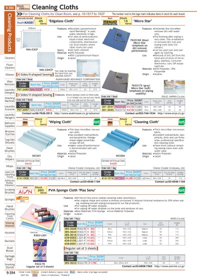THENUMBERNEXTTOTHELOGOMARKINDICATESITEMSINSTOCKFOREACHBRAND.NHL-03HCPEXAMPLECANCLEANBYINSERTINGTHEHANDFROMONESIDE(NHL-03HCP)NHL-03CP255MM215MM7633169(BLUE)MICROSTAR(EMPHASISONDIRTREMOVALPERFORMANCE)7633172(GRAY)MICROSTAR(SOFT)(EMPHASISONWIPINGUSABILITY)EXAMPLEESTIMATEDUNITPRICEPERSHEET¥410WC001ESTIMATEDUNITPRICEPERSHEET¥429WC004R302・L301R322-TK(REGULARSETOF3SHEETS)VERTICALHORIZONTALFORCLEANINGCLOTHSFORCLEANROOM,SEEP.10-1017TO1027ASAHIKASEIADVANCE"EDGELESSCLOTH"STOCK45ITEMSORDERCODEITEMNO.PRICE(PERSHEET)MSRP(PERSHEET)COLORSHEETSIZE(MM)SPQ(SHEET)WEIGHT(G)797-3497NHL-03HCP¥818-WHITE255X2152037.5CONTACTUS:06-7636-3913HTTP://WWW.ASAHI-KASEI.CO.JP/ADVANCE/ORDERCODEITEMNO.PRICE(PERSHEET)MSRP(PERSHEET)COLORSHEETSIZE(MM)SPQ(SHEET)WEIGHT(G)797-3489NHL-03CP¥818-WHITE255X2152037.5ORDERUNIT:1SHEETASAHIKASEIADVANCECORPORATIONORDERUNIT:1SHEETVILENE"WIPINGCLOTH"ORDERCODEITEMNO.PRICE(PERBAG)MSRP(PERBAG)COLORSHEETSIZE(MM)Q'TYPERBAG(SHEET)WEIGHT(G/BAG)414-1008WC001¥2,052¥2,000LIGHTBLUE330X330547CONTACTUS:03-4546-1184STOCK7ITEMSORDERUNIT:1BAGVILENECREATECOMPANY,LTD.AIONPVASPONGECLOTH"PLASSENU"ORDERCODEITEMNO.PRICE(PERPIECE)MSRP(PERPIECE)COLORLXW(MM)SIZESPQ(PIECE)WEIGHT(G)385-3608R302-B¥842-BLUE430X325REGULAR50113385-3624R302-Y¥842-YELLOW430X325REGULAR50113385-3616R302-P¥842-PINK430X325REGULAR50113439-0083L301-B¥1,642-BLUE690X430LARGE50200439-0105L301-Y¥1,642-YELLOW690X430LARGE50200439-0091L301-P¥1,642-PINK690X430LARGE50200ORDERCODEITEMNO.PRICE(PERSET)MSRP(PERSET)COLORLXW(MM)SPQ(SET)WEIGHT(G/SET)385-3632R322-TK¥1,706-BLUE,YELLOW,PINK430X32550273CONTACTUS:03-6858-7360HTTP://WWW.AION-KK.CO.JP/STOCK260ITEMSORDERUNIT:1SETORDERUNIT:1PIECEAIONCO.LTD.FEATURES●RECYCLEDCUPRAMMONIUMRAYON"BEMBERG®"ISUSED,WATERRETENTIVITYISHIGH.USE●FORSITESOFSEMICONDUCTOR,LIQUIDCRYSTAL,ELECTRONICCOMPONENTS,PHARMACEUTI-CAL,FOODINDUSTRYWHERECLEANROOMSAREUSED.SPECS●HASBEENCLEANED.MATERIALS●60%POLYESTER●40%CUPRAMMONIUMRAYONORIGIN●JAPAN4SIDES/X-SHAPEDSEWINGFEATURES●SINCESEWINGISDONEONTHREESIDESINAV-SHAPE,YOUCANPUTYOURHANDSFROMONESIDEANDDOTHEWORK.3SIDES/V-SHAPEDSEWINGFEATURES●THINTYPEMICROFIBERNON-WO-VENCLOTH.●HASEXCELLENTHYDROPHILICITYANDLIPOPHILICITY.WEDGE-SHAPEEDGESPOWERFULLYSCRAPEOFFDIRT.USE●HIGHERWIPE-OFFPERFORMANCEISDEMONSTRATEDWITHWETWIPING.MATERIALS●NYLON/POLYESTERORIGIN●JAPAN.COMSDSFEATURES●60MICRONFINEPORESREALIZESAMAZINGWATERABSORBENCY.●HASORIGINALSHAPEANDSURFACEISEMBOSSPROCESSED.ITREDUCESFRICTIONALRESISTANCEBY35%WHENWIP-ING,ENABLINGSMOOTHWIPING(COMPAREDTOOURFLATPRODUCTS).USE●FORWIPINGOFFWATERDROPLETS.●FORWIPINGOFFWATERDROPLETSONTHEBODYANDWINDOWSOFCARS.MATERIALS●RAWMATERIALS:PVASPONGE●COREMATERIAL:POLYESTERORIGIN●JAPANREGULARSETOF3SHEETSENJO"MICROSTAR"ORDERCODEITEMNO.PRICE(PERSHEET)MSRP(PERSHEET)COLORSHEETSIZE(MM)SPQ(SHEET)WEIGHT(G)381-30377633169¥4,104¥3,800BLUE380X3802040381-30457633172¥4,104¥3,800GRAY380X3802049CONTACTUS:052-744-1534HTTP://WWW.ENJO.CO.JP/STOCK15ITEMSORDERUNIT:1SHEETENJOJAPANCO.LTD.VILENE"CLEANINGCLOTH"ORDERCODEITEMNO.PRICE(PERBAG)MSRP(PERBAG)COLORSHEETSIZE(MM)Q'TYPERBAG(SHEET)WEIGHT(G/BAG)414-1016WC004¥4,288¥4,200LIGHTBLUE330X33010112CONTACTUS:03-4546-1184STOCK7ITEMSORDERUNIT:1BAGVILENECREATECOMPANY,LTD.FEATURES●EXTREMELYFINEMICROFIBERREMOVESDIRTWITHWATERONLY.●THEFINISHINGAFTERWIPINGISVERYCLEAN.(NORE-ADHESIONOFREMOVEDDIRT,FUZZANDWIPINGMARKDOESNOTREMAIN.)●CANBEUSEDOVERANDOVERAGAINBYWASHING.USE●REMOVALOFDIRT,DIRTFROMTHEHANDANDOILSLICKSOFMIRROR,GLASS,STAINLESS,CONSUMERELECTRONICS,CARS,OAEQUIP-MENTETC.MATERIALS●82%POLYESTER,18%POLYAMIDEORIGIN●AUSTRIAFEATURES●THICKMICRO-FIBERNON-WOVENFABRIC.●EXCELLENTHYDROPHILICITY,LIPO-PHILICITY,THICKANDCANFIRMLYWIPE,PROFESSIONALSPECIFICA-TIONCLEANINGCLOTH.USE●CLEANFINISHWITHOUTREMAIN-INGWIPINGMARKSEVENWITHWATERWIPE.MATERIALS●NYLON/POLYESTERORIGIN●JAPANCLEANINGPRODUCTSCLEANERSFLOORCLEANERSWAXESWAXREMOVERSLAUNDRYDETERGENTSWASHINGMACHINESLAUNDRYACCESSORIESLAUNDRYHANGERSBATHROOMSUPPLIESBROOMS/DUSTPANSTONGS/DITCHSHOVELSDECKBRUSHESDRYWIPERSMOPSHACCPCLEANINGTOOLSADHESIVEROLLERCLEANERSSCRUBBINGBRUSHESSPONGESHANDBRUSHESCLEANINGTOOLCASESWIPINGWASTESABSORBENTSBUCKETSDUSTBOXESGARBAGEBAGSSMOKINGSTANDSSTOCK296ITEMSCLEANINGCLOTHS9-394*0518362*9-394ORDERCODEYELLOW…INSTANTDELIVERY(JAPANONLY)BLUE…BACKORDER(CARRIAGEEXCLUDED)ITEMNO.PINK…STOCKININDONESIA/THAILAND