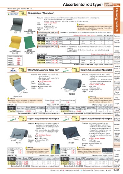 PRICESDISPLAYEDINCLUDE8%TAX.WIDTHAR60(OILABSORPTION:86L/ROLL)ESTIMATEDOILABSORPTIONPERMETERAR602.87LAR60Y2.87LAR80Y3.2LAR80G3.2LAR80G(OILABSORPTION:96L/ROLL)AR60Y(OILABSORPTION:86L/ROLL)ESTIMATEDOILABSORPTIONPERMETER1.32L400MM309050001ESTIMATEDOILABSORPTIONPERMETER3.6L760MM721018ESTIMATEDOILABSORPTIONPERMETER7210063.6L7210383.6L721006600MMEXAMPLE600MM721051CROSS-SECTIONALVIEWESTIMATEDOILABSORPTIONPERMETER7210512.2L7210522.2LJOHNANOILABSORBENT"ABURA-TORU"ORDERCODEITEMNO.PRICE(PERROLL)MSRP(PERROLL)OILABSORPTIONAMOUNT(L/ROLL)COLORWXL(MMXM)SPQ(ROLL)WEIGHT(KG)469-4414AR80Y¥24,138¥27,50096YELLOW800X30110496-0734AR80G¥24,138¥27,50096GREEN800X30110CONTACTUS:0774-43-1486HTTP://WWW.JOHNAN.COM/ORDERCODEITEMNO.PRICE(PERROLL)MSRP(PERROLL)OILABSORPTIONAMOUNT(L/ROLL)COLORWXL(MMXM)SPQ(ROLL)WEIGHT(KG)496-0718AR60¥19,116¥21,70086GRAY600X3017496-0726AR60Y¥19,116¥21,70086YELLOW600X3017STOCK64ITEMSORDERUNIT:1ROLL(PRICEREVISIONDATE:OCT,2015)JOHNANCORPORATIONORDERUNIT:1ROLL(PRICEREVISIONDATE:OCT,2015)MISM"OIL&WATERABSORBINGROLLEDMAT"ORDERCODEITEMNO.PRICE(PERROLL)MSRP(PERROLL)OILABSORPTIONAMOUNT(L/ROLL)WXL(MMXM)SPQ(ROLL)WEIGHT(KG)770-4364309050001¥27,000-66.2400X5018.2CONTACTUS:0120-911-472HTTP://WWW.MISM-JAPAN.COM/ORDERUNIT:1ROLLMISM-JAPANINC.STOCK23ITEMSSWSOILGUARD®MULTI-PURPOSELIQUIDADSORBINGMATORDERCODEITEMNO.PRICE(PERROLL)MSRP(PERROLL)OILABSORPTIONAMOUNT(L/ROLL)COLORWXL(MMXM)SPQ(ROLL)WEIGHT(KG)819-3391721006¥17,280-72GRAY600X2015.4819-3392721038¥17,280-72YELLOW600X2015.4CONTACTUS:045-803-6155HTTP://WWW.SHONAN-W-S.CO.JP/OILGUARD/STOCK18ITEMSORDERUNIT:1ROLLSHONANWIPERSUPPLYCO.,LTD.FEATURES●CATCHESOILTHATISOVER10TIMESITSWEIGHT(ACTUALDATAOBTAINEDBYOURCOMPANY).●TOPSIDEHASHARDFINISHINGANDITISSTURDY.●COMESINDIFFERENTCOLORSWHICHCANBEUSEDFORDIFFERENTPROCESS.USE●FOROILANDWATER.SPECS●ROLLTYPE●THICKNESS:3MMMATERIALS●POLYPROPYLENE(PP)ORIGIN●CHINAFEATURES●ITISPERFORATEDAT25CMINTERVALSANDCANCUTWITHOUTUSINGBLADE.OILABSORPTION:86L/ROLLFEATURES●ITISPERFORATEDAT25CMINTERVALSANDCANCUTWITHOUTUSINGBLADE(AR80Y).●ITISPERFORATEDAT40X50CMINTERVALSANDCANCUTWITHOUTUSINGBLADE(AR80G).OILABSORPTION:96L/ROLL●PLEASEPRESERVE/DISPOSEACCORDINGTOTHECHARACTERISTICSOFABSORBEDOILORLIQUID.WHENDISPOSING,PLEASEFOLLOWLOCALWASTEDISPOSALREGULATIONS.WARNINGFEATURES●ITISROLLTYPEANDEASYTOUSE,STORE,ANDCARRY.●CANBECUTEASILYACCORDINGTOTHEAPPLICATION.USE●FOROILANDWATER.SPECS●ROLLTYPE●THICKNESS:3MMMATERIALS●POLYPROPYLENE(PP)ORIGIN●CHINAFEATURES●WEARRESISTANTPPSHEETPROCESSISAPPLIEDONTHESURFACEANDFLUFFISBEINGREDUCED.ITCANBEPLACEDONPASSAGE,ETC.●ITISPERFORATEDATABOUT50CMINTER-VALSANDCANBEUSEDBYTEARINGITOFF.USE●FOROIL,WATER,SOLVENTSPECS●ROLLTYPE●THICKNESS:5MMMATERIALS●POLYPROPYLENE(PP)ORIGIN●CHINA●AFTERABSORPTIONOFOILSANDSOLVENTS,PLEASEDISPOSEOFTHEMAPPROPRIATELYACCORDINGTOLOCALORDINANCESETC.WARNING●AFTERADSORPTIONOFOILS,PLEASECONSULTWITHASPECIALISTANDDISPOSEOFITDEPENDINGONITSNATURE.WARNINGSWSOILGUARD®MULTI-PURPOSELIQUIDADSORBINGMATORDERCODEITEMNO.PRICE(PERROLL)MSRP(PERROLL)OILABSORPTIONAMOUNT(L/ROLL)WXL(MMXM)SPQ(ROLL)WEIGHT(KG)819-3390721018¥27,000-166760X46110.4CONTACTUS:045-803-6155HTTP://WWW.SHONAN-W-S.CO.JP/OILGUARD/STOCK18ITEMSORDERUNIT:1ROLLSHONANWIPERSUPPLYCO.,LTD.SWSOILGUARD®MULTI-PURPOSELIQUIDADSORBINGMATORDERCODEITEMNO.PRICE(PERROLL)MSRP(PERROLL)OILABSORPTIONAMOUNT(L/ROLL)COLORWXL(MMXM)SPQ(ROLL)WEIGHT(KG)819-3393721051¥12,420-51.5GRAY600X23.514.5819-3394721052¥12,420-51.5YELLOW600X23.514.5CONTACTUS:045-803-6155HTTP://WWW.SHONAN-W-S.CO.JP/OILGUARD/STOCK18ITEMSORDERUNIT:1ROLLSHONANWIPERSUPPLYCO.,LTD.FEATURES●ITISPERFORATEDATABOUT50CMINTERVALSANDCANBEUSEDBYTEAR-INGITOFF.●WHENUSEDASADOORMAT,ITHELPSTOPREVENTLIQUIDATTACHEDTOTHESOLEFROMSCATTERING.USE●FOROIL,WATER,SOLVENTSPECS●ROLLTYPE●THICKNESS:3MMMATERIALS●POLYPROPYLENE(PP)ORIGIN●CHINA●AFTERABSORPTIONOFOILSANDSOLVENTS,PLEASEDISPOSEOFTHEMAPPROPRIATELYACCORDINGTOLOCALORDINANCESETC.WARNINGFEATURES●WHENROLLISSPREADOUTANDINSTALLED,ITKEEPSWORKENVIRON-MENTCLEANANDINCREASESSAFETYBYPREVENTINGLIQUIDATTACHEDTOTHESOLEFROMSCATTERINGANDPRE-VENTINGSLIPPINGWITHLIQUID.●ITISPERFORATEDATABOUT50CMINTERVALSANDCANBEUSEDBYTEAR-INGITOFF.USE●FOROIL,WATER,SOLVENTSPECS●ROLLTYPE●THICKNESS:3MMMATERIALS●POLYPROPYLENE(PP)ORIGIN●CHINA●AFTERABSORPTIONOFOILSANDSOLVENTS,PLEASEDISPOSEOFTHEMAPPROPRIATELYACCORDINGTOLOCALORDINANCESETC.WARNINGCLEANINGPRODUCTSCLEANERSFLOORCLEANERSWAXESWAXREMOVERSLAUNDRYDETERGENTSWASHINGMACHINESLAUNDRYACCESSORIESLAUNDRYHANGERSBATHROOMSUPPLIESBROOMS/DUSTPANSTONGS/DITCHSHOVELSDECKBRUSHESDRYWIPERSMOPSHACCPCLEANINGTOOLSADHESIVEROLLERCLEANERSSCRUBBINGBRUSHESSPONGESHANDBRUSHESCLEANINGTOOLCASESWIPINGWASTESABSORBENTSBUCKETSDUSTBOXESGARBAGEBAGSSMOKINGSTANDSABSORBENTS(ROLLTYPE)STOCK312ITEMS9-433*0518721*9-433DELIVERYESTIMATE★…MANUFACTURERSTOCK★…DELIVERYWITHIN7WORKINGDAYS★…ASK