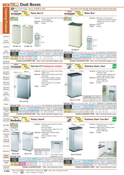 THENUMBERNEXTTOTHELOGOMARKINDICATESITEMSINSTOCKFOREACHBRAND.DS-213-110-0360MM248MM600MMITEMNO.TYPEDS-213-110-0WITHOUTINNERCONTAINERDS-213-120-0WITHINNERCONTAINEREXAMPLERSL-Z-2NDEPTHWIDTHRSL-Z-1NWITHRECTANGULARCONTAINERHEIGHTITEMNO.COMMERCIALGARBAGEBAGSRSL-Z-2N20LRSL-Z-1N45LYD-127L-SA356MM246MM600MMDS-213-010-0300MM210MM550MMEXAMPLEYD-08L-ID255MM595MM365MMWIDTHDEPTHHEIGHTYD-48L-1DYD-49L-1DFORTRASHBAGS,SEEP.9-528TO543BUNBUKU"ROTARYSTAND"ORDERCODEITEMNO.PRICE(PERPIECE)MSRP(PERPIECE)CAPACITY(L)WXDXH(MM)SPQ(PIECE)WEIGHT(KG)277-5611RSL-Z-2N¥22,334¥23,50016240X240X60014.2277-5620RSL-Z-1N¥30,129¥31,70024329X240X60015.1CONTACTUS:03-5819-2221HTTP://WWW.BUNBUKU.CO.JP/CONDOR"ROTORBOXEST"(INCLUDINGINNERCONTAINER)ORDERCODEITEMNO.PRICE(PERPIECE)MSRP(PERPIECE)CAPACITY(L)WXDXH(MM)SPQ(PIECE)WEIGHT(KG)480-5135YD-127L-SA¥13,037¥13,00023356X246X60014.3CONTACTUS:0120-941-239HTTP://WWW.YAMAZAKI-SANGYO.CO.JP/CONDOR"ROTORBOXE"ORDERCODEITEMNO.PRICE(PERPIECE)MSRP(PERPIECE)CAPACITY(L)WXDXH(MM)SPQ(PIECE)WEIGHT(KG)510-1859YD-49L-1D¥6,017¥6,00024276X200X60012.2510-1841YD-48L-1D¥6,819¥6,80040356X246X60013.1CONTACTUS:0120-941-239HTTP://WWW.YAMAZAKI-SANGYO.CO.JP/STOCK937ITEMSSTOCK937ITEMSSTOCK15ITEMSORDERUNIT:1PIECE(PRICEREVISIONDATE:JAN,2016)THEYAMAZAKICORPORATIONORDERUNIT:1PIECE(PRICEREVISIONDATE:JAN,2016)THEYAMAZAKICORPORATIONORDERUNIT:1PIECEBUNBUKUCO.LTD.CHEMICALCONTENTINSPECTIONGREENPURCHASING.COMECOFEATURES●STAINLESSSTEELHAIRLINEFINISHEDANDCLEAN.●THELIDROTATES.●ITCOMESWITHASTEELINNERCON-TENTSCONTAINER.MATERIALS●MAINBODY:STAINLESSSTEEL(SUS304)●INNERCONTAINER:STEELORIGIN●JAPANFEATURES●STYLISHANDUNIQUEWASTESEGRE-GATIONCAN.MATERIALS●MAINBODY:STAINLESSSTEELHAIR-LINEFINISH●TOP/BOTTOMRIDGES/ROTATINGCOVER:RECYCLEDPOLYSTYLENE(PS)40%●INNERCONTAINER:ZINCPLATEDIRONPLATEORIGIN●JAPANGREENPURCHASING.COMECOFEATURES●COLORSTEELPLATETRASHCANWITHSMARTDESIGN.MATERIALS●COLORSTEELPLATEORIGIN●JAPANTERAMOTO"STAINLESSSTEELTURNBOX"ORDERCODEITEMNO.PRICE(PERPIECE)MSRP(PERPIECE)CAPACITY(L)WXDXH(MM)SPQ(PIECE)WEIGHT(KG)472-9382DS-213-010-0¥8,625¥8,60023300X210X55012.3CONTACTUS:06-6541-3333HTTP://WWW.TERAMOTO.CO.JP/TERAMOTO"STAINLESSSTEELLBOX"ORDERCODEITEMNO.PRICE(PERPIECE)MSRP(PERPIECE)CAPACITY(L)WXDXH(MM)SPQ(PIECE)WEIGHT(KG)303-5522DS-213-110-0¥11,934¥11,90034.8360X248X60013.0303-5531DS-213-120-0¥14,541¥14,50034.0360X248X60014.9CONTACTUS:06-6541-3333HTTP://WWW.TERAMOTO.CO.JP/CONDOR"ROTORBOX"ORDERCODEITEMNO.PRICE(PERPIECE)MSRP(PERPIECE)CAPACITY(L)WXDXH(MM)SPQ(PIECE)WEIGHT(KG)500-8859YD-08L-ID¥10,180¥10,15036365X255X59514CONTACTUS:0120-941-239HTTP://WWW.YAMAZAKI-SANGYO.CO.JP/STOCK937ITEMSSTOCK689ITEMSSTOCK689ITEMSORDERUNIT:1PIECE(PRICEREVISIONDATE:JAN,2016)THEYAMAZAKICORPORATIONORDERUNIT:1PIECE(PRICEREVISIONDATE:JAN,2015)TERAMOTOCORPORATIONORDERUNIT:1PIECETERAMOTOCORPORATIONFEATURES●SIMPLETRASHCANMADEOFSTAINLESSSTEEL.MATERIALS●MAINBODY:STAINLESSSTEELNO4FINISHING●COVER:ABSRESINORIGIN●JAPANFEATURES●SIMPLETRASHCANMADEOFSTAINLESSSTEEL.●COMMERCIALLYAVAILABLE45LPLASTICBAGSCANBEUSED.MATERIALS●MAINBODY:STAINLESSSTEELNO4FINISHING●COVER:ABSRESINORIGIN●JAPANGREENPURCHASING.COMECOFEATURES●DUSTBOXWITHOPTIMUMCAPACITYFOROFFICEANDPUBLICFACILITYWHERETRASHISOFTENPRODUCED.MATERIALS●STEELORIGIN●JAPANCLEANINGPRODUCTSCLEANERSFLOORCLEANERSWAXESWAXREMOVERSLAUNDRYDETERGENTSWASHINGMACHINESLAUNDRYACCESSORIESLAUNDRYHANGERSBATHROOMSUPPLIESBROOMS/DUSTPANSTONGS/DITCHSHOVELSDECKBRUSHESDRYWIPERSMOPSHACCPCLEANINGTOOLSADHESIVEROLLERCLEANERSSCRUBBINGBRUSHESSPONGESHANDBRUSHESCLEANINGTOOLCASESWIPINGWASTESABSORBENTSBUCKETSDUSTBOXESGARBAGEBAGSSMOKINGSTANDSSTOCK1,181ITEMSDUSTBOXES9-466*0519010*9-466ORDERCODEYELLOW…INSTANTDELIVERY(JAPANONLY)BLUE…BACKORDER(CARRIAGEEXCLUDED)ITEMNO.PINK…STOCKININDONESIA/THAILAND