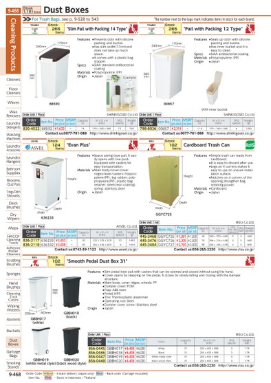 THENUMBERNEXTTOTHELOGOMARKINDICATESITEMSINSTOCKFOREACHBRAND.WIDTHWIDTHDEPTHDEPTHHEIGHTHEIGHTGGYC7256362338859200857FORTRASHBAGS,SEEP.9-528TO543EXAMPLE380MM380MM340MM340MM170MM170MMRISU"SMOOTHPEDALDUSTBOX31"STOCK102ITEMS255MM403MM588MMGBBH017(WHITE)GBBH018(BLACK)GBBH019(WHITEMETALSTYLE)GBBH020(BLACKWOODSTYLE)WITHINNERBUCKETSTOCK102ITEMSTOMBO"SLIMPAILWITHPACKING14TYPE"STOCK265ITEMSORDERUNIT:1PIECESHINKIGOSEICO.LTDORDERCODEITEMNO.PRICE(PERPIECE)MSRP(PERPIECE)CAPACITY(L)WXDXH(MM)SPQ(PIECE)WEIGHT(G)830-402288592¥1,620-14170X340X38012750CONTACTUS:0077-781-088HTTP://WWW.SHINKIGOSEI.CO.JP/ASVEL"EVANPLUS"STOCK124ITEMSORDERUNIT:1PIECEASVELCO.LTD.ORDERCODEITEMNO.PRICE(PERPIECE)MSRP(PERPIECE)CAPACITY(L)WXDXH(MM)SPQ(PIECE)WEIGHT(G)836-2117636233¥2,453-30232X376X529101482836-2118636332¥2,808-45262X426X60361923CONTACTUS:0743-59-1123HTTP://WWW.ASVEL.CO.JP/ORDERUNIT:1PIECERISUCO.LTD.ORDERCODEITEMNO.PRICE(PERPIECE)MSRP(PERPIECE)COLORCAPACITY(L)WXDXH(MM)SPQ(PIECE)WEIGHT(KG)856-0445GBBH017¥6,408¥6,000WHITE31255X403X58831.79856-0446GBBH018¥6,408¥6,000BLACK31255X403X58831.79856-0447GBBH019¥6,408¥6,000WHITEMETALSTYLE31255X403X58831.79856-0448GBBH020¥6,408¥6,000BLACKWOODSTYLE31255X403X58831.79CONTACTUS:058-265-2230HTTP://WWW.RISU.CO.JP/FEATURES●PREVENTSODORWITHSILICONEPACKINGANDBUCKLE.●HASSLIMWIDTH(17CM)ANDDOESNOTTAKEUPMUCHSPACE.●ITCOMESWITHAPLASTICBAGSTOPPER.SPECS●SIAASTANDARDANTIBACTERIALCOATINGMATERIALS●POLYPROPYLENE(PP)ORIGIN●JAPANFEATURES●SPACESAVINGTYPEPAIL.ITEAS-ILYOPENSWITHONEPUSH.EQUIPPEDWITHCASTERSFOREASYTRANSPORTATION.MATERIALS●MAINBODY/COVER/COVERRIDGES/LEVER/CASTERS:POLYPRO-PYLENE(PP),LEGRUBBER:POLY-PROPYLENE(PP),PLASTICBAGRETAINER:STEEL(RESINCOATING),SPRING:STAINLESSSTEELORIGIN●JAPANFEATURES●SLIMPEDALTYPEPAILWITHCASTERSTHATCANBEOPENEDANDCLOSEDWITHOUTUSINGTHEHAND.●COVEROPENSBYSTEPPINGONTHEPEDAL.ITCLOSESBYSLOWLYFALLINGANDCLOSINGWITHTHEDAMPERSTRUCTURE.MATERIALS●MAINBODY,COVERRIDGES,WHEELS:PP●DUMPERCOVER:POM●FLAP:ABSRESIN●PEDAL:HIPS●TIRE:THERMOPLASTICELASTOMER●OPERATINGROD:STEEL●DUMPERCOVERSCREW:STAINLESSSTEELORIGIN●JAPANTOMBO"PAILWITHPACKING12TYPE"STOCK265ITEMSORDERUNIT:1PIECESHINKIGOSEICO.LTDORDERCODEITEMNO.PRICE(PERPIECE)MSRP(PERPIECE)CAPACITY(L)WXDXH(MM)SPQ(PIECE)WEIGHT(G)798-803600857¥2,314-11.5170X340X38061250CONTACTUS:0077-781-088HTTP://WWW.SHINKIGOSEI.CO.JP/RISUCARDBOARDTRASHCANORDERUNIT:1SETRISUCO.LTD.ORDERCODEITEMNO.PRICE(PERSET)MSRP(PERSET)CAPACITY(L)WXDXH(MM)Q'TYPERSET(PIECE)SPQ(SET)WEIGHT(G/SET)445-3468GGYC725¥1,381¥1,50045320X270X58525440445-3476GGYC726¥2,305¥2,50070396X316X63825680445-3484GGYC727¥2,765¥3,00090436X346X67825800CONTACTUS:058-265-2230HTTP://WWW.RISU.CO.JP/FEATURES●SEALSUPODORWITHSILICONEPACKINGANDBUCKLE.●HASINNERBUCKETANDITISEASYTOCLEAN.SPECS●SIAAANTIBACTERIALCOATINGMATERIALS●POLYPROPYLENE(PP)ORIGIN●JAPANFEATURES●SIMPLETRASHCANMADEFROMCARDBOARD.●ITISEASYTODISCARDAFTERUSE.●LEGSON4CORNERSMAKESITEASYTOUSEONUNEVENINSTAL-LATIONSURFACE.●NOTCHESON4CORNERSOFTHEOPENINGSTRENGTHENBAGRETAININGPOWER.MATERIALS●CARDBOARDORIGIN●JAPANCLEANINGPRODUCTSCLEANERSFLOORCLEANERSWAXESWAXREMOVERSLAUNDRYDETERGENTSWASHINGMACHINESLAUNDRYACCESSORIESLAUNDRYHANGERSBATHROOMSUPPLIESBROOMS/DUSTPANSTONGS/DITCHSHOVELSDECKBRUSHESDRYWIPERSMOPSHACCPCLEANINGTOOLSADHESIVEROLLERCLEANERSSCRUBBINGBRUSHESSPONGESHANDBRUSHESCLEANINGTOOLCASESWIPINGWASTESABSORBENTSBUCKETSDUSTBOXESGARBAGEBAGSSMOKINGSTANDSSTOCK1,181ITEMSDUSTBOXES9-468*0519025*9-468ORDERCODEYELLOW…INSTANTDELIVERY(JAPANONLY)BLUE…BACKORDER(CARRIAGEEXCLUDED)ITEMNO.PINK…STOCKININDONESIA/THAILAND