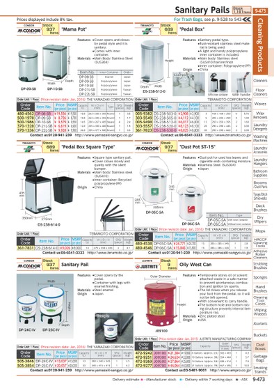 PRICESDISPLAYEDINCLUDE8%TAX.DP-06C-SADS-238-614-0275MM350MMDP-24C-IVDP-25C-IVWIDTHDEPTHEXAMPLEJ09100HEIGHTOUTERDIAMETER435MMHEIGHTDP-05C-SA345MM285MM285MMITEMNO.TYPEDP-05C-SAWITHINNERCONTAINERDP-06C-SAWITHOUTINNERCONTAINERDS-238-512-0HEIGHTDEPTHWIDTHWITHINNERCONTAINERWITHHANDLEEXAMPLEDP-10-SBDP-09-SBDEPTHWIDTHHEIGHTITEMNO.INNERCONTAINERORIGINDP-08-SBENAMELJAPANDP-09-SBPOLYPROPYLENEJAPANDP-10-SBPOLYPROPYLENEJAPANDP-21L-SBPOLYPROPYLENETAIWANDP-22L-SBPOLYPROPYLENETAIWANFORTRASHBAGS,SEEP.9-528TO543CONDORSANITARYPAILORDERCODEITEMNO.PRICE(PERPIECE)MSRP(PERPIECE)CAPACITY(L)WXDXH(MM)SPQ(PIECE)WEIGHT(KG)505-3846DP-24C-IV¥13,037¥13,00010280X340X34512.5505-3854DP-25C-IV¥20,057¥20,00020340X415X41514.2CONTACTUS:0120-941-239HTTP://WWW.YAMAZAKI-SANGYO.CO.JP/TERAMOTO"PEDALBOXSQUARETYPE"ORDERCODEITEMNO.PRICE(PERPIECE)MSRP(PERPIECE)CAPACITY(L)WXDXH(MM)SPQ(PIECE)WEIGHT(KG)361-7831DS-238-614-0¥9,026¥9,00014275X350X43523.1CONTACTUS:06-6541-3333HTTP://WWW.TERAMOTO.CO.JP/CONDOR"MAMAPOT"ORDERCODEITEMNO.PRICE(PERPIECE)MSRP(PERPIECE)CAPACITY(L)WXDXH(MM)TYPESPQ(PIECE)WEIGHT(KG)480-4562DP-08-SB¥19,556¥19,50010.0263X335X355ROUND13.0500-1978DP-09-SB¥8,726¥8,70010.0263X335X355ROUND11.7500-1986DP-10-SB¥9,579¥9,55014.5290X267X405SQUARE42.4370-1328DP-21L-SB¥6,619¥6,60012.0255X330X400ROUND11.9370-1336DP-22L-SB¥9,928¥9,90026.0305X377X580ROUND13.5CONTACTUS:0120-941-239HTTP://WWW.YAMAZAKI-SANGYO.CO.JP/STOCK937ITEMSSTOCK689ITEMSSTOCK937ITEMSORDERUNIT:1PIECE(PRICEREVISIONDATE:JAN,2016)THEYAMAZAKICORPORATIONORDERUNIT:1PIECETERAMOTOCORPORATIONORDERUNIT:1PIECE(PRICEREVISIONDATE:JAN,2016)THEYAMAZAKICORPORATIONFEATURES●COVEROPENSBYTHEPEDAL.●CONTAINERWITHLEGSWITHENAMELFINISHING.MATERIALS●STEELENAMELORIGIN●JAPANFEATURES●SQUARETYPESANITARYPAIL.●COVERCLOSESSLOWLYANDQUIETLYWITHTHESILENTBUMPER.MATERIALS●MAINBODY:STAINLESSSTEEL(SUS410)●INNERCONTAINER:RECYCLEDPOLYPROPYLENE(PP)ORIGIN●CHINAFEATURES●COVEROPENSANDCLOSESBYPEDALSTYLEANDITISSANITARY.●COMESWITHINNERCONTAINER.MATERIALS●MAINBODY:STAINLESSSTEEL(SUS304)JUSTRITEOILYWESTCANORDERCODEITEMNO.PRICE(PERPIECE)MSRP(PERPIECE)CAPACITYOUTERDIAMETERXH(MM)SPQ(PIECE)WEIGHT(KG)472-9242J09100¥21,384¥19,8006GALLONS(APPROX.23L)302X40314.3472-9251J09300¥24,624¥22,80010GALLONS(APPROX.38L)354X46415.7472-9269J09500¥27,864¥25,80014GALLONS(APPROX.53L)408X51417.0472-9277J09700¥44,064¥40,80021GALLONS(APPROX.79L)467X595110.0CONTACTUS:03-5481-9001HTTP://WWW.AMPRO.CO.JP/CONDOR"DUSTPOTST-15"ORDERCODEITEMNO.PRICE(PERPIECE)MSRP(PERPIECE)CAPACITY(L)WXDXH(MM)SPQ(PIECE)WEIGHT(KG)480-4538DP-05C-SA¥24,771¥24,70015285X285X34512.8480-4546DP-06C-SA¥15,845¥15,80015285X285X34511.9CONTACTUS:0120-941-239HTTP://WWW.YAMAZAKI-SANGYO.CO.JP/TERAMOTO"PEDALBOX"ORDERCODEITEMNO.PRICE(PERPIECE)MSRP(PERPIECE)CAPACITY(L)WXDXH(MM)SPQ(PIECE)WEIGHT(KG)005-9382DS-238-503-0¥2,908¥2,9003168X168X25060.75303-5549DS-238-505-0¥4,112¥4,1005205X205X29041.00005-9498DS-238-512-0¥6,017¥6,00012250X250X39521.60303-5557DS-238-520-0¥8,123¥8,10020290X290X44523.00361-7823DS-238-530-0¥8,825¥8,80030290X290X66023.00CONTACTUS:06-6541-3333HTTP://WWW.TERAMOTO.CO.JP/STOCK689ITEMSSTOCK937ITEMSSTOCK9ITEMSORDERUNIT:1PIECETERAMOTOCORPORATIONORDERUNIT:1PIECE(PRICEREVISIONDATE:JAN,2016)THEYAMAZAKICORPORATIONORDERUNIT:1PIECE(PRICEREVISIONDATE:JAN,2015)JUSTRITEMANUFACTURINGCOMPANYFEATURES●TEMPORARILYSTORESOILORSOLVENTATTACHEDWASTEINASAFEMANNERTOPREVENTSPONTANEOUSCOMBUS-TIONANDIGNITIONBYSPARKS.●THELIDCLOSESWHENYOURELEASEYOURFOOTFROMTHEPEDAL,SOITWILLNOTBELEFTOPENED.●WITHCONVENIENTTOCARRYHANDLE.●THEBOTTOMHOLEANDBOTTOMRAIS-INGSTRUCTUREPREVENTSINTERNALTEM-PERATURERISE.MATERIALS●ZINCPLATEDSTEELORIGIN●USAFEATURES●DUSTPOTFORUSEDTEALEAVESANDCIGARETTEENDSCONTAININGMOISTURE.MATERIALS●STAINLESSSTEEL(SUS304)ORIGIN●JAPANFEATURES●SANITARYPEDALTYPE.●RUST-RESISTANTSTAINLESSSTEELMATE-RIALISBEINGUSED.●ALIGHTANDHANDYPOLYPROPYLENEINNERCONTAINERISINCLUDED.MATERIALS●MAINBODY:STAINLESSSTEEL(SUS410)HAIRLINEFINISH●INNERCONTAINER:POLYPROPYLENE(PP)ORIGIN●CHINACLEANINGPRODUCTSCLEANERSFLOORCLEANERSWAXESWAXREMOVERSLAUNDRYDETERGENTSWASHINGMACHINESLAUNDRYACCESSORIESLAUNDRYHANGERSBATHROOMSUPPLIESBROOMS/DUSTPANSTONGS/DITCHSHOVELSDECKBRUSHESDRYWIPERSMOPSHACCPCLEANINGTOOLSADHESIVEROLLERCLEANERSSCRUBBINGBRUSHESSPONGESHANDBRUSHESCLEANINGTOOLCASESWIPINGWASTESABSORBENTSBUCKETSDUSTBOXESGARBAGEBAGSSMOKINGSTANDSSANITARYPAILSSTOCK1,181ITEMS9-473*0519030*9-473DELIVERYESTIMATE★…MANUFACTURERSTOCK★…DELIVERYWITHIN7WORKINGDAYS★…ASK