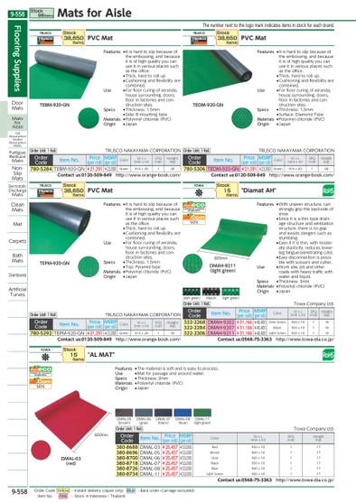 THENUMBERNEXTTOTHELOGOMARKINDICATESITEMSINSTOCKFOREACHBRAND.TEBM-920-GNTEPM-920-GNTEDM-920-GN(BLACK)(LIGHTGREEN)(DARKGREEN)DMAH-9211(LIGHTGREEN)920MMDMAL-05(BROWN)DMAL-06(GRAY)DMAL-07(BLACK)DMAL-08(BLUE)DMAL-11(LIGHTGREEN)DMAL-03(RED)920MMTOWA"ALMAT"STOCK15ITEMSORDERUNIT:1ROLLTOWACOMPANYLTD.ORDERCODEITEMNO.PRICE(PERROLL)MSRP(PERROLL)COLORWXL(MMXM)SPQ(ROLL)WEIGHT(KG)380-8688DMAL-03¥25,457¥33,000RED920X10117380-8696DMAL-05¥25,457¥33,000BROWN920X10117380-8700DMAL-06¥25,457¥33,000GRAY920X10117380-8718DMAL-07¥25,457¥33,000BLACK920X10117380-8726DMAL-08¥25,457¥33,000BLUE920X10117380-8734DMAL-11¥25,457¥33,000LIGHTGREEN920X10117CONTACTUS:0568-75-3363HTTP://WWW.TOWA-DIA.CO.JP/TRUSCOPVCMATORDERCODEITEMNO.PRICE(PERROLL)MSRP(PERROLL)COLORWXL(MMXM)SPQ(ROLL)WEIGHT(KG)780-5284TEBM-920-GN¥21,291¥23,000GREEN915X20128CONTACTUS:0120-509-849HTTP://WWW.ORANGE-BOOK.COM/TRUSCOPVCMATORDERCODEITEMNO.PRICE(PERROLL)MSRP(PERROLL)COLORWXL(MMXM)SPQ(ROLL)WEIGHT(KG)780-5292TEPM-920-GN¥21,291¥23,000GREEN915X20128CONTACTUS:0120-509-849HTTP://WWW.ORANGE-BOOK.COM/STOCK38,650ITEMSSTOCK38,650ITEMSORDERUNIT:1ROLLTRUSCONAKAYAMACORPORATIONORDERUNIT:1ROLLTRUSCONAKAYAMACORPORATIONCHEMICALCONTENTINSPECTION.COMECO.COMSDSFEATURES●THEMATERIALISSOFTANDISEASYTOPROCESS.USE●MATFORPASSAGEANDAROUNDWATER.SPECS●THICKNESS:2MMMATERIALS●POLYVINYLCHLORIDE(PVC)ORIGIN●JAPANFEATURES●ITISHARDTOSLIPBECAUSEOFTHEEMBOSSING,ANDBECAUSEITISOFHIGHQUALITYYOUCANUSEITINVARIOUSPLACESSUCHASTHEOFFICE.●THICK,HARDTOROLLUP.●CUSHIONINGANDFLEXIBILITYARECOMBINED.USE●FORFLOORCURINGOFVERANDA,HOUSESURROUNDING,DOORS,FLOORINFACTORIESANDCON-STRUCTIONSITES.SPECS●THICKNESS:1.5MM●SIDE:BMOUNTINGTYPEMATERIALS●POLYVINYLCHLORIDE(PVC)ORIGIN●JAPANFEATURES●ITISHARDTOSLIPBECAUSEOFTHEEMBOSSING,ANDBECAUSEITISOFHIGHQUALITYYOUCANUSEITINVARIOUSPLACESSUCHASTHEOFFICE.●THICK,HARDTOROLLUP.●CUSHIONINGANDFLEXIBILITYARECOMBINED.USE●FORFLOORCURINGOFVERANDA,HOUSESURROUNDING,DOORS,FLOORINFACTORIESANDCON-STRUCTIONSITES.SPECS●THICKNESS:1.5MM●TOP:PYRAMIDTYPEMATERIALS●POLYVINYLCHLORIDE(PVC)ORIGIN●JAPANCHEMICALCONTENTINSPECTION.COMECO.COMSDSTRUSCOPVCMATORDERCODEITEMNO.PRICE(PERROLL)MSRP(PERROLL)COLORWXL(MMXM)SPQ(ROLL)WEIGHT(KG)780-5306TEDM-920-GN¥21,291¥23,000GREEN915X20128CONTACTUS:0120-509-849HTTP://WWW.ORANGE-BOOK.COM/STOCK38,650ITEMSORDERUNIT:1ROLLTRUSCONAKAYAMACORPORATIONTOWA"DIAMATAH"STOCK15ITEMSORDERCODEITEMNO.PRICE(PERROLL)MSRP(PERROLL)COLORWXL(MMXM)SPQ(ROLL)WEIGHT(KG)322-2268DMAH-9202¥31,166¥40,400DARKGREEN920X10118322-2284DMAH-9207¥31,166¥40,400BLACK920X10118322-2306DMAH-9211¥31,166¥40,400LIGHTGREEN920X10118CONTACTUS:0568-75-3363HTTP://WWW.TOWA-DIA.CO.JP/ORDERUNIT:1ROLLTOWACOMPANYLTD.FEATURES●ITISHARDTOSLIPBECAUSEOFTHEEMBOSSING,ANDBECAUSEITISOFHIGHQUALITYYOUCANUSEITINVARIOUSPLACESSUCHASTHEOFFICE.●THICK,HARDTOROLLUP.●CUSHIONINGANDFLEXIBILITYARECOMBINED.USE●FORFLOORCURINGOFVERANDA,HOUSESURROUNDING,DOORS,FLOORINFACTORIESANDCON-STRUCTIONSITES.SPECS●THICKNESS:1.5MM●SURFACE:DIAMONDTYPEMATERIALS●POLYVINYLCHLORIDE(PVC)ORIGIN●JAPANFEATURES●WITHUNEVENSTRUCTURE,CANSTRONGLYGRIPTHEBACKSIDEOFSHOE.●SINCEITISATHINTYPEDRAIN-AGESTRUCTUREANDVENTILATIONSTRUCTURE,THEREISNOGAPANDAVOIDSDANGERSSUCHASSTUMBLING.●EVENIFITISTHIN,WITHMODER-ATEELASTICITY,REDUCESLOWERLEGFATIGUE/PENETRATINGCOLD.●EASYDISCONNECTIONISPOSSI-BLEWITHSCISSORSANDCUTTER.USE●WORKSITE,PITANDOTHERROADSWITHHEAVYTRAFFICWITHWATERANDLIQUID.SPECS●THICKNESS:3MMMATERIALS●POLYVINYLCHLORIDE(PVC)ORIGIN●JAPANFLOORINGSUPPLIESDOORMATSMATSFORAISLEOILABSORPTIONWATERABSORPTIONMATSFATIGUEREDUCEMATSNON-SLIPMATSELECTROSTATICDISCHARGEMATSCLEANMATSMATCARPETSBATHMATSDRAINBOARDSARTIFICIALTURVESSTOCK98ITEMSMATSFORAISLE9-558*0519791*9-558ORDERCODEYELLOW…INSTANTDELIVERY(JAPANONLY)BLUE…BACKORDER(CARRIAGEEXCLUDED)ITEMNO.PINK…STOCKININDONESIA/THAILAND