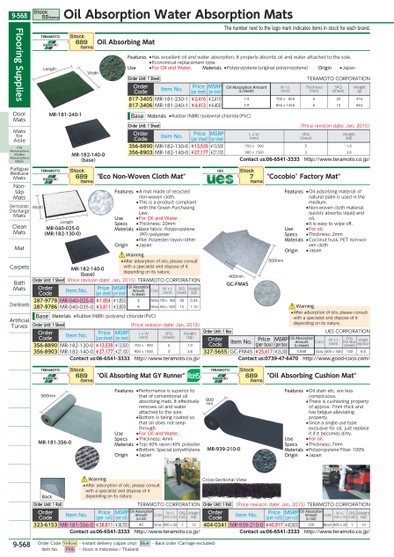 THENUMBERNEXTTOTHELOGOMARKINDICATESITEMSINSTOCKFOREACHBRAND.MR-182-140-0(BASE)WIDTHLENGTHMR-181-240-1500MM400MMGC-FM45MR-182-140-0(BASE)MR-040-025-0(MR-182-130-0)LENGTHEXAMPLEWIDTHMR-181-356-0900MMBACKEXAMPLE900MMMR-939-210-0CROSS-SECTIONALVIEWTERAMOTOOILABSORBINGMATSTOCK689ITEMSORDERUNIT:1SHEET(PRICEREVISIONDATE:JAN,2015)ORDERCODEITEMNO.PRICE(PERSHEET)MSRP(PERSHEET)LXW(MM)SPQ(SHEET)WEIGHT(KG)356-8890MR-182-130-0¥13,539¥13,500750X90051.9356-8903MR-182-140-0¥27,177¥27,100900X150033.8CONTACTUS:06-6541-3333HTTP://WWW.TERAMOTO.CO.JP/ORDERUNIT:1SHEETTERAMOTOCORPORATIONORDERCODEITEMNO.PRICE(PERSHEET)MSRP(PERSHEET)OILABSORPTIONAMOUNT(L/SHEET)WXL(MM)THICKNESS(MM)SPQ(SHEET)WEIGHT(G)817-3405MR-181-230-1¥2,416¥2,4101.4700X850620416817-3406MR-181-240-1¥4,413¥4,4002.9850X1450610862TERAMOTO"ECONON-WOVENCLOTHMAT"ORDERCODEITEMNO.PRICE(PERSHEET)MSRP(PERSHEET)LXW(MM)SPQ(SHEET)WEIGHT(KG)356-8890MR-182-130-0¥13,539¥13,500750X90051.9356-8903MR-182-140-0¥27,177¥27,100900X150033.8CONTACTUS:06-6541-3333HTTP://WWW.TERAMOTO.CO.JP/ORDERCODEITEMNO.PRICE(PERSHEET)MSRP(PERSHEET)OILABSORPTIONAMOUNT(L/SHEET)COLORWXL(MM)SPQ(SHEET)WEIGHT(KG)287-9778MR-040-025-0¥1,854¥1,8504WHITE700X850300.54287-9786MR-040-035-0¥3,811¥3,8008WHITE850X1450151.10STOCK689ITEMSORDERUNIT:1SHEET(PRICEREVISIONDATE:JAN,2015)TERAMOTOCORPORATIONORDERUNIT:1SHEET(PRICEREVISIONDATE:JAN,2015)ORDERCODEITEMNO.PRICE(PERROLL)MSRP(PERROLL)OILABSORPTIONAMOUNT(L/ROLL)COLORWXL(MMXM)SPQ(ROLL)WEIGHT(KG)323-6153MR-181-356-0¥38,811¥38,70040GRAY900X20112CONTACTUS:06-6541-3333HTTP://WWW.TERAMOTO.CO.JP/ORDERUNIT:1ROLLTERAMOTOCORPORATIONTERAMOTO"OILABSORBINGMATGYRUNNER"STOCK689ITEMSFEATURES●HASEXCELLENTOILANDWATERABSORPTION.ITPROPERLYABSORBSOILANDWATERATTACHEDTOTHESOLE.●ECONOMICALREPLACEMENTTYPE.USE●FOROILANDWATER.MATERIALS●RUBBER(NBR)/POLYVINYLCHLORIDE(PVC)BASEFEATURES●AMATMADEOFRECYCLEDNON-WOVENCLOTH.●THISISAPRODUCTCOMPLIANTWITHTHEGREENPURCHASINGLAW.USE●FOROILANDWATER.SPECS●THICKNESS:20MMMATERIALS●BASEFABRIC:POLYPROPYLENE(PP)/POLYESTER●PILE:POLYESTER/RAYON/OTHERORIGIN●JAPANMATERIALS●RUBBER(NBR)/POLYVINYLCHLORIDE(PVC)BASE●AFTERADSORPTIONOFOILS,PLEASECONSULTWITHASPECIALISTANDDISPOSEOFITDEPENDINGONITSNATURE.WARNINGFEATURES●PERFORMANCEISSUPERIORTOTHATOFCONVENTIONALOILABSORBINGMATS.ITEFFECTIVELYREMOVESOILANDWATERATTACHEDTOTHESOLE.●BOTTOMISBEINGCOATEDSOTHATOILDOESNOTSEEPTHROUGH.USE●FOROILANDWATER.SPECS●THICKNESS:4MMMATERIALS●TOP:60%RAYON/40%POLYESTER●BOTTOM:SPECIALPOLYETHYLENEORIGIN●JAPAN●AFTERADSORPTIONOFOILS,PLEASECONSULTWITHASPECIALISTANDDISPOSEOFITDEPENDINGONITSNATURE.WARNINGMATERIALS●POLYPROPYLENE(ORIGINALPOLYPROPYLENE)ORIGIN●JAPANUES"COCOBIO®FACTORYMAT"ORDERCODEITEMNO.PRICE(PERBOX)MSRP(PERBOX)OILABSORPTIONAMOUNT(L/SHEET)COLORWXL(MM)Q'TYPERBOX(SHEET)WEIGHT(KG/BOX)327-5655GC-FM45¥25,617¥25,3000.888GRAY400X5001008.5CONTACTUS:0739-47-6470HTTP://WWW.GOOD-COCO.COM/STOCK7ITEMSORDERUNIT:1BOXUESCORPORATIONORDERCODEITEMNO.PRICE(PERROLL)MSRP(PERROLL)OILABSORPTIONAMOUNT(L/ROLL)COLORWXL(MMXM)SPQ(ROLL)WEIGHT(KG)404-0341MR-939-210-0¥40,917¥40,800100BLACK900X20113CONTACTUS:06-6541-3333HTTP://WWW.TERAMOTO.CO.JP/ORDERUNIT:1ROLL(PRICEREVISIONDATE:JAN,2015)TERAMOTOCORPORATIONTERAMOTO"OILABSORBINGCUSHIONMAT"STOCK689ITEMSFEATURES●OILADSORBINGMATERIALOFNATURALPALMISUSEDINTHEMEDIUM.●NON-WOVENCLOTHMATERIALQUICKLYABSORBSLIQUIDANDOIL.●ITISEASYTOWIPEOFF.USE●FOROIL.SPECS●THICKNESS:2MMMATERIALS●COCONUTHUSK,PETNON-WO-VENCLOTHORIGIN●JAPAN●AFTERADSORPTIONOFOILS,PLEASECONSULTWITHASPECIALISTANDDISPOSEOFITDEPENDINGONITSNATURE.WARNINGFEATURES●OILSTAINETC.ARELESSCONSPICUOUS.●THEREISCUSHIONINGPROPERTYOFAPPROX.7MMTHICKANDHASFATIGUEALLEVIATINGPROPERTY.●SINCEASINGLEUSETYPEEXCLUSIVEFOROIL,JUSTREPLACEITIFITBECOMESDIRTY.USE●FOROIL.SPECS●THICKNESS:7MMMATERIALS●POLYPROPYLENEFIBER100%ORIGIN●JAPANFLOORINGSUPPLIESDOORMATSMATSFORAISLEOILABSORPTIONWATERABSORPTIONMATSFATIGUEREDUCEMATSNON-SLIPMATSELECTROSTATICDISCHARGEMATSCLEANMATSMATCARPETSBATHMATSDRAINBOARDSARTIFICIALTURVESSTOCK55ITEMSOILABSORPTIONWATERABSORPTIONMATS9-568*0519856*9-568ORDERCODEYELLOW…INSTANTDELIVERY(JAPANONLY)BLUE…BACKORDER(CARRIAGEEXCLUDED)ITEMNO.PINK…STOCKININDONESIA/THAILAND