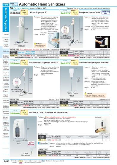 THENUMBERNEXTTOTHELOGOMARKINDICATESITEMSINSTOCKFOREACHBRAND.EXAMPLEEXAMPLEYE-08L-ID1430MM506MM340MM41824(CARTRIDGEBOTTLEISSOLDSEPARATELY)1155TO1555MM326MM270MM41807(CONTENTLIQUIDISSOLDSEPARATELY)1100MM315MM412MM419681310TO1700MM350MM350MMFORHANDSANITIZERS,SEEP.9-644TO6474193342019(DISINFECTANT)100MM142MMEXAMPLE275MMCONDOR"ALCOHOLSPRAYERF"STOCK937ITEMSORDERUNIT:1PIECE(PRICEREVISIONDATE:JAN,2016)THEYAMAZAKICORPORATIONORDERCODEITEMNO.PRICE(PERPIECE)MSRP(PERPIECE)WXDXH(MM)SPQ(PIECE)WEIGHT(KG)375-6556YE-08L-ID¥33,429¥33,333340X506X1430110.4CONTACTUS:0120-941-239HTTP://WWW.YAMAZAKI-SANGYO.CO.JP/SARAYAFOOT-OPERATEDDISPENSER"HC-8000"STOCK213ITEMSORDERUNIT:1PIECESARAYACO.LTD.ORDERCODEITEMNO.PRICE(PERPIECE)MSRP(PERPIECE)WXDXH(MM)SPQ(PIECE)WEIGHT(KG)470-522041824¥24,300¥24,000270X326X1155TO155514.64CONTACTUS:06-6797-2525HTTP://WWW.SARAYA.COM/SARAYANO-TOUCHTYPEDISPENSER"UD-8600A-PHJ"ORDERCODEITEMNO.PRICE(PERPIECE)MSRP(PERPIECE)WXDXH(MM)CAPACITY(L)INJECTIONQUANTITY(ML/TIMES)SPQ(PIECE)WEIGHT(G)493-015142019¥1,479¥1,460107X68X1720.6APPROX.1.56584.5CONTACTUS:06-6797-2525HTTP://WWW.SARAYA.COM/ORDERCODEITEMNO.PRICE(PERPIECE)MSRP(PERPIECE)WXDXH(MM)CAPACITY(L)INJECTIONQUANTITY(ML/TIMES)WEIGHT(G)431-624041933¥9,113¥9,000142X100X2750.61.5680STOCK213ITEMSORDERUNIT:1PIECESARAYACO.LTD.ORDERUNIT:1PIECEFEATURES●STEPONAPEDALTODISCHARGEANDSPRAYANADEQUATEAMOUNTOFSOLUTION.●THEHEIGHTOFTHESTANDCANBEADJUSTEDEASILY.ORIGIN●CHINAFEATURES●NOPOWERSOURCEREQUIRINGPEDAL-OPERATEDALCOHOLSPRAYERSTANDWHICHDISIN-FECTSHYGIENICALLYWITHOUTTOUCHINGTHEBOTTLE.●CANBEADJUSTEDTOSUITTHECOMMERCIALLYAVAILABLEPUMPTYPEDISPENSERS.MATERIALS●MAINBODY:STEELWITHACRYLICBAKEDCOATING●TRAY:RESINORIGIN●JAPAN●ALCOHOLDISPENSERISNOTINCLUDED.WARNINGFEATURES●SPRAYSANTISEPTICSOLUTIONWITHSENSORDETECTION.●THECONTAINERISDISPOSABLEANDHYGIENIC.●SPRAYAMOUNTISAPPROX.1.5MLPERSHOT.SPECS●POWERSUPPLY:USINGCSIZEALKALINEDRYBATTERYX4(SOLDSEPARATELY)●WITHKEYORIGIN●CHINAFEATURES●HANDSANITIZERCONTAININGINGREDIENTSTHATAREALSOUSEDASFOODADDITIVES.●MOSTSUITABLEFORHANDDISINFECTIONFORFOODHANDLERS.ORIGIN●JAPANDISINFECTANTSARAYAFOOT-OPERATEDDISPENSER"HC-400"REPAIRINGOKSTOCK213ITEMSORDERUNIT:1PIECESARAYACO.LTD.ORDERCODEITEMNO.PRICE(PERPIECE)MSRP(PERPIECE)WXDXH(MM)SPQ(PIECE)WEIGHT(KG)382-088241807¥24,300¥24,000315X412X110013CONTACTUS:06-6797-2525HTTP://WWW.SARAYA.COM/SARAYASTANDFORNO-TOUCHTYPEDISPENSER"IS-9000-PHJ"STOCK213ITEMSORDERUNIT:1PIECESARAYACO.LTD.ORDERCODEITEMNO.PRICE(PERPIECE)MSRP(PERPIECE)WXDXH(MM)SPQ(PIECE)WEIGHT(KG)411-100141968¥9,113¥9,000350X350X1310TO170015.7CONTACTUS:06-6797-2525HTTP://WWW.SARAYA.COM/●PUSHTYPEDISPENSERMAYNOTBEUSEDASITCANTIPOVERWHENUSING.WARNINGFEATURES●PEDALTYPEWHICHDOESNOTREQUIREPOWERSOURCEANDCANBEINSTALLEDANYWHERE.●ONESTEPONAPEDALSPRAYSAPPROX.1.6MLOFANTISEPTICSOLUTION.ACCESSORIES●1LCARTRIDGEBOTTLE(CONTENTSOLUTIONISSOLDSEPARATELY)ORIGIN●CHINAFEATURES●STANDFORNO-TOUCHTYPEDISPENSER.●JUSTPLACETOUSESOUSEFULINPLACESWHEREINSTALLMENTTOTHEWALLORCOUNTERISNOTPOSSIBLE.●EQUIPPEDWITHANENLIGHTENINGPANEL.SPECS●COMPATIBLEMAINUNIT:41962(GUD-1000PHJ)MATERIALS●STAND:IRON+COATING●SUPPORT:IRON+COATING●ADJUSTMENTGRIP:POLYPROPYLENE(PP)●PANEL:ABSORIGIN●CHINAJANITORIALSUPPLIESCLEANERSHANDSOAPSHANDCREAMSDISINFECTANTSSTERILIZATIONPRODUCTSGARGLES・GARGLEMACHINESSHOWERS・EYEWASHERSDETERGENTSFORKITCHENEQUIPMENTSBACTERIAELIMINATIONBLEACHESFOODSANITATIONPRODUCTSHANDDRYERSPAPERTOWELSBATHROOMFURNISHINGSDEODRIZERS,AROMATICSALCOHOLCHECKERSWEIGHTSCALESHEALTHYPROMOTIONPRODUCTSLIFECAREPRODUCTSHEALTHCAREPRODUCTSSTOCK89ITEMSAUTOMATICHANDSANITIZERS9-648*0520531*9-648ORDERCODEYELLOW…INSTANTDELIVERY(JAPANONLY)BLUE…BACKORDER(CARRIAGEEXCLUDED)ITEMNO.PINK…STOCKININDONESIA/THAILAND