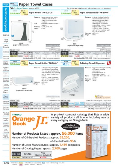 THENUMBERNEXTTOTHELOGOMARKINDICATESITEMSINSTOCKFOREACHBRAND.52007(PAPERSOLDSEPARATELY)244MM202MM134MM243MM100MM77MMAPPLICABLESHEETITEMNO.5201352011(PAPERSOLDSEPARATELY)793924255MM110MM255MMAPPLICABLESHEETITEMNO.52013APPLICABLESHEETITEMNO.5201352008(PAPERSOLDSEPARATELY)284MM280MM110MMPUBLISHEDONCEEVERY2YEARSAPRO-TOOLCOMPACTCATALOGTHATLISTSAWIDEVARIETYOFPRODUCTSALLINONE,INCLUDINGNEARLYEVERYCATEGORYONORANGE-BOOK!NUMBEROFPRODUCTSLISTED:APPROX.56,000ITEMSNUMBEROFOff-THE-SHELFPRODUCTS:APPROX.53,200,Off-THE-SHELFRATIO95%NUMBEROFLISTEDMANUFACTURERS:APPROX.1,419COMPANIESNUMBEROFCATALOGPAGES:APPROX.2,700PAGESORDERCODEITEMNO.PRICE(TAXNOTINCLUDED)858-5867OBJM2018E¥5,500FORPAPERTOWELS,SEEP.9-700SARAYAPAPERHOLDER"PH-600-GL"ORDERCODEITEMNO.PRICE(PERPIECE)MSRP(PERPIECE)WXDXH(MM)NUMBEROFSTORABLESHEETS(SHEETS)SPQ(PIECE)WEIGHT(G)496-058152008¥3,443¥3,400280X110X2846001720CONTACTUS:06-6797-2525HTTP://WWW.SARAYA.COM/SARAYAPAPERTOWELHOLDER"PH-200N"ORDERCODEITEMNO.PRICE(PERPIECE)MSRP(PERPIECE)WXDXH(MM)NUMBEROFSTORABLESHEETS(SHEETS)SPQ(PIECE)WEIGHT(G)474-156152007¥2,916-244X100X772001270CONTACTUS:06-6797-2525HTTP://WWW.SARAYA.COM/STOCK213ITEMSSTOCK213ITEMSORDERUNIT:1PIECESARAYACO.LTD.ORDERUNIT:1PIECESARAYACO.LTD.FEATURES●LARGEVOLUMETYPEWHICHCANHOLD600SHEETSTOSPARETHEREPLENISHMENTTROUBLES.USE●RIGIDENFORCEMENTOFHANDHYGIENE.MATERIALS●COVER,CASE:ABSORIGIN●CHINAFEATURES●ADESIGNTHATPERFECTLYFITSSOPHISTICATEDTOILETSPACE.●TWO-WAYSPECIFICATIONWITHWALL-MOUNTAINGANDSTANDINGTYPEBYSWITCHINGTHEFRONTPANELS.●THEFRONTPANELISTRANSLU-CENTSOTHEREMAININGQUAN-TITYCANBECHECKED.MATERIALS●ABSRESINORIGIN●CHINASARAYAPAPERTOWELHOLDER"PH-600N"ORDERCODEITEMNO.PRICE(PERPIECE)MSRP(PERPIECE)WXDXH(MM)NUMBEROFSTORABLESHEETS(SHEETS)SPQ(PIECE)WEIGHT(G)474-157952011¥5,225-255X110X2556001685CONTACTUS:06-6797-2525HTTP://WWW.SARAYA.COM/STOCK213ITEMSORDERUNIT:1PIECESARAYACO.LTD.ELLEAIRTABLETOPTOWELDISPENSERSTOCK73ITEMSORDERUNIT:1PIECEELLEAIRBUSINESSSUPPORTCORPORATIONORDERCODEITEMNO.PRICE(PERPIECE)MSRP(PERPIECE)WXDXH(MM)STORABLENUMBER(SHEETS)SPQ(PIECE)WEIGHT(G)836-4713793924¥2,854-202X134X243200TO2201700URLHTTP://WWW.ELLEAIR-BS.CO.JP/FEATURES●ADESIGNTHATPERFECTLYFITSSOPHISTICATEDTOILETSPACE.●LARGEVOLUMETYPEWHICHCANHOLD600SHEETSFORREDUCINGTHETROUBLESFORREPLENISHINGINPLACESWHERELARGEQUANTITYISUSED.●THEFRONTPANELISTRANSLU-CENTSOTHEREMAININGQUAN-TITYCANBECHECKED.MATERIALS●ABSRESINORIGIN●CHINAFEATURES●HYGIENICANDEASYTOTAKEBYPLACINGTHEOPENINGDOWNWARD.●PORTABLEANDCANBEINSTALLEDANYWHERE.SPECS●APPLICABLESHEETSIZE:170X220MMMATERIALS●PLASTICORIGIN●JAPAN●DEDICATEDFORSMALLSIZEWARNINGJANITORIALSUPPLIESCLEANERSHANDSOAPSHANDCREAMSDISINFECTANTSSTERILIZATIONPRODUCTSGARGLES・GARGLEMACHINESSHOWERS・EYEWASHERSDETERGENTSFORKITCHENEQUIPMENTSBACTERIAELIMINATIONBLEACHESFOODSANITATIONPRODUCTSHANDDRYERSPAPERTOWELSBATHROOMFURNISHINGSDEODRIZERS,AROMATICSALCOHOLCHECKERSWEIGHTSCALESHEALTHYPROMOTIONPRODUCTSLIFECAREPRODUCTSHEALTHCAREPRODUCTSSTOCK66ITEMSPAPERTOWELCASES9-704*0521003*9-704ORDERCODEYELLOW…INSTANTDELIVERY(JAPANONLY)BLUE…BACKORDER(CARRIAGEEXCLUDED)ITEMNO.PINK…STOCKININDONESIA/THAILAND