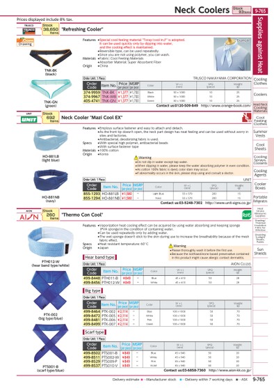 PRICESDISPLAYEDINCLUDE8%TAX.EXAMPLETNK-BK(BLACK)TNK-GN(GREEN)PTH012-W(HEARBANDTYPE/WHITE)PTK-002(BIGTYPE/BLUE)PTS001-B(SCARFTYPE/BLUE)HO-881LB(LIGHTBLUE)HO-881NB(NAVY)UNITNECKCOOLER"MAZICOOLEX"STOCK692ITEMSORDERUNIT:1PIECEUNITORDERCODEITEMNO.PRICE(PERPIECE)MSRP(PERPIECE)COLORWXL(MM)SPQ(PIECE)WEIGHT(G)855-1293HO-881LB¥1,580-LIGHTBLUE55X57020015855-1294HO-881NB¥1,580-NAVY55X57020015CONTACTUS:03-5248-7302HTTP://WWW.UNIT-SIGNS.CO.JP/TRUSCO"REFRESHINGCOOLER"ORDERCODEITEMNO.PRICE(PERPIECE)MSRP(PERPIECE)COLORWXL(MM)SPQ(PIECE)WEIGHT(G)374-9959TNK-BK¥1,377¥1,700BLACK50X10001025374-9967TNK-WB¥1,377¥1,700WHITE50X10001025405-4741TNK-GN¥1,377¥1,700GREEN50X10001025CONTACTUS:0120-509-849HTTP://WWW.ORANGE-BOOK.COM/AION"THERMOCONCOOL"ORDERCODEITEMNO.PRICE(PERPIECE)MSRP(PERPIECE)COLORWXL(MM)SPQ(PIECE)WEIGHT(G)499-8502PTS001-B¥849-BLUE45X9405020499-8511PTS002-W¥849-WHITE45X9405020499-8529PTS009-P¥849-PINK45X9405020499-8537PTS010-V¥849-VIOLET45X9405020CONTACTUS:03-6858-7360HTTP://WWW.AION-KK.CO.JP/ORDERCODEITEMNO.PRICE(PERPIECE)MSRP(PERPIECE)COLORWXL(MM)SPQ(PIECE)WEIGHT(G)499-8448PTH011-B¥849-BLUE45X4105028499-8456PTH012-W¥849-WHITE45X4105028ORDERCODEITEMNO.PRICE(PERPIECE)MSRP(PERPIECE)COLORWXL(MM)SPQ(PIECE)WEIGHT(G)499-8464PTK-002¥2,114-BLUE100X10005070499-8472PTK-005¥2,114-WHITE100X10005070499-8481PTK-006¥2,114-PINK100X10005070499-8499PTK-007¥2,114-VIOLET100X10005070STOCK260ITEMSSTOCK38,650ITEMSORDERUNIT:1PIECEORDERUNIT:1PIECEAIONCO.LTD.ORDERUNIT:1PIECEORDERUNIT:1PIECETRUSCONAKAYAMACORPORATIONFEATURES●EMPLOYSSURFACEFASTENERANDEASYTOATTACHANDDETACH.●ASTHEFRONTTIPDOESN'TOPEN,THENECKPARTDESIGNHASNEATFEELINGANDCANBEUSEDWITHOUTWORRYINSITESANDFACTORIES.●ANTIBACTERIAL,DEODORIZINGFABRICISUSED.SPECS●WITHSPECIALHIGHPOLYMER,ANTIBACTERIALBEADS●WITHSURFACEFASTENERTAPEMATERIALS●100%COTTONORIGIN●KOREADRAWING.COMFEATURES●SPECIALCOOLFEELINGMATERIAL"TORAY/COOLIN®F"ISADOPTED.ITCANBEUSEDQUICKLYONLYBYDIPPINGINTOWATER,ANDTHECOOLINGEFFECTISMAINTAINED.●REVERSIBLETYPE,CANBEUSEDREPEATEDLY.●SINCEYOUARENOTUSINGPOLYMER,YOUCANWASH.MATERIALS●FABRIC:COOLFEELINGMATERIALS●ABSORBERMATERIAL:SUPERABSORBENTFIBERORIGIN●CHINAFEATURES●VAPORIZATIONHEATCOOLINGEFFECTCANBEACQUIREDBYUSINGWATERABSORBINGANDKEEPINGSPONGE(PVASPONGE)INTHECONDITIONOFCONTAININGWATER.●CANBEUSEDREPEATEDLYONLYBYADDINGWATER.●THEWETSPONGEDOESN'TSTICKTOTHESKINDURINGUSETOINCREASETHEBREATHABILITYBECAUSEOFTHEMESHFABRICEFFECT.SPECS●HEATRESISTANTTEMPERATURE:60°CORIGIN●JAPANHEARBANDTYPEBIGTYPESCARFTYPE●PLEASETHOROUGHLYWASHITBEFORETHEFIRSTUSE.●BECAUSETHEISOTHIAZOLINONEBASEDPRESERVATIVECONTAINEDINTHISPRODUCTMIGHTCAUSEALLERGICCONTACTDERMATITIS.WARNING●DONOTDIPINWATEREXCEPTTAPWATER.●WHENDIPPINGINWATER,PLEASEKEEPTHEWATERABSORBINGPOLYMERINEVENCONDITION.●ASCOTTON100%FABRICISDYED,COLORSTAINMAYOCCUR.●IFABNORMALITYOCCURSINTHESKIN,PLEASESTOPUSINGANDCONSULTADOCTOR.WARNINGSUPPLIESAGAINSTHEATCOOLINGCLOTHESCOOLERSHEAD/NECKCOOLINGMATERIALSCOOLFEELINGCLOTHESSUMMERVESTSCOOLSHEETSCOOLINGSPRAYS,COOLANTSCOOLINGAGENTSCOOLERBOXESPORTABLEREFRIGERATORSHEATSTROKEMEASURESSUPPLIESSHADING/THERMALINSULATIONFILMSFORWINDOWSHIELDINGSUNLIGHTSHEETS,PAINTSSUNSHIELDSNECKCOOLERSSTOCK93ITEMS9-765*0522251*9-765DELIVERYESTIMATE★…MANUFACTURERSTOCK★…DELIVERYWITHIN7WORKINGDAYS★…ASK