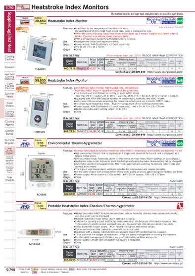 THENUMBERNEXTTOTHELOGOMARKINDICATESITEMSINSTOCKFOREACHBRAND.TNM-00172MM38MM77MM121MMTNM-00223MM72MM108MM133MMAD5686174MM37MMAD5694ATRUSCOHEATSTROKEINDEXMONITORREPAIRINGOKCALIBURATIONOKORDERCODEITEMNO.PRICE(PERPIECE)MSRP(PERPIECE)HEATSTROKEINDEXDISPLAYRANGE(°C)MEASURINGRANGEMINIMUMDISPLAYSPQ(PIECE)WEIGHT(G)TEMPERATURE(°C)HUMIDITY(%RH)HEATSTROKEINDEX(°C)TEMPERATURE(°C)HUMIDITY(%RH)402-7116TNM-001¥3,337¥4,120-0TO4020TO90-0.112075CONTACTUS:0120-509-849HTTP://WWW.ORANGE-BOOK.COM/STOCK38,650ITEMSORDERUNIT:1PIECE(PRICEREVISIONDATE:JAN,2016)TRUSCONAKAYAMACORPORATIONTRUSCOHEATSTROKEINDEXMONITORREPAIRINGOKCALIBURATIONOKCONTACTUS:0120-509-849HTTP://WWW.ORANGE-BOOK.COM/STOCK38,650ITEMSORDERUNIT:1PIECE(PRICEREVISIONDATE:JAN,2016)TRUSCONAKAYAMACORPORATIONA&DENVIRONMENTALTHERMO-HYGROMETERREPAIRINGOKCALIBURATIONOKORDERCODEITEMNO.PRICE(PERPIECE)MSRP(PERPIECE)HEATSTROKEINDEXDISPLAYRANGE(°C)MEASURINGRANGEMINIMUMDISPLAYSPQ(PIECE)WEIGHT(G)TEMPERATURE(°C)HUMIDITY(%RH)HEATSTROKEINDEX(°C)TEMPERATURE(°C)HUMIDITY(%RH)480-8401AD5686¥8,100¥8,0000TO600TO5020TO900.10.1110240CONTACTUS:03-5391-6126HTTP://WWW.AANDD.CO.JP/STOCK339ITEMSORDERUNIT:1PIECEA&DCO.LTD.ORDERCODEITEMNO.PRICE(PERPIECE)MSRP(PERPIECE)HEATSTROKEINDEXDISPLAYRANGE(°C)MEASURINGRANGEMINIMUMDISPLAYSPQ(PIECE)WEIGHT(G)TEMPERATURE(°C)HUMIDITY(%RH)HEATSTROKEINDEX(°C)TEMPERATURE(°C)HUMIDITY(%RH)402-7124TNM-002¥4,163¥5,140-50TO700TO4020TO900.10.112095A&DPORTABLEHEATSTROKEINDEXCHECKER/THERMO-HYGROMETERSTOCK339ITEMSORDERUNIT:1PIECEA&DCO.LTD.ORDERCODEITEMNO.PRICE(PERPIECE)MSRP(PERPIECE)HEATSTROKEINDEXDISPLAYRANGE(°C)MEASURINGRANGEMINIMUMDISPLAYSPQ(PIECE)WEIGHT(G)TEMPERATURE(°C)HUMIDITY(%RH)HEATSTROKEINDEX(°C)TEMPERATURE(°C)HUMIDITY(%RH)855-8495AD5694A¥6,582¥6,5000TO600TO5020TO900.10.11165CONTACTUS:03-5391-6126HTTP://WWW.AANDD.CO.JP/DRAWING.COMFEATURES●INADDITIONTOTHETEMPERATURE/HUMIDITYINDICATION,THEALERTNESSOFDRYING,MOLD,HEATSTROKEINDEXLEVELISDISPLAYEDBYICON.●WHENTHEICONSOFDRYING,FUNGI,HEATSTROKEINDEXLIGHTSUP,ITMEANS"CAUTION"AND"ALERT"WHENITBLINKS.(COMFORTICONWILLBELITBUTDOESNOTFLASH)●WITHATEMPERATURE/HUMIDITYMAX/MINMEMORYFUNCTION.USE●MANAGEMENTOFTHEWORKINGENVIRONMENT.SPECS●POWERSUPPLY:AAADRYBATTERYX2(SOLDSEPARATELY)●WXDXH:77X38X72MMORIGIN●CHINAAPPROX.3WEEKSDRAWING.COMFEATURES●AHEATSTROKEINDEXMONITORTHATDISPLAYSTIME,TEMPERATURE,HUMIDITY,WBGTINDEX+HAZARDLEVELICONATTHESAMETIME.●THEHAZARDLEVELICONFLICKERSACCORDINGTOEACHWBGTINDEX(LESSTHAN25°C=CAUTION,25TO28°C=WARNING,28TO31℃=FULLALERT,31°CORHIGHER=DANGER).●EQUIPPEDWITHMAX/MINDISPLAYFUNCTIONOFTEMPERATURE,HUMIDITY,ANDWBGTINDEX.●ALARMSOUNDBLOWSWHENEXCEEDINGTHEPRESETVALUE(TEMPERATURE,HUMIDITY,WBGTINDEX).USE●FORCHECKINGOFHEATSTROKEINDEX.●SAFETYMANAGEMENTOFTHEWORKINGENVIRONMENT.SPECS●POWERSUPPLY:AAADRYBATTERYX2(SOLDSEPARATELY)●WXDXH:72X23X121MM●HEATSTROKEINDEXALARMSETTINGRANGE:-50TO70°CORIGIN●CHINAAPPROX.3WEEKSFEATURES●DRYNESSINDEX(ABSOLUTEHUMIDITY)/HEATSTROKEINDEX(WBGT),TEMPERATURE,ANDHUMIDITYAREDISPLAYEDINALIST.●HOTENVIRONMENTHAZARDRANKISDISPLAYEDIN4STAGESANDSEASONALFLUHAZARDRANKISDISPLAYEDIN2STAGESINCHARACTERS.●DRYNESSINDEXMODE:AUTOMATICALARMFORTHELOWESTDRYNESSINDEX.(ALARMSETTINGCANBECHANGED.)●HEATSTROKEINDEXMODE:AUTOMATICALARMFORTHEHIGHESTHEATSTROKEINDEX.(ALARMSETTINGCANBECHANGED.)●AUTOMATICSELECTION(OMAKASE)MODE:THISMODEAUTOMATICALLYSWITCHESHEATSTROKEINDEXMODEANDDRYNESSINDEXMODE.●THEHIGHESTANDLOWESTALARMSETTINGISPOSSIBLEFORTEMPERATUREANDRELATIVEHUMIDITY.USE●FORTHESAFETYOFLABORWORKANDPREVENTIONOFHEATSTROKEANDFLUATSCHOOL,AGEDNURSINGCAREFACILITIES,ANDHOME.SPECS●POWERSUPPLY:AADRYBATTERYX3(INCLUDED)●WXDXH:APPROX.108X28X133MMORIGIN●CHINAAPPROX.3WEEKSFEATURES●HEATSTROKEINDEXWBGT(INDOOR),TEMPERATURE,RELATIVEHUMIDITY,DRYNESSINDEX(ABSOLUTEHUMIDITY),ANDDEWPOINTCANBEDISPLAYED.●HIGHESTHEATSTROKEINDEXWBGTALARMSETTINGISPOSSIBLE.●SUITABLEFORCARRYINGAROUNDANDTAKINGMEASUREMENTONSITEBECAUSEOFTHEQUICKRESPONSETIME.TEMPERATURE/HUMIDITYSENSOREXPOSEDTYPE,ANDMEASUREMENTINTERVALSAREABOUT2SECONDS.●GIVESALARMWITHBUZZERSOUND.●CANRECORDTHEHIGHESTANDLOWESTVALUES.●COMESWITHASTRAPTHATMAKESITCONVENIENTTOCARRYAROUND.●EQUIPPEDWITHADISPLAYHOLDFUNCTIONANDANAUTOPOWEROFFFUNCTION(CANBERELEASED).USE●TOBEAWAREOFTHEDANGEROFHEATSTROKE.●FORTHESAFETYMANAGEMENTOFWORKINGENVIRONMENT.●FORTHESAFETYMANAGEMENTOFINDOORWORK,SCHOOL,PUBLICFACILITIESANDSPORTS.SPECS●POWERSUPPLY:LITHIUMCOINCELLBATTERY(CR2032)X1(INCLUDED)ORIGIN●CHINA(ONLYTEMPERATURE/HUMIDITY)(ONLYTEMPERATURE/HUMIDITY)SUPPLIESAGAINSTHEATCOOLINGCLOTHESCOOLERSHEAD/NECKCOOLINGMATERIALSCOOLFEELINGCLOTHESSUMMERVESTSCOOLSHEETSCOOLINGSPRAYS,COOLANTSCOOLINGAGENTSCOOLERBOXESPORTABLEREFRIGERATORSHEATSTROKEMEASURESSUPPLIESSHADING/THERMALINSULATIONFILMSFORWINDOWSHIELDINGSUNLIGHTSHEETS,PAINTSSUNSHIELDSSTOCK32ITEMSHEATSTROKEINDEXMONITORS9-790*0522183*9-790ORDERCODEYELLOW…INSTANTDELIVERY(JAPANONLY)BLUE…BACKORDER(CARRIAGEEXCLUDED)ITEMNO.PINK…STOCKININDONESIA/THAILAND