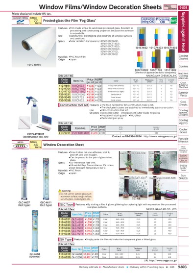 PRICESDISPLAYEDINCLUDE8%TAX.CSSTARTERKIT(CONSTRUCTIONTOOLSET)GLC-4607(GLCTYPE)GLC-4611(GLCTYPE)GH-4608(GHTYPE)101CSERIES101C1602101C71402101C71802DIFFERENCEOFAPPEARANCESDUETOTRANSPARENCY101C10002101C1702101C1802USAGEEXAMPLE(GLC-4606,9206)USAGEEXAMPLE(GLC-4611,9211)USAGEEXAMPLE(GH-4608,9208)USAGEEXAMPLE(GLC-4607,9207)NAKAGAWACHEMICALFROSTED-GLASS-LIKEFILM"FOGGLASS"CONSTRUCTIONSETTINGOKPROCESSINGOKORDERCODEITEMNO.PRICE(PERROLL)MSRP(PERROLL)COLORWXL(M)THICKNESS(MM)SPQ(ROLL)WEIGHT(KG)413-9691101C1602¥4,320¥4,000TRANSPARENTEMBOSS1.01X20.01211.5413-9704101C71402¥4,320¥4,000WHITEEMBOSS(THICK)1.01X20.01211.5413-9712101C71802¥4,320¥4,000WHITEEMBOSS(LIGHT)1.01X20.01211.5759-9331101C10002¥5,184¥4,800SANDSTRIPEA1.01X20.01211.5759-9340101C1702¥4,536¥4,200SANDBROWN1.01X20.01211.5759-9358101C1802¥4,536¥4,200SANDSMOKE1.01X20.01211.5ORDERCODEITEMNO.PRICE(PERSET)MSRP(PERSET)SPQ(SET)WEIGHT(G/SET)413-9721CSSTARTERKIT¥3,218¥2,9801300CONTACTUS:03-6386-3834HTTP://WWW.NAKAGAWA.CO.JP/MEIWAWINDOWDECORATIONSHEETORDERCODEITEMNO.PRICE(PERPIECE)MSRP(PERPIECE)COLORWXL(MM)THICKNESS(MM)SPQ(PIECE)WEIGHT(G)819-6019GH-4608¥1,274¥1,400CLEAR460X9000.2535200819-6020GH-9208¥2,462¥2,700CLEAR920X9000.2535400ORDERCODEITEMNO.PRICE(PERPIECE)MSRP(PERPIECE)COLORWXL(MM)THICKNESS(MM)SPQ(PIECE)WEIGHT(G)819-6021GLC-4606¥1,598¥1,700CLEAR460X9000.2535200819-6022GLC-4607¥1,598¥1,700CLEAR460X9000.2535200819-6023GLC-4611¥1,598¥1,700CLEAR460X9000.2535200819-6024GLC-9206¥2,462¥2,600CLEAR920X9000.2535400819-6025GLC-9207¥2,462¥2,600CLEAR920X9000.2535400819-6026GLC-9211¥2,462¥2,600CLEAR920X9000.2535400URLHTTP://WWW.MGGN.CO.JP/STOCK45ITEMSSTOCK77ITEMSORDERUNIT:1PIECEMEIWAGRAVURECO.,LTD.ORDERUNIT:1PIECEORDERUNIT:1SETORDERUNIT:1ROLLNAKAGAWACHEMICAL,INCFEATURES●THETOOLSNEEDEDFORFILMCONSTRUCTIONMAKEASET.●THEDEDICATEDCUTTERSAREATTACHEDTOIMMEDIATELYSTARTCONSTRUCTION.USE●FILMCONSTRUCTIONTOOLSET.SETCONTENTS●DEDICATEDCUTTER●REPLACEMENTCUTTERBLADE10PIECES●PRESTA(WITHCLOTHGUARD)●MICROFIBER●DEDICATEDGUNSPRAYCONSTRUCTIONTOOLSETFEATURES●SINCEITDOESNOTUSEADHESIVE,STICKIT,PEELOFF,ANDSTICKITAGAIN.●CANBEPASTEDTOTHEPAIROFGLASS/WIREDGLASS.SPECS●UVPREVENTIONRATE99%●ULTRAVIOLETRAYSTRANSMITTANCE:1%ORLESS●HEATRESISTANTTEMPERATURE:60°CMATERIALS●PVCRESINORIGIN●JAPANGLCTYPEGHTYPE●DONOTUSEFORSPECIALGLASSSUCHASUNEVENSURFACE,ROUGHSURFACE,SECURITYGLASS,COATEDGLASS,ETC.WARNINGFEATURES●BYSTICKINGAFILM,ITGLOWSGLITTERINGBYCAPTURINGLIGHTWITHEXPRESSIONSLIKEPROCESSEDREALGLASSPATTERNS.FEATURES●SIMPLYPASTETHEFILMANDMAKETHETRANSPARENTGLASSAFRITTEDGLASS.FEATURES●FILMMADESIMILARTOSAND-BLAST-PROCESSEDGLASS.EXCELLENTINPROCESSINGANDCONSTRUCTINGPROPERTIESBECAUSETHEADHESIVEISRE-PEELABLE.USE●OPTIMUMFORBLINDFOLDINGANDDESIGNINGOFWINDOWSURFACESANDPARTITIONS.SPECS●SOLARRADIATIONTRANSPARENCY:81%(101C1602),41%(101C71402),67%(101C71802),83%(101C10002),52%(101C1702),51%(101C1802)MATERIALS●PVCRESINFILMORIGIN●JAPANSUPPLIESAGAINSTHEATCOOLINGCLOTHESCOOLERSHEAD/NECKCOOLINGMATERIALSCOOLFEELINGCLOTHESSUMMERVESTSCOOLSHEETSCOOLINGSPRAYS,COOLANTSCOOLINGAGENTSCOOLERBOXESPORTABLEREFRIGERATORSHEATSTROKEMEASURESSUPPLIESSHADING/THERMALINSULATIONFILMSFORWINDOWSHIELDINGSUNLIGHTSHEETS,PAINTSSUNSHIELDSWINDOWFILMS/WINDOWDECORATIONSHEETSSTOCK86ITEMS9-803*0522110*9-803DELIVERYESTIMATE★…MANUFACTURERSTOCK★…DELIVERYWITHIN7WORKINGDAYS★…ASK
