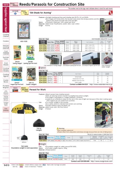 THENUMBERNEXTTOTHELOGOMARKINDICATESITEMSINSTOCKFOREACHBRAND.EXAMPLEASS-1020OH-01(SWINGHANGER)OH-06(PASTINGTYPEFREEHOOK)OH-07(MAGNETTYPEFREEHOOK)OH-13(WATERWEIGHT)TSP-2400(FOUNDATIONWEIGHTISSOLDSEPARATELY)1700MMHEIGHT420MM420MMTSP-W(WEIGHT)EXAMPLEUSEEXAMPLEOFSWINGHANGERUSEEXAMPLEOFPASTINGTYPEFREEHOOKUSEEXAMPLEOFWATERWEIGHTUSEEXAMPLEOFMAGNETICTYPEFREEHOOKWATANABE"SLITSHADEFORAWNING"STOCK179ITEMSORDERUNIT:1SHEETWATANABEINDUSTRYCO.LTD.ORDERCODEITEMNO.PRICE(PERSHEET)MSRP(PERSHEET)COLORWXL(MM)SETCONTENTSSPQ(SHEET)WEIGHT(G)834-5587ASS-1020¥1,607-BROWN1000X2000WITH1ROPEOF3M12450834-5588ASS-2020¥2,812-BROWN2000X2000WITH2ROPESOF3M7900834-5589ASS-2024¥3,315-BROWN2000X2400WITH2ROPESOF3M61050834-5590ASS-2030¥4,018-BROWN2000X3000WITH2ROPESOF3M51350TRUSCOPARASOLFORWORKSTOCK38,650ITEMSORDERUNIT:1PIECEORDERCODEITEMNO.PRICE(PERPIECE)MSRP(PERPIECE)COLORWIDTH(MM)DEPTH(MM)CAPACITY(L)SPQ(PIECE)WEIGHT(KG)836-6955TSP-W¥3,703¥4,000BLACK4204202511.5CONTACTUS:0120-509-849HTTP://WWW.ORANGE-BOOK.COM/ORDERUNIT:1PIECETRUSCONAKAYAMACORPORATIONORDERCODEITEMNO.PRICE(PERPIECE)MSRP(PERPIECE)COLORHEIGHT(MM)OPENEDUMBRELLADIAMETER(MM)CURTAINPART(MM)SPQ(PIECE)WEIGHT(KG)836-6954TSP-2400¥10,183¥11,000YELLOW/BLACK2270,2400(2STAGESADJUSTMENT)170015013.5ORDERUNIT:1SETORDERCODEITEMNO.PRICE(PERSET)MSRP(PERSET)ITEMNAMESPQ(SET)WEIGHT(G/SET)834-5591OH-01¥501-SWINGHANGER3074834-5592OH-06¥381-PASTINGTYPEFREEHOOK3045834-5593OH-07¥903-MAGNETICTYPEFREEHOOK3070834-5594OH-13¥663-WATERWEIGHT30150CONTACTUS:0866-94-0221HTTP://WWW.WATANABE-IND.CO.JP/FEATURES●SUNLIGHTSHADINGPART(TOPPART)SHADINGRATE99.7%,UVCUT99.8%.●BY4STAGESSLITCONSTRUCTION,THETOPPARTSHUTSDOWNTHESTRONGSUNSHINEANDTHEBOTTOMPARTPASSESTHROUGHBOTHWINDANDLIGHT.SPECS●THICKNESS:SHEETPART1MM,EYELETPART4MMMATERIALS●MAINBODY:POLYETHYLENE,EYELET:STEEL,ROPE:COTTONORIGIN●CHINAOPTIONFEATURES●BEACHPARASOLTYPESHADINGPARASOL.●AIMSATREDUCINGWORKER'SBURDENBYSHADINGFROMDIRECTSUNLIGHT.●THEHEIGHTISADJUSTABLEIN2STAGES(2400MM,2270MM).●USABLEASANUMBRELLATOKEEPOUTTHERAININTHECASEOFLIGHTRAINBECAUSEOFTHESILVERCOATINGSPECS(*THEORIGINALUSEISTOSHADEFROMSUNSHINE).USE●TOCOUNTERSUNLIGHTINTHESUMMER.●ASASAFETYARTICLETOINDICATETHATWORKERSAREWORKING.SPECS●DOUBLESKELETONSPECS(DURABILITYUP)MATERIALS●MAINBODYCLOTH:20TPOLYOXFORDORIGIN●TAIWANUSE●FOUNDATIONWEIGHTFORSAFETYPARASOLTSP-2400.SPECS●FULLWATERWEIGHT:APPROX.25KGMATERIALS●POLYPROPYLENEWEIGHT●NOTCOMPLETEWATERPROOF.●PLEASEREFRAINFROMUSINGWHEREWINDBLOWSSTRONGLYBECAUSETHEREARERISKSOFFALLINGDOWN.WARNINGSUPPLIESAGAINSTHEATCOOLINGCLOTHESCOOLERSHEAD/NECKCOOLINGMATERIALSCOOLFEELINGCLOTHESSUMMERVESTSCOOLSHEETSCOOLINGSPRAYS,COOLANTSCOOLINGAGENTSCOOLERBOXESPORTABLEREFRIGERATORSHEATSTROKEMEASURESSUPPLIESSHADING/THERMALINSULATIONFILMSFORWINDOWSHIELDINGSUNLIGHTSHEETS,PAINTSSUNSHIELDSSTOCK69ITEMSREEDS/PARASOLSFORCONSTRUCTIONSITE9-810*C091007*9-810ORDERCODEYELLOW…INSTANTDELIVERY(JAPANONLY)BLUE…BACKORDER(CARRIAGEEXCLUDED)ITEMNO.PINK…STOCKININDONESIA/THAILAND